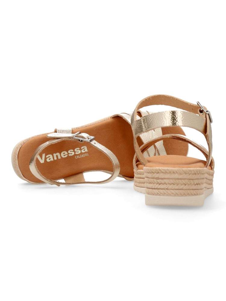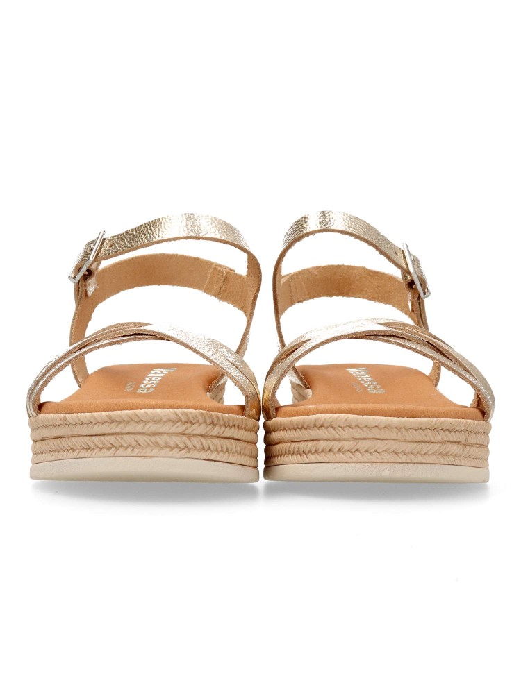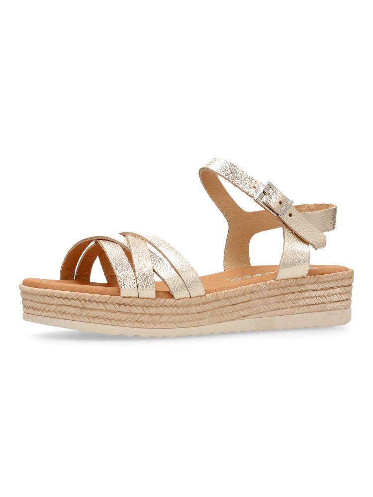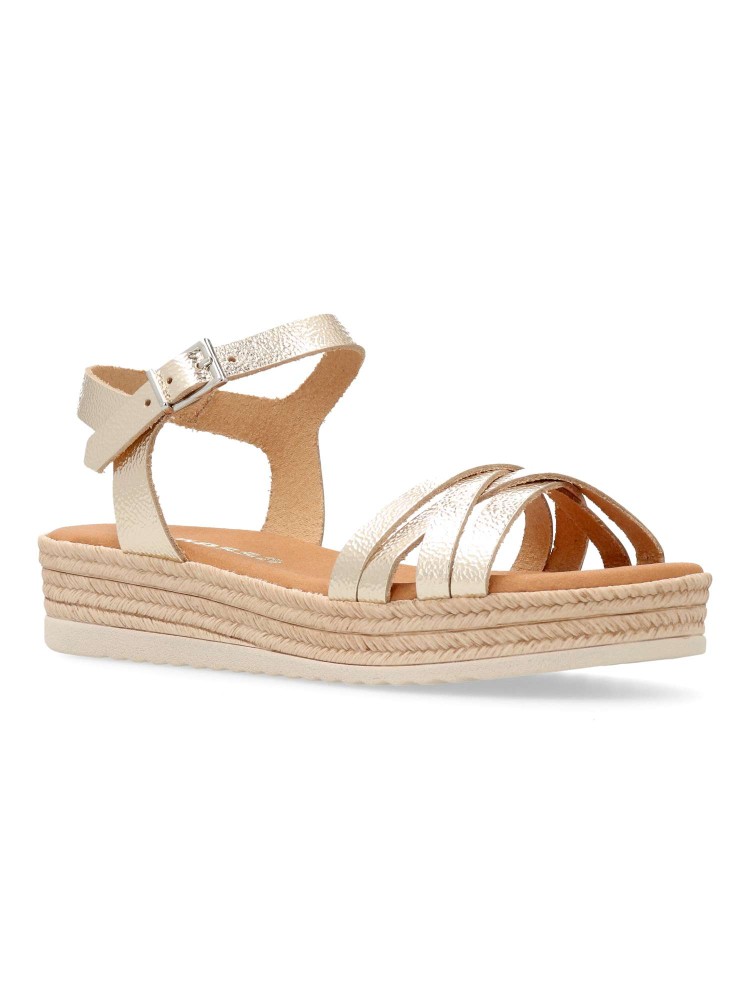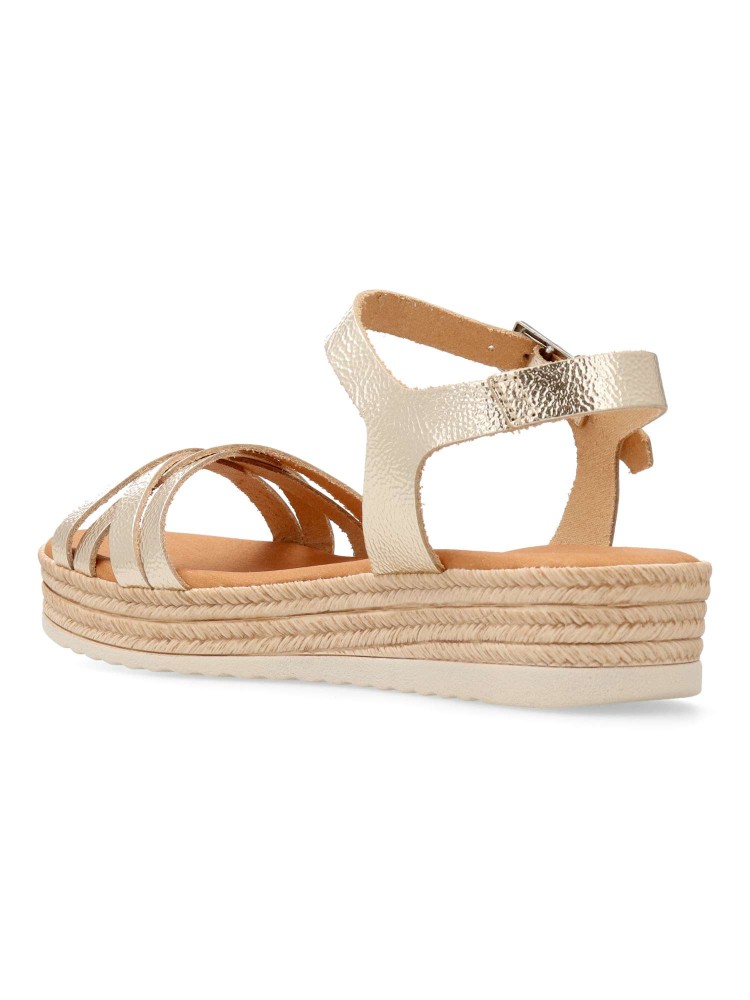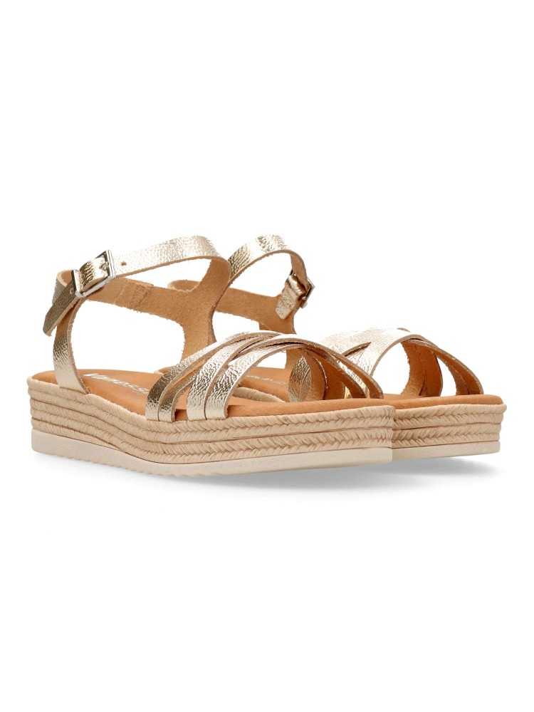 Sandalia cómoda con tiras cruzadas. Fabricada en piel metalizada. Cierre de hebilla. Altura 4 cm. Forros y plantillas 100% transpirables. Planta acolchada. Plataforma efecto yute. Agradable sensación de confort y bienestar. Hecho en España.