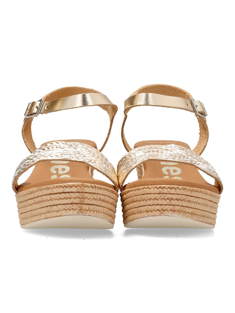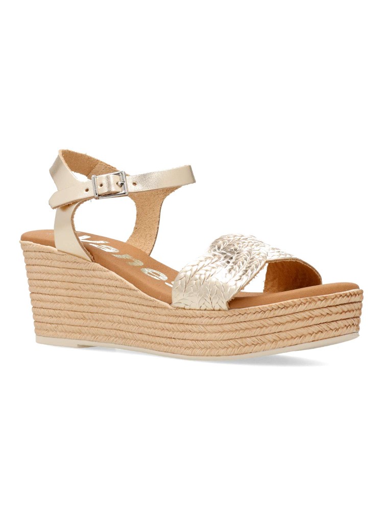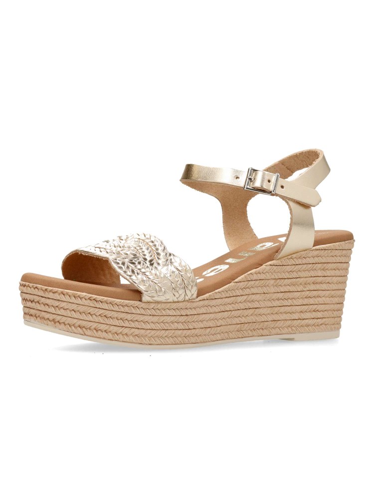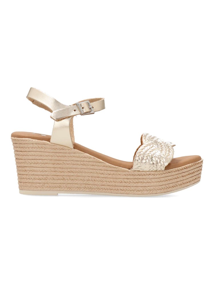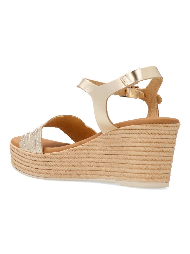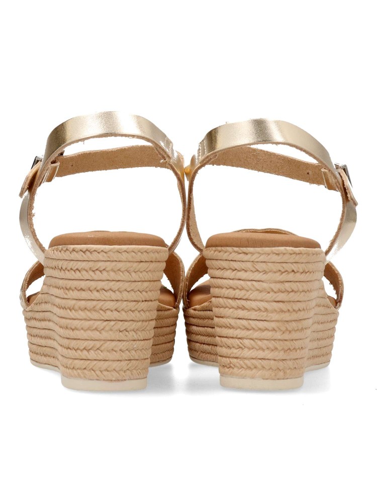 Sandalia cómoda de mujer. Fabricada en piel matalizada, con suela de goma. Cierre de hebilla. Cuña efecto yute de 7 cm. Forros y plantillas 100% transpirables. Planta acolchada. Agradable sensación de confort y bienestar. Color champán. Hecho en España.