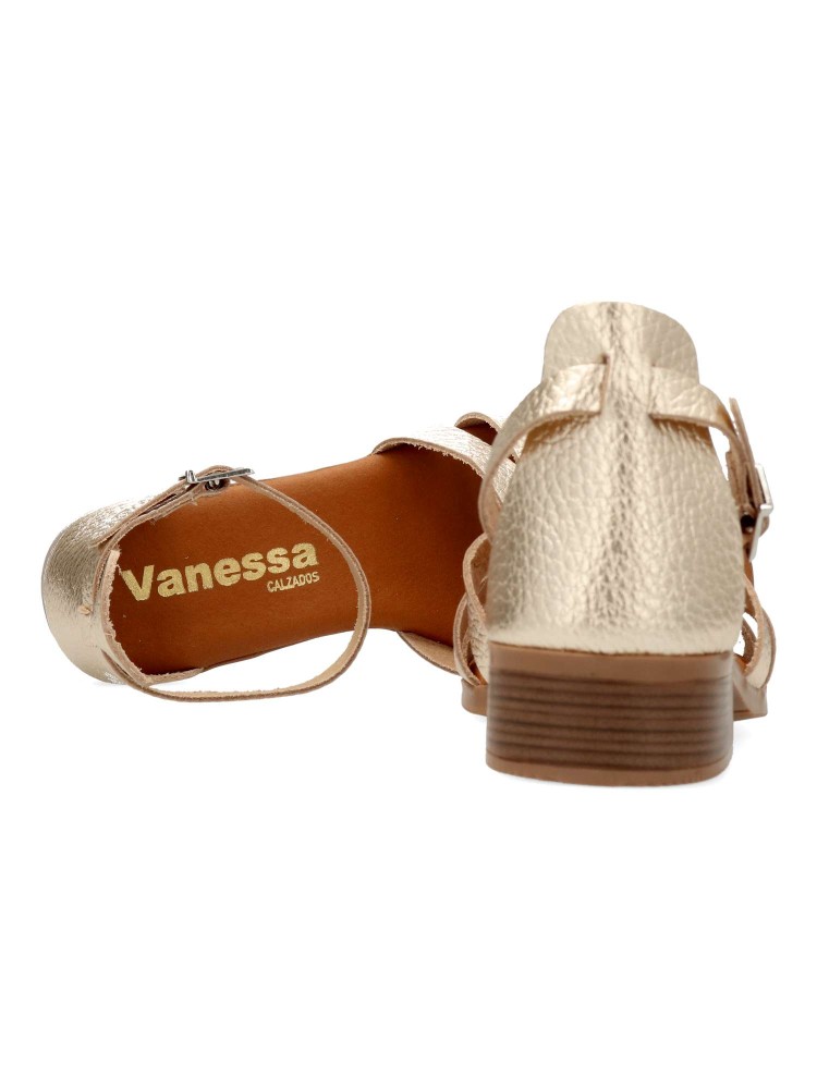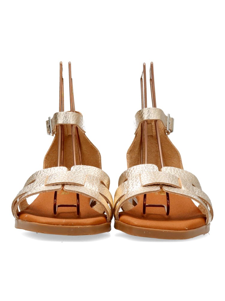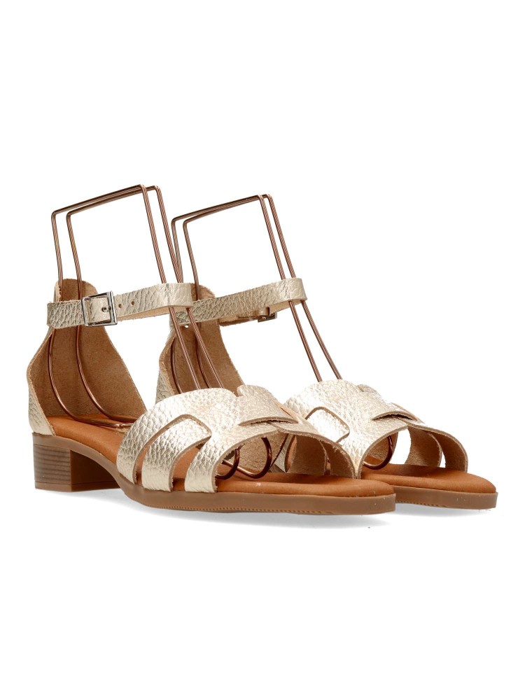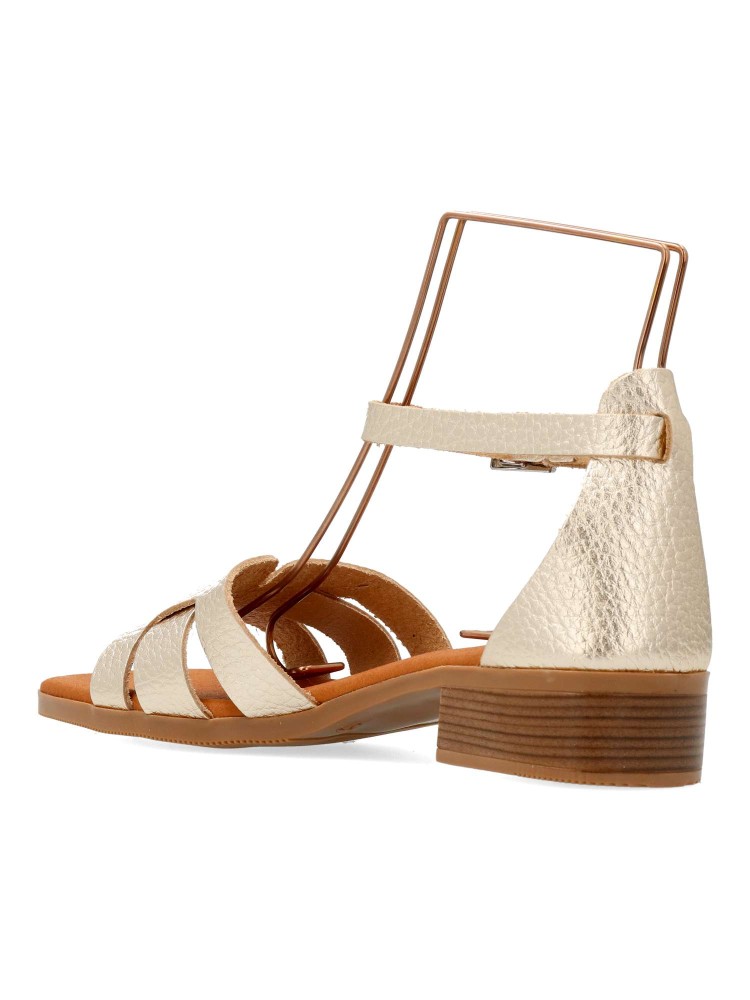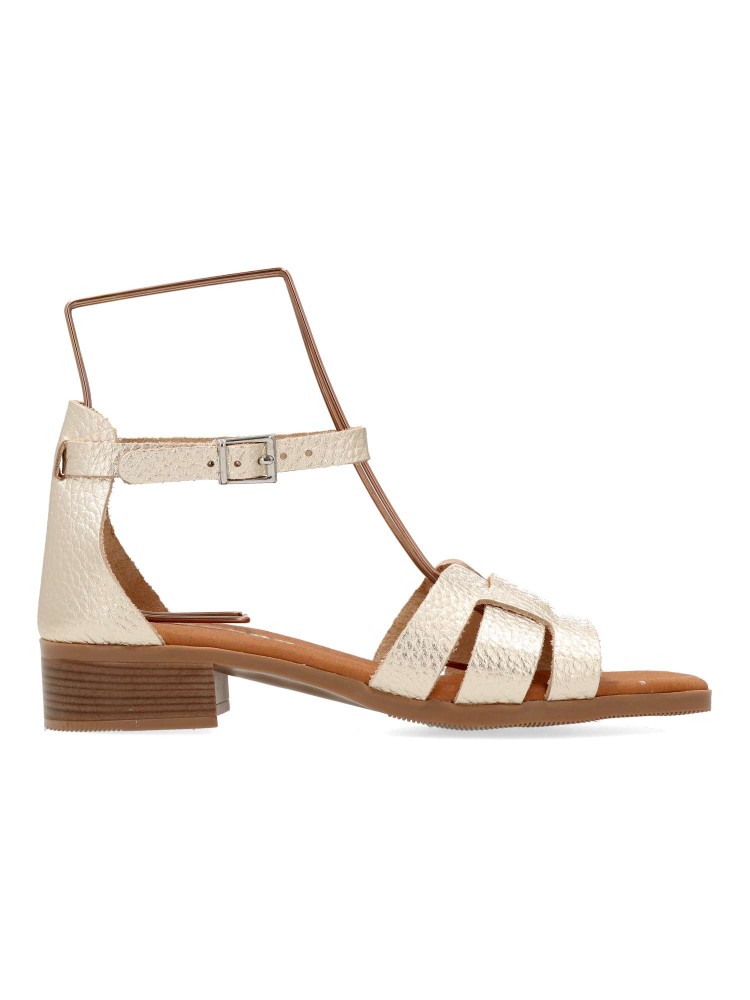 Sandalia cómoda de pala con tira al tobillo y cierre de hebilla . Fabricado en piel color champán, con suela de goma flexible. Forros y plantillas 100% transpirables. Planta acolchada. Ideal para combinar con tus outfits de verano. Hecho en España.