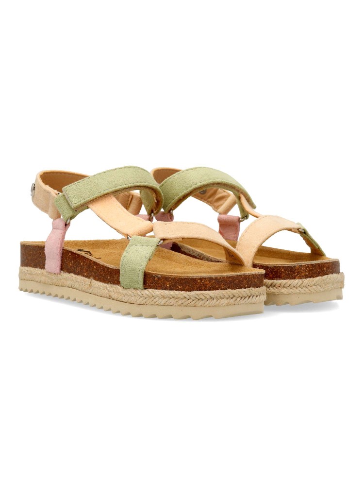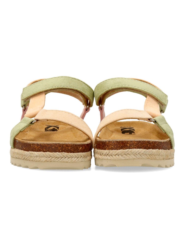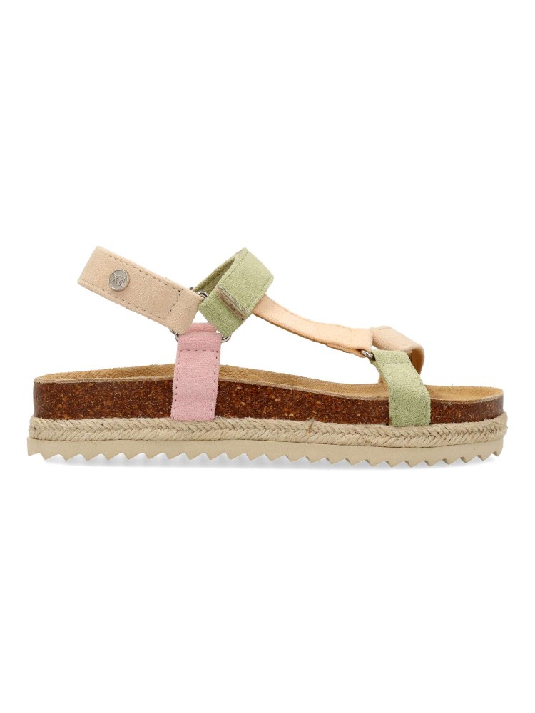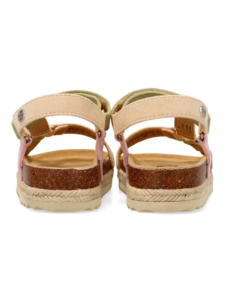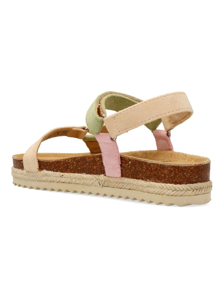Sandalia de niña tipo bio. Cierre de tira adherente. Modelo cómodo, fabricado en material antelina multicolor, con suela de goma antideslizante y tira de yute trenzado. Una sandalia muy versátil, ideal con tus outfits de temporada.