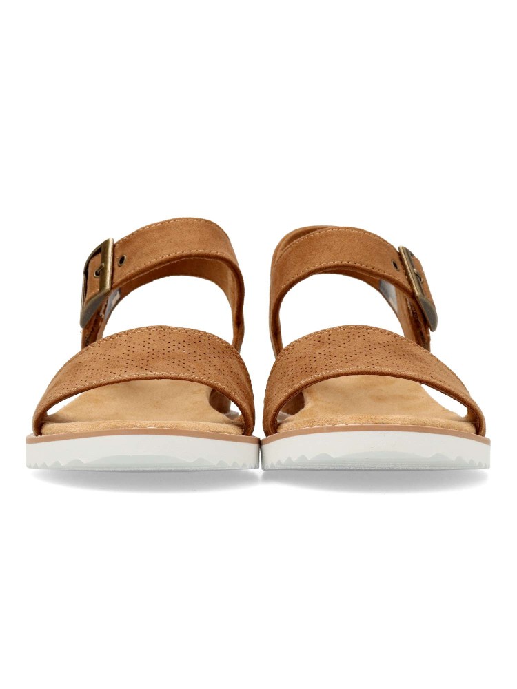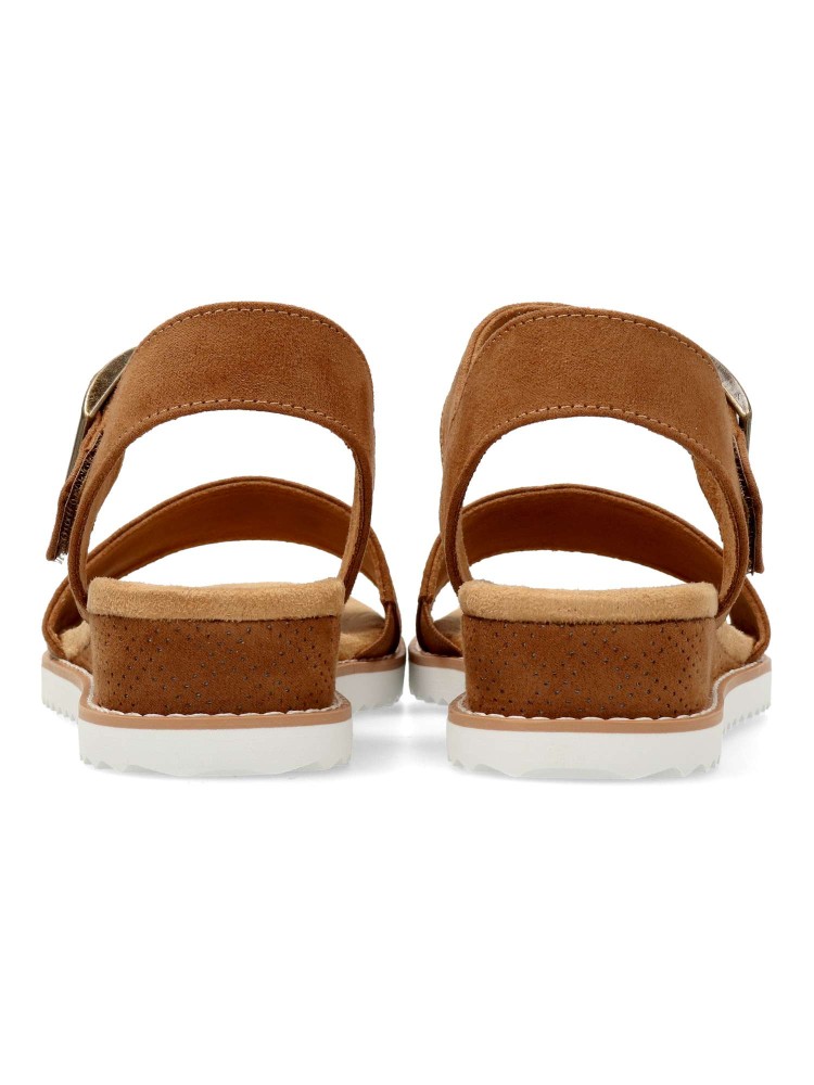 Moderna sandalia vegana de cuña, que cuenta con una parte superior de textil antelina, una tira en el empeine con hebilla metálica y una plantilla Skechers Memory Foam™ con amortiguación. Ideal para la temporada veraniega.