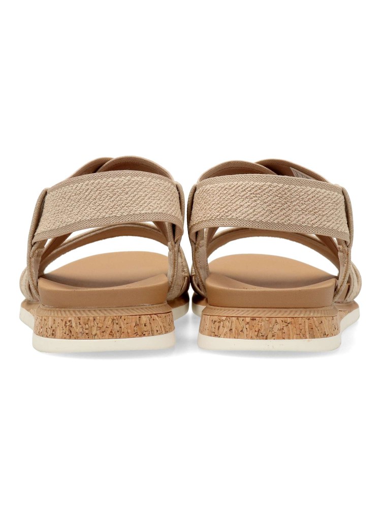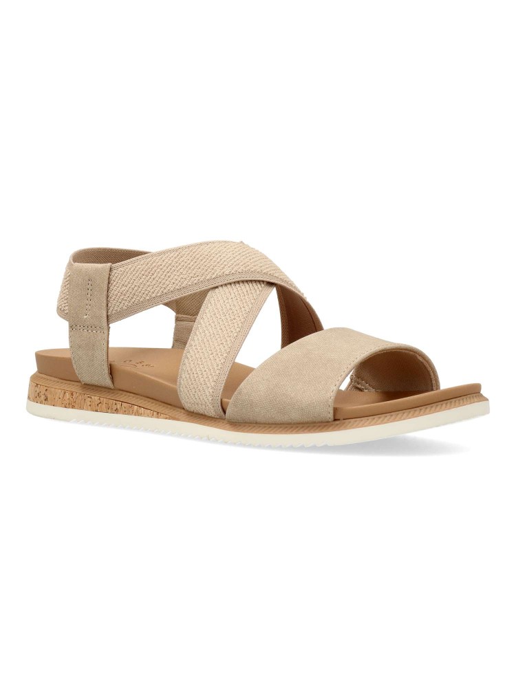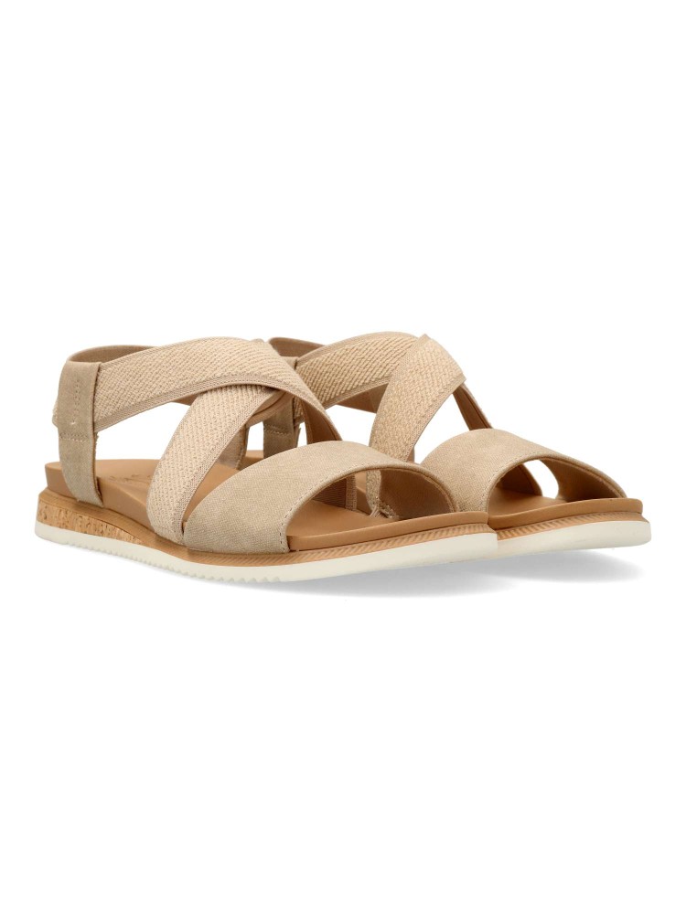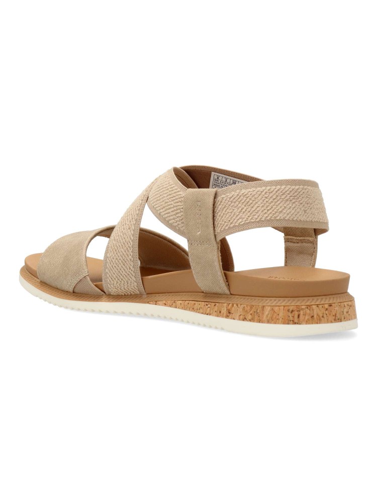Sandalia de estilo casual, con parte superior de tela y tiras reforzadas en el empeine, ribete de corcho en la media suela y una plantilla con amortiguación Skechers Plush Foam®. Ideal para la temporada veraniega.