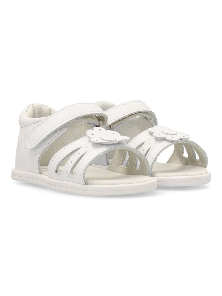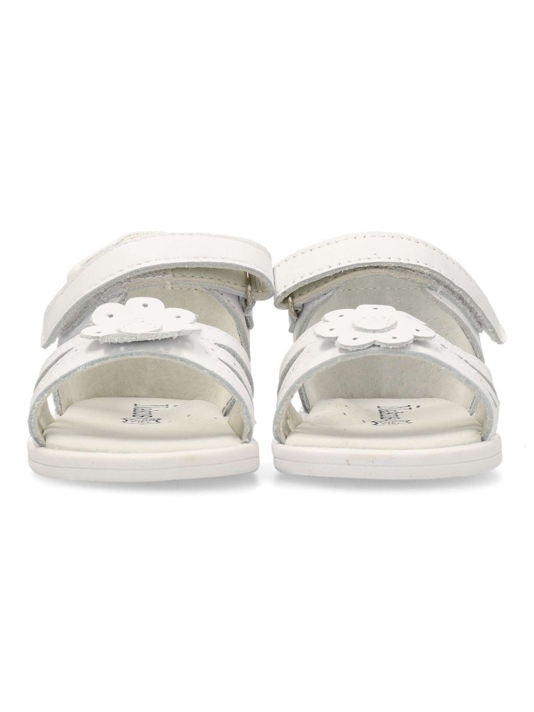 Sandalia de vestir cómoda, para niña. Cierre de hebilla al tobillo. Fabricado en piel con suela de goma flexible. Forro interior y planta de piel. Color blanco con detalle de flor. Ideal para conjuntarlas con faldas, conjuntos y vestidos.