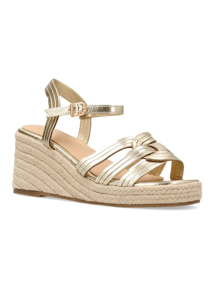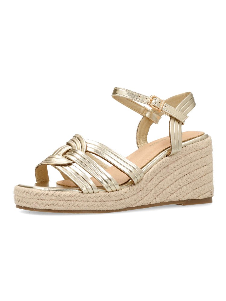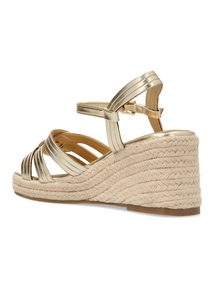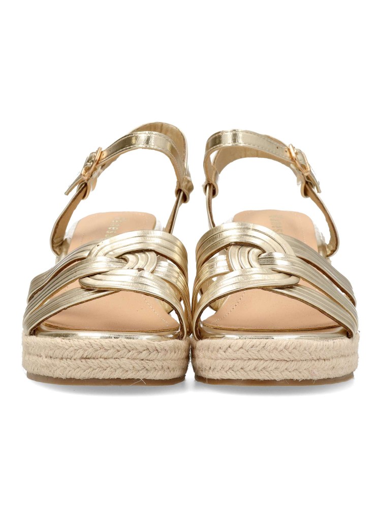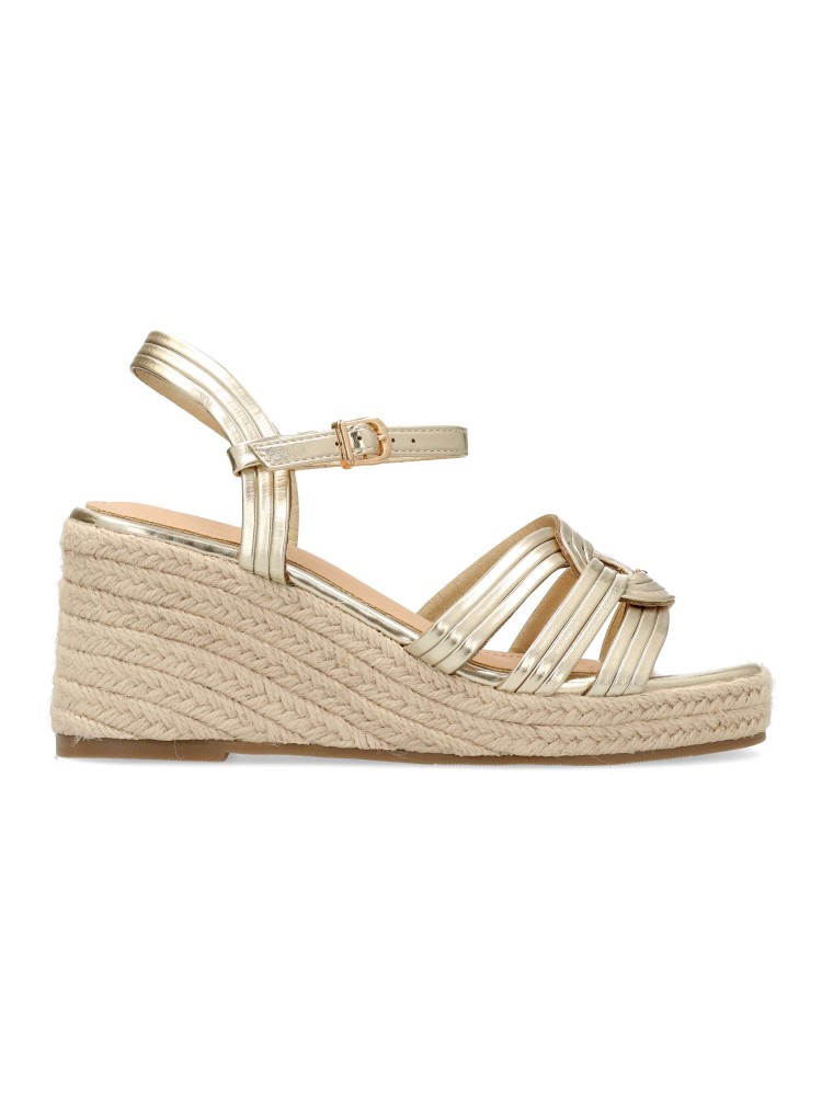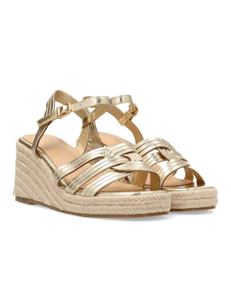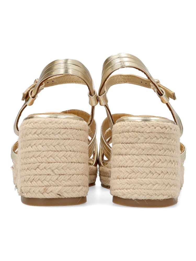 Sandalia cómoda de mujer, con pala de tiras cruzadas. Fabricada en piel sintética metalizada, con suela de yute sobre goma. Planta acolchada. Cuña de 7 cm. de altura. Color oro. Una alpargata versátil, ideal con tus outfits de verano.