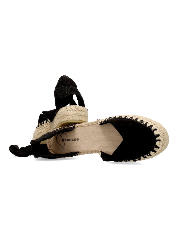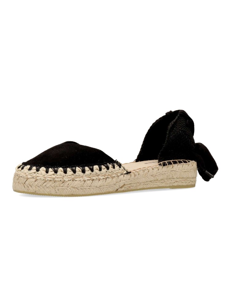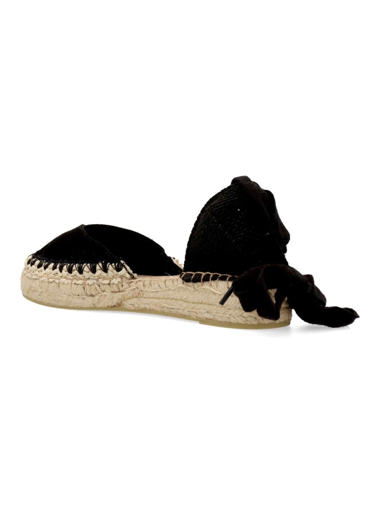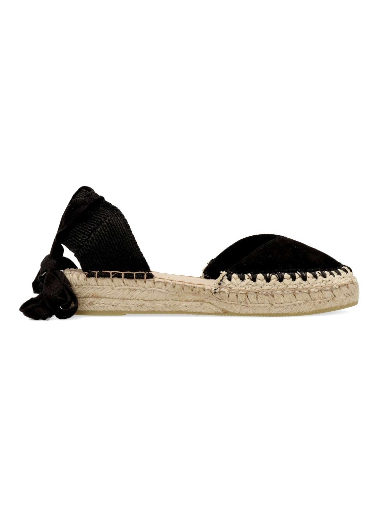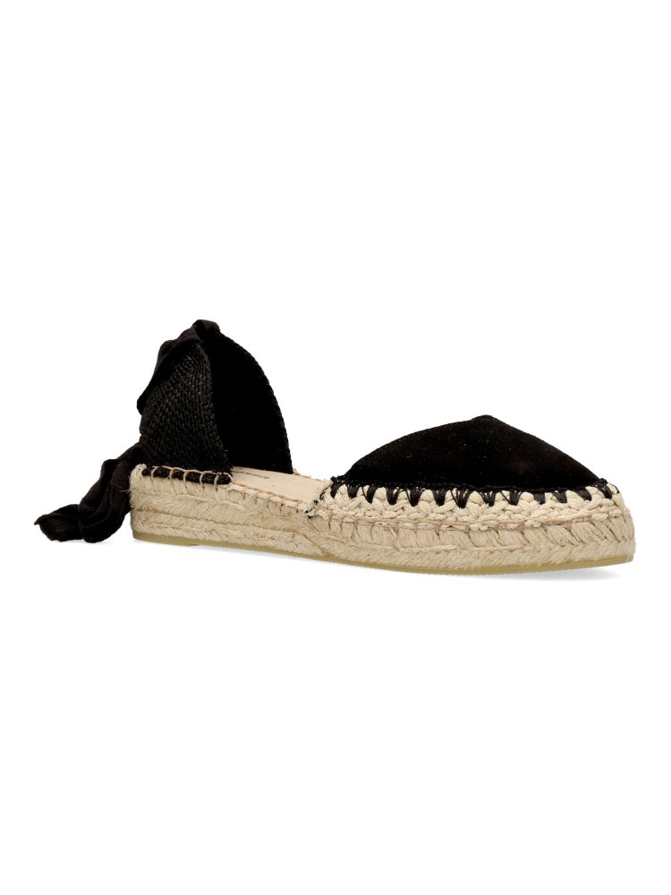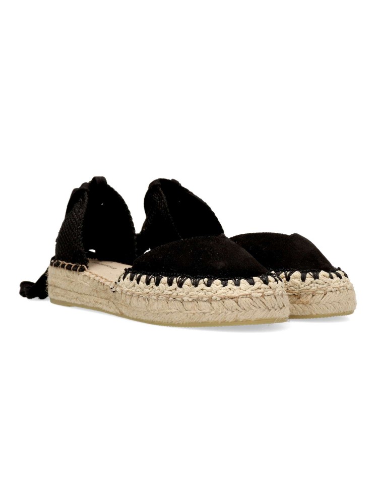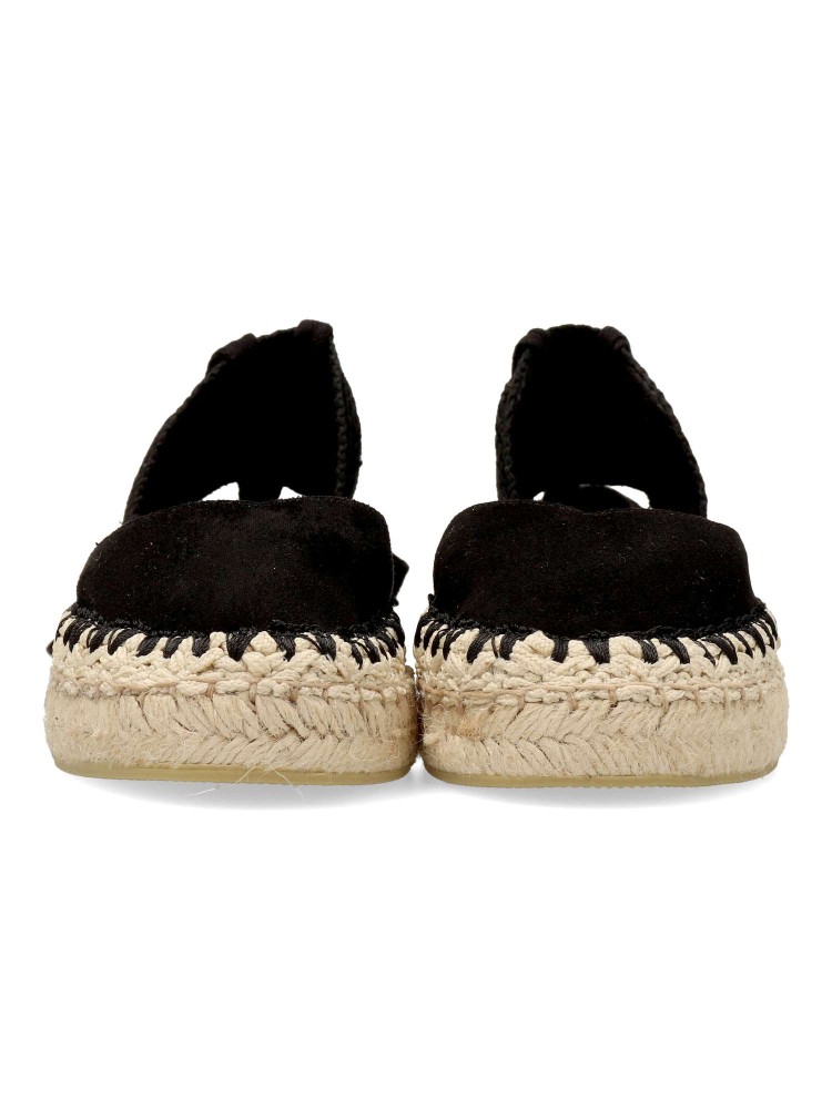 Sandalia esparteña plana de mujer. Cierre de cintas al tobillo. Alpargata fabricada en material textil antelina, con suela de yute sobre goma. Planta acolchada. Color negro. Una sandalia clásica veraniega, fácil de combinar con todos tus outfits.