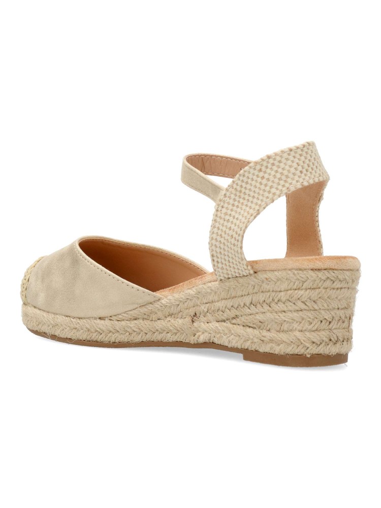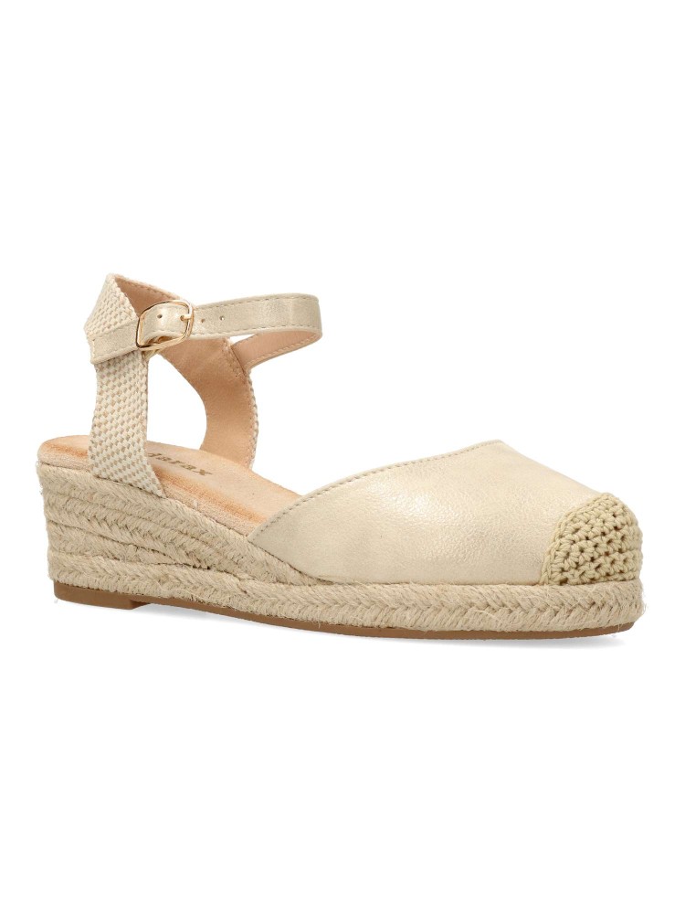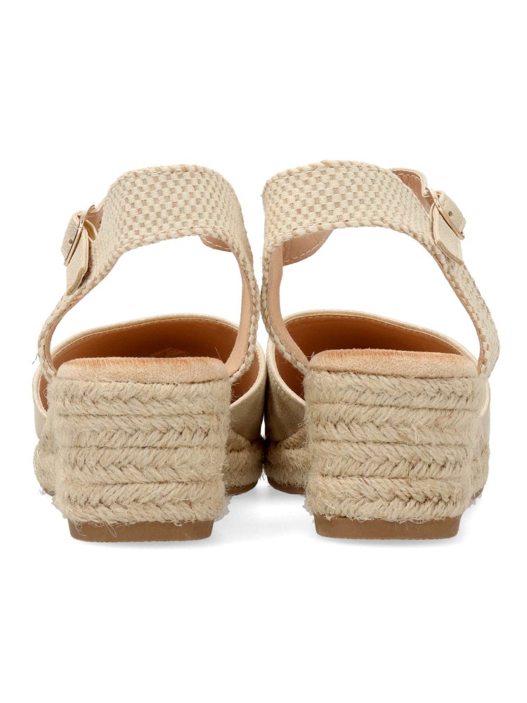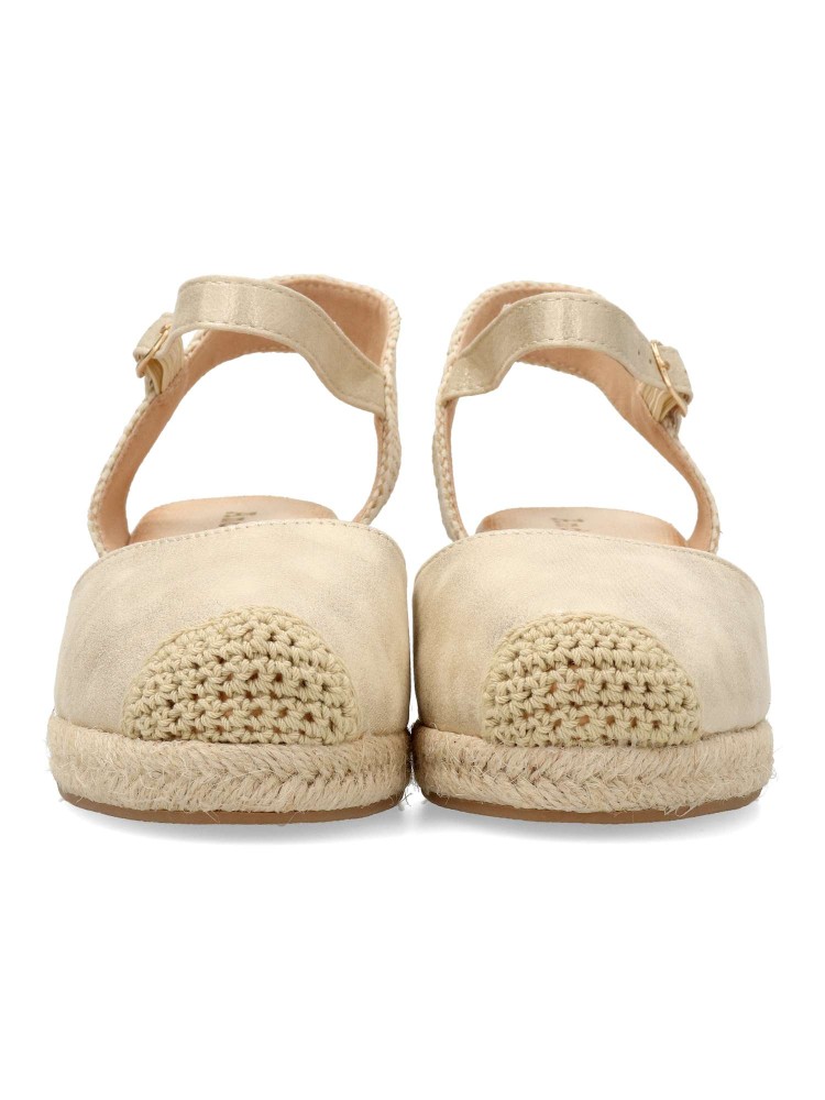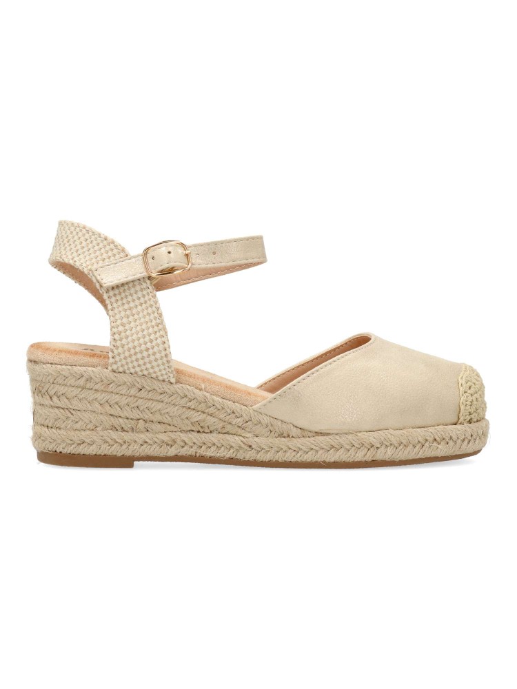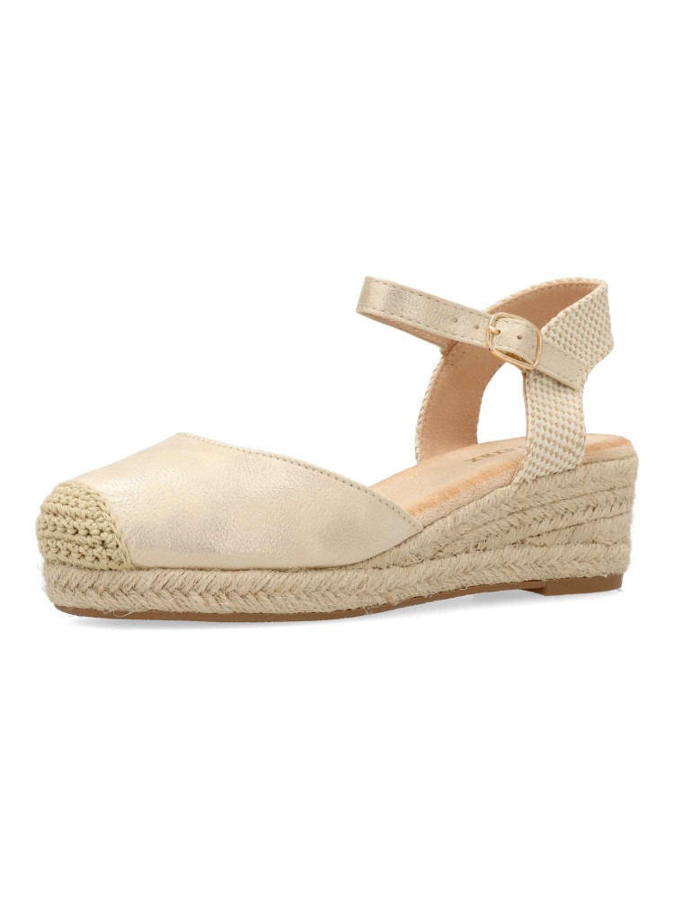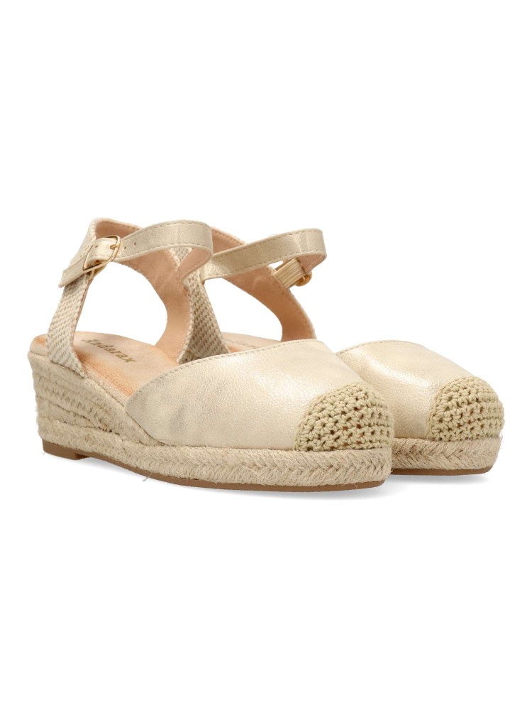 Sandalia valenciana de mujer, con cierre de hebilla. Alpargata cómoda, fabricada en piel sintética, con suela de yute sobre goma. Planta acolchada. Color oro. Pequeña cuña de 5 cm. Máximo confort en esta sandalia de esparto ideal en tu día a día.