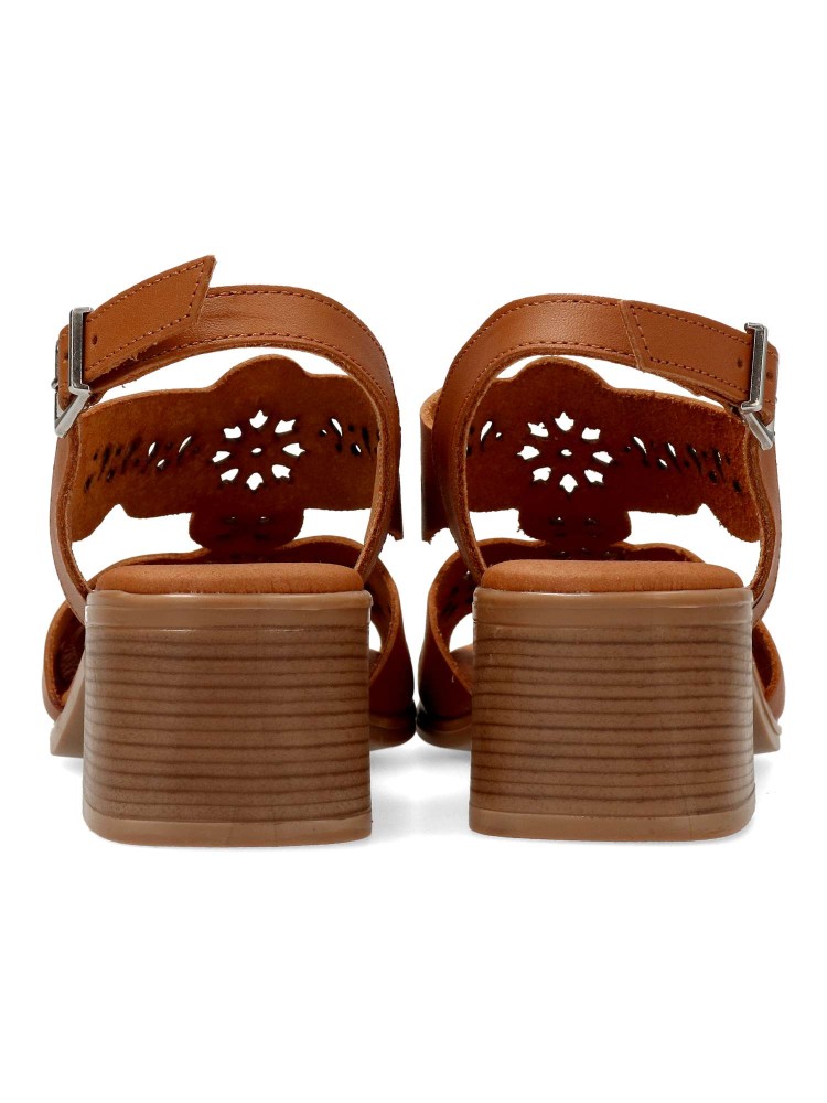 Sandalia cómoda de mujer, con cierre de hebilla. Modelo de tiras fabricado en piel troquelada, con suela de goma. Planta acolchada. Color roble. Tacón ancho efecto madera de 5 cm. de altura. Diseño y confort para tu pies. Hecho en España.