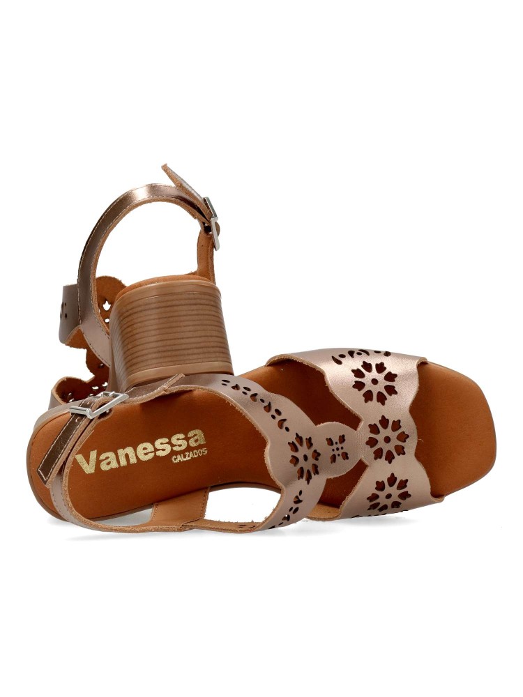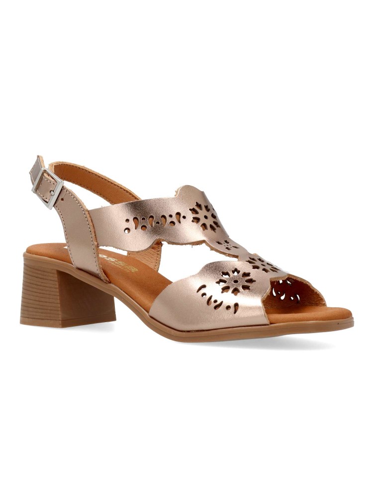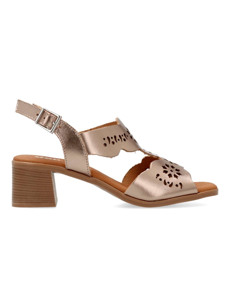 Sandalia cómoda de mujer, con cierre de hebilla. Modelo de tiras fabricado en piel troquelada, con suela de goma. Planta acolchada. Color cava. Tacón ancho efecto madera de 5 cm. de altura. Diseño y confort para tu pies. Hecho en España.