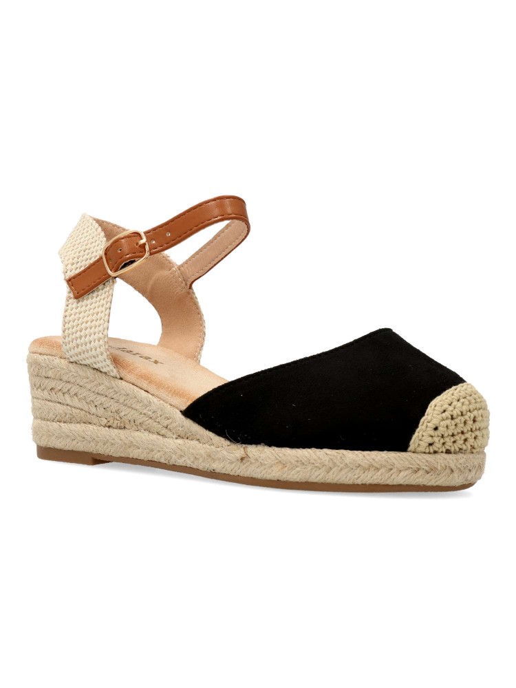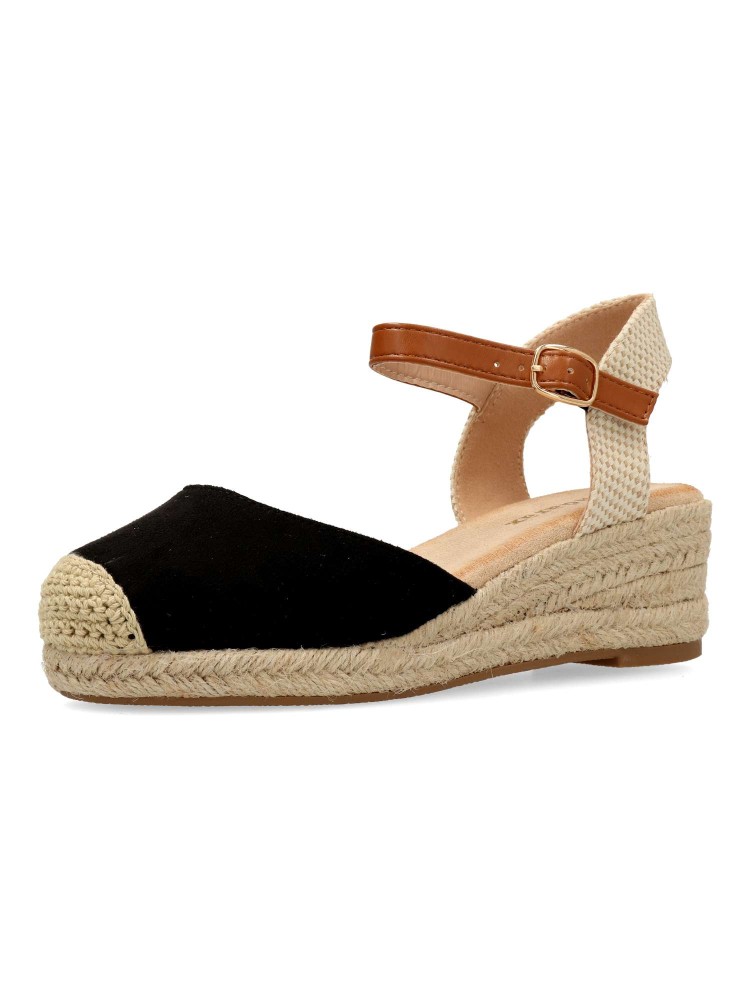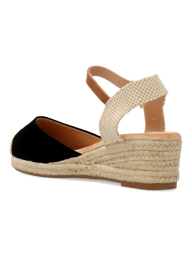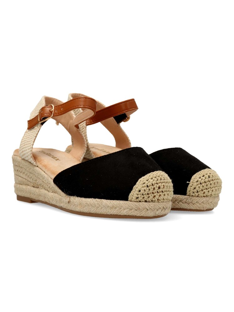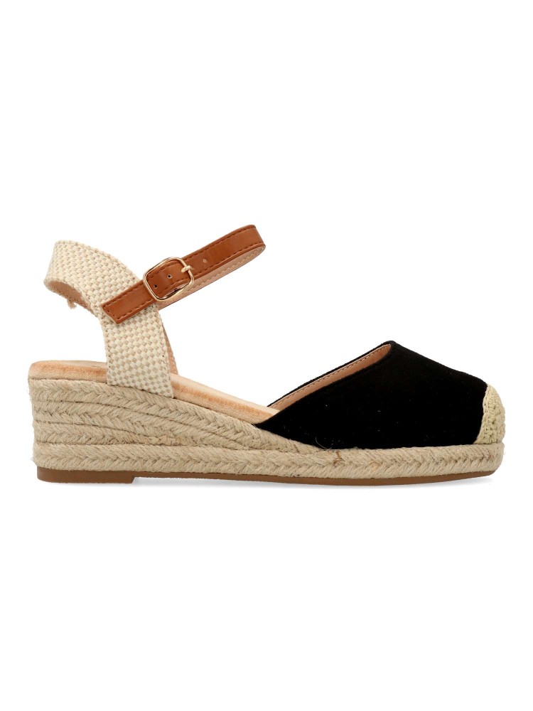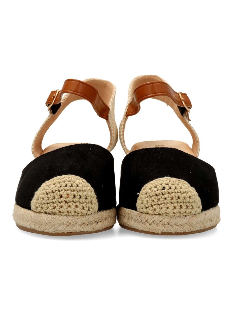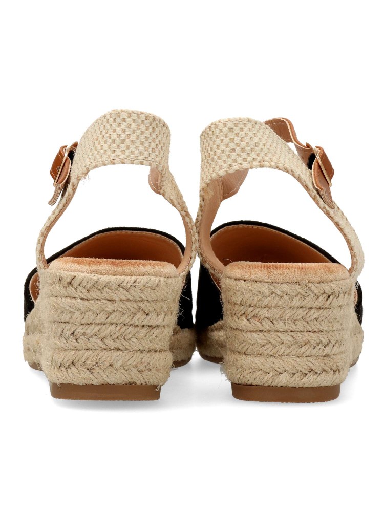 Sandalia valenciana de mujer, con cierre de hebilla. Alpargata cómoda, fabricada en piel sintética, con suela de yute sobre goma. Planta acolchada. Color negro. Pequeña cuña de 5 cm. Máximo confort en esta sandalia de esparto ideal en tu día a día.