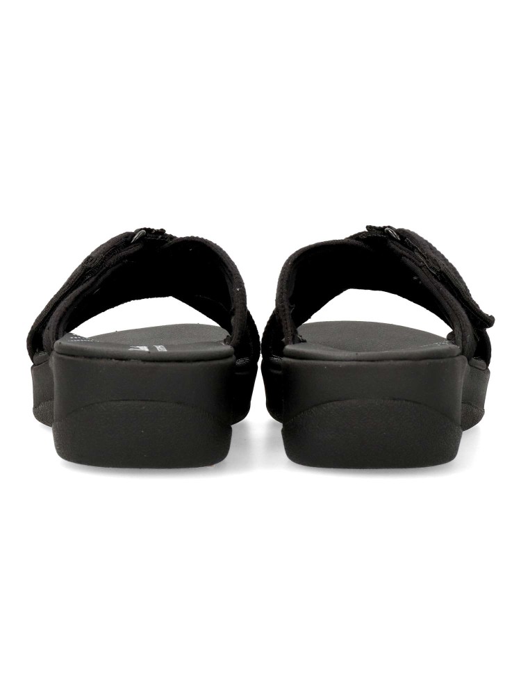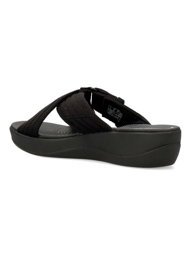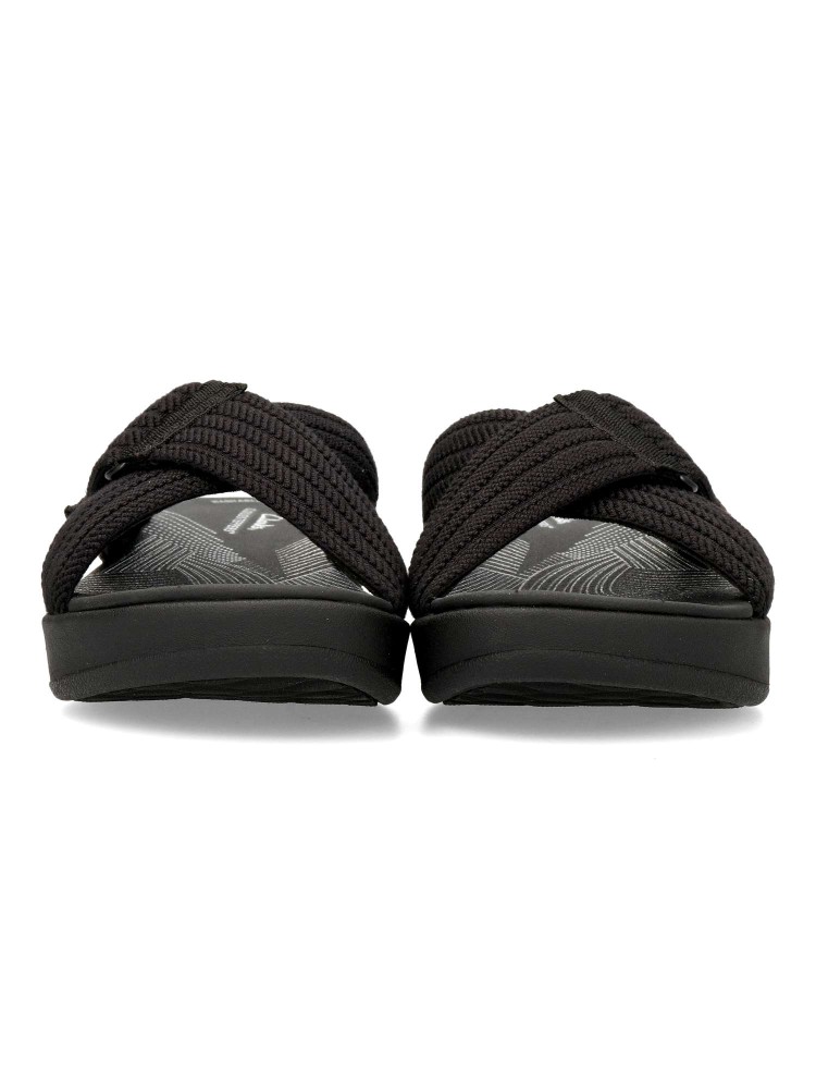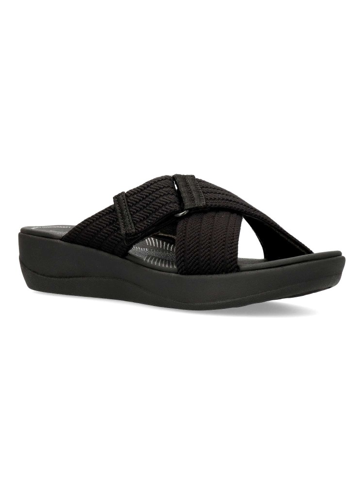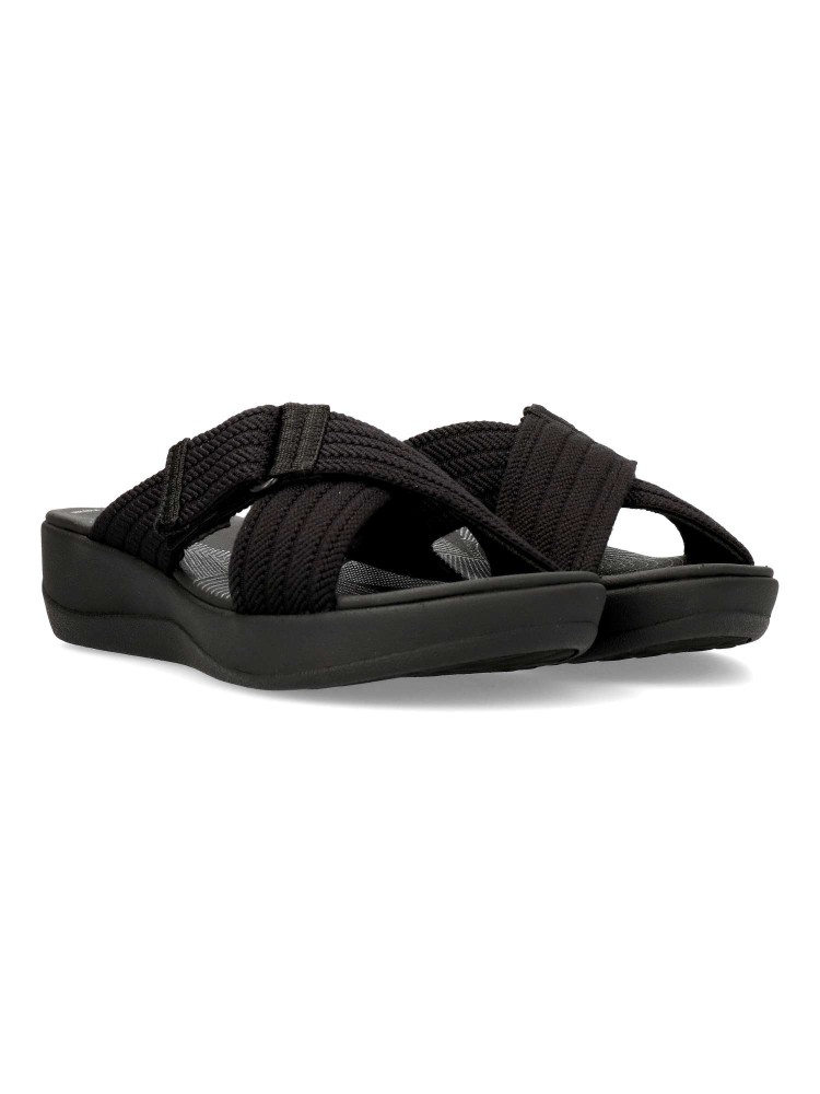 Sandalia con pala de tiras cruzadas. Modelo tipo zueco, fabricado en textil suave, con suela de goma. Plantilla de espuma Cushion Soft™, comodidad duradera. Color negro. Cuña de 4 cm. Lavable a maquina. La mejor alternativa a ir descalzo este verano.