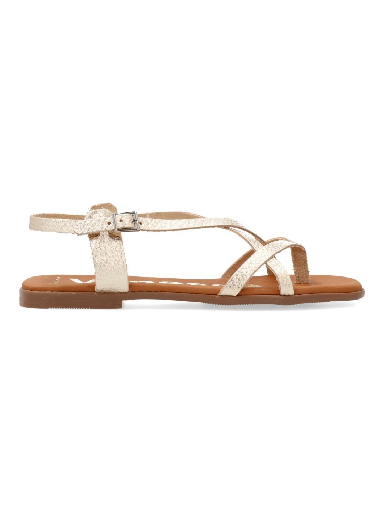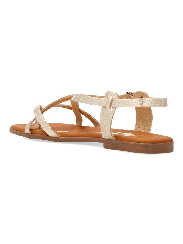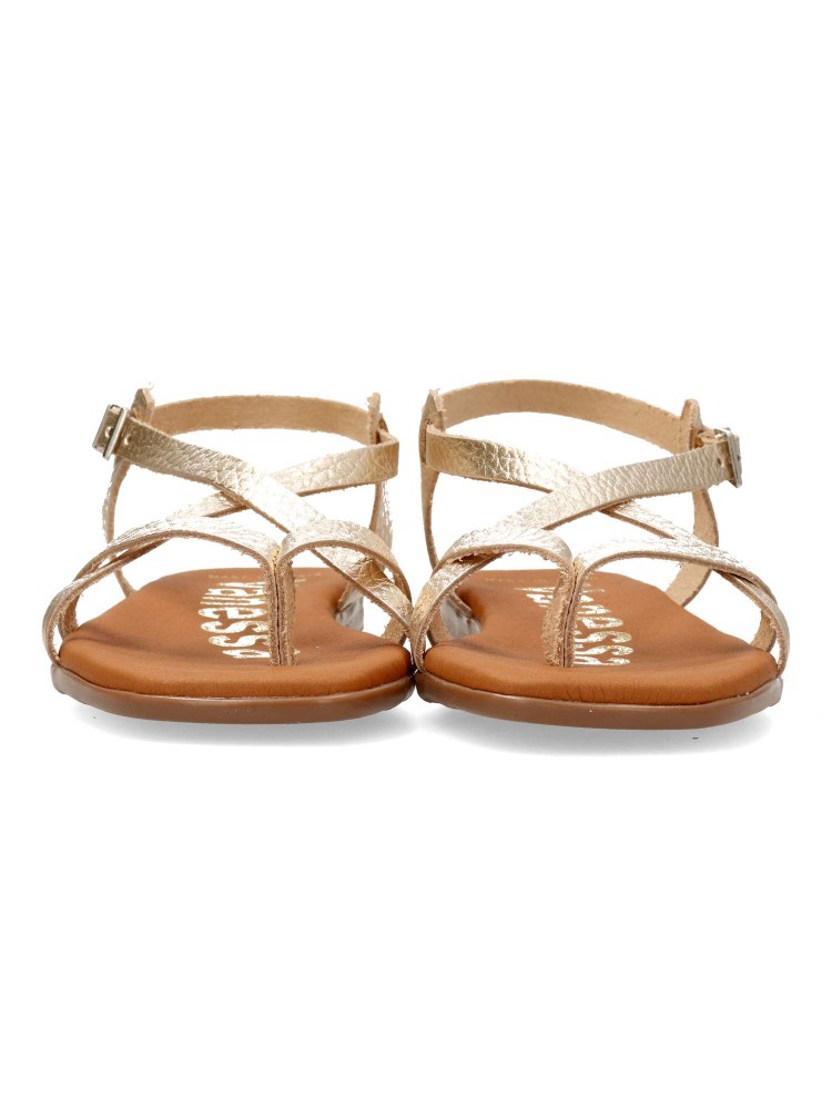 Sandalia cómoda de tiras, para mujer. Fabricado en piel metalizada, con suela de goma. Cierre de hebilla al tobillo. Forros y plantillas 100% transpirables. Planta acolchada. Agradable sensación de confort y bienestar. Color champán. Hecho en España.