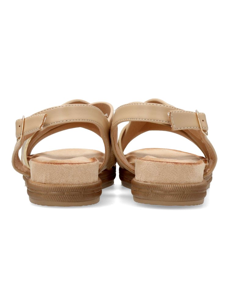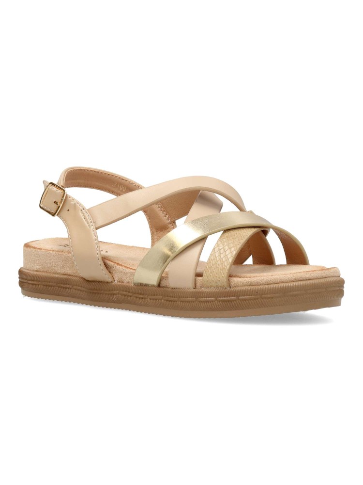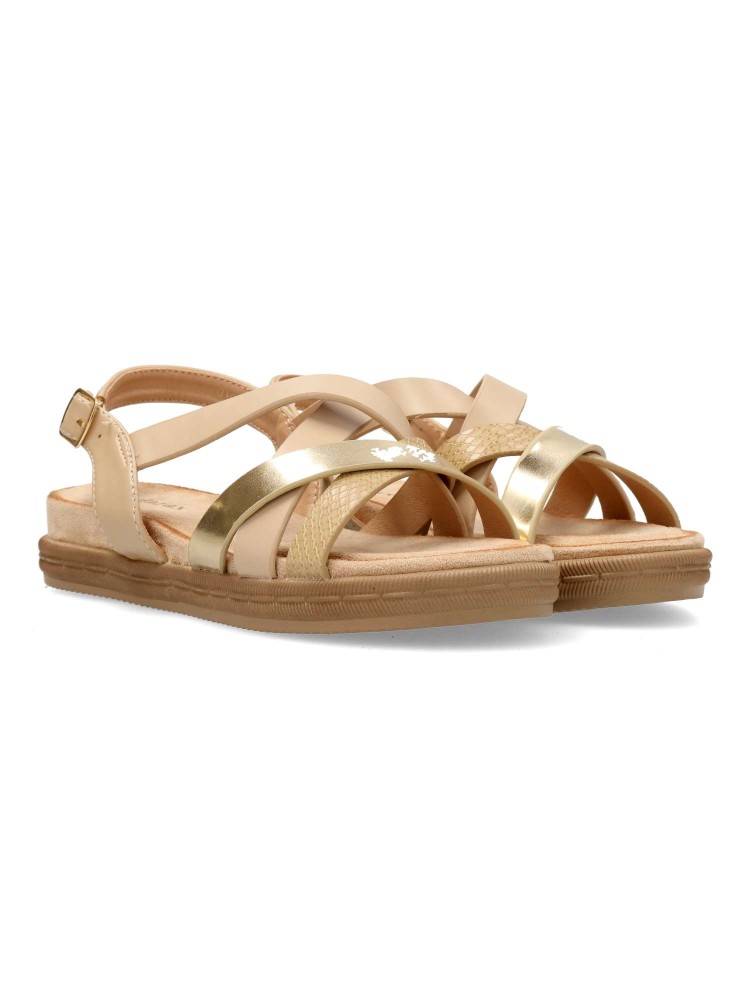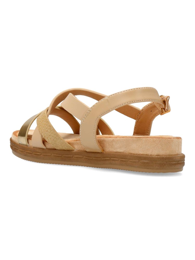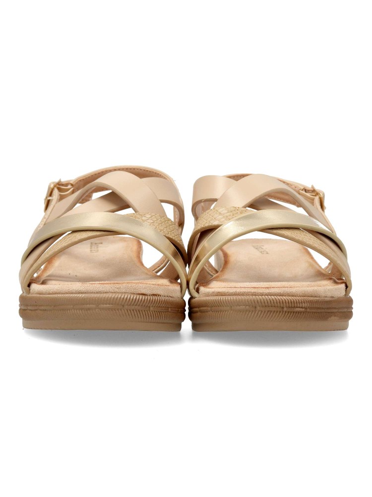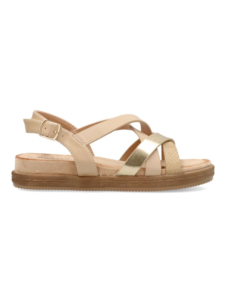 Sandalia cómoda de mujer, con cierre de hebilla al tobillo. Fabricada en piel sintética, con suela de goma flexible. Planta acolchada. Color beige-oro. Una sandalia versátil, con diseño de tiras cruzadas, con la que podrás pasear cómodamente en verano.