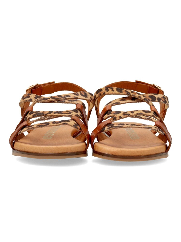 Sandalia de mujer con cierre de hebilla. Modelo cómodo, fabricado en piel, con suela de goma flexible. Interior suave con planta de gel, confort total. Transpirables 100% y máxima durabilidad. Color cuero - print leopardo. Hecho a mano en España.