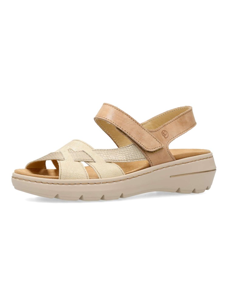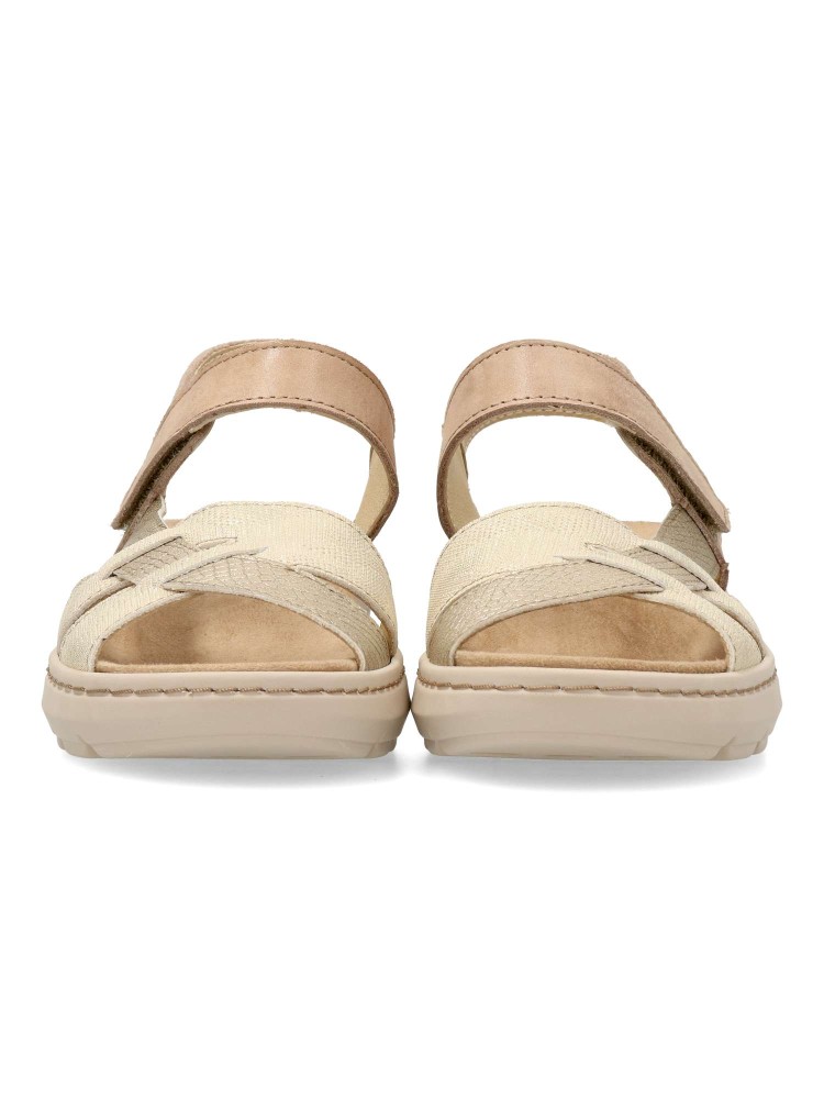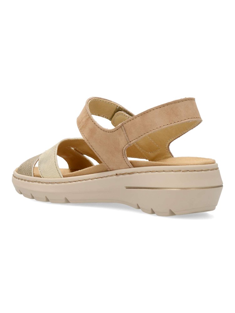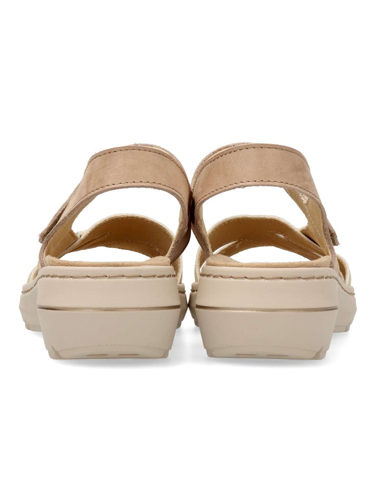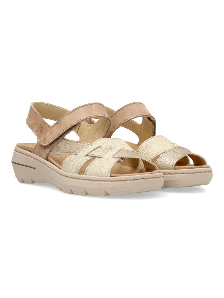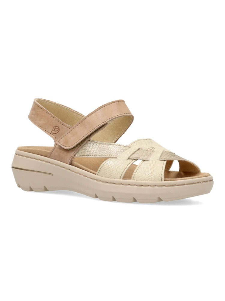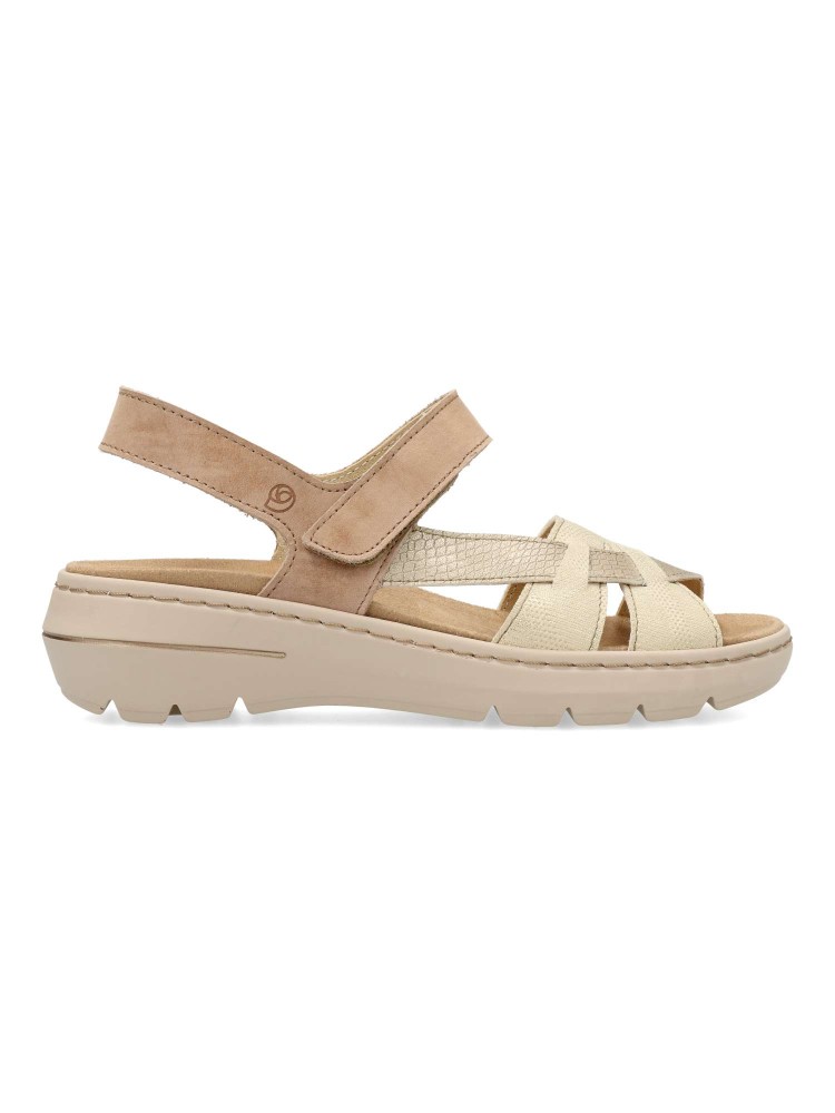 Sandalia cómoda de mujer. Fabricada en piel natural color taupe-champán. Cierre adherente ajustable. Plantilla acolchada, anatómica, extraíble y lavable. Cuña de 4 cm. Disfruta del verano con el máximo confort en tus pies. Fabricado en Portugal.