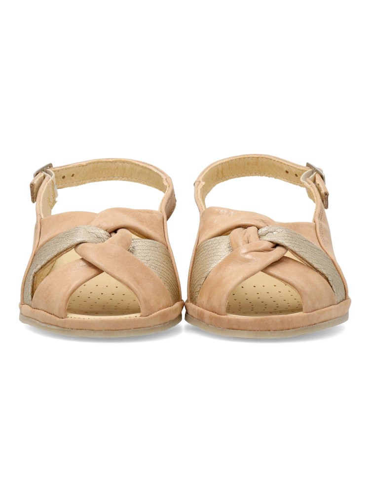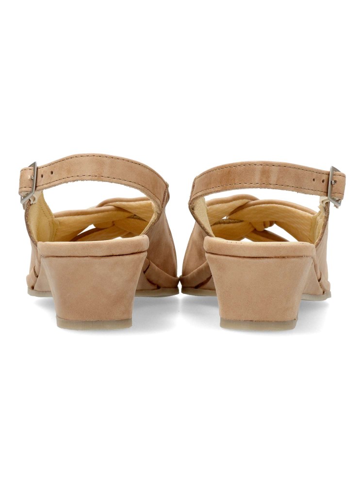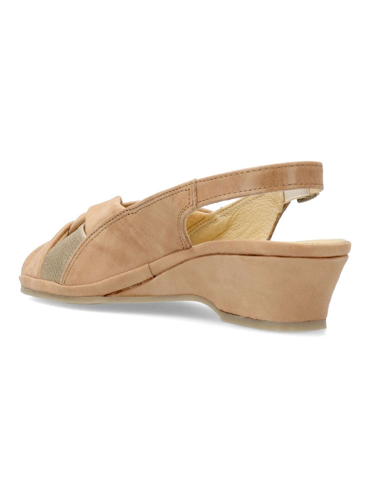 Sandalia cómoda de mujer. Fabricada en piel natural color taupe-oro. Tira trasera con cierre de hebilla. Plantilla de piel anatómica acolchada. Pequeña cuña de 4 cm. de altura. Máximo confort para tus pies. Fabricado en Portugal.
