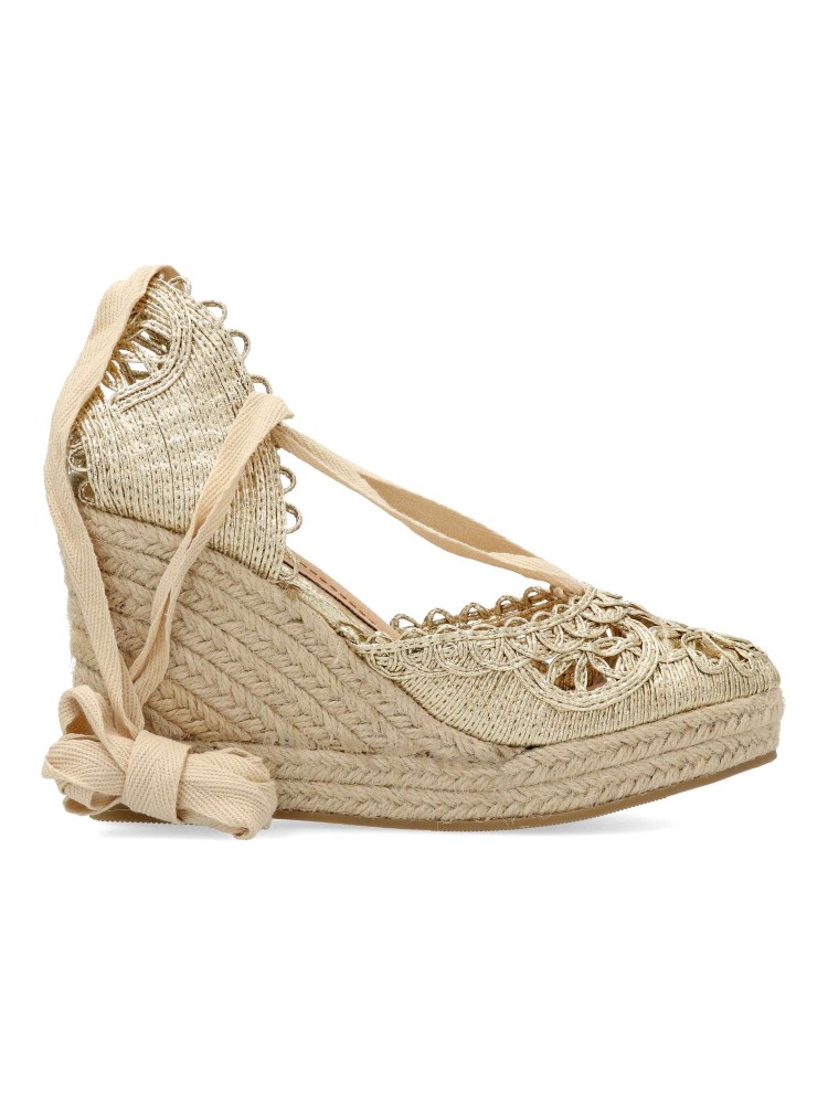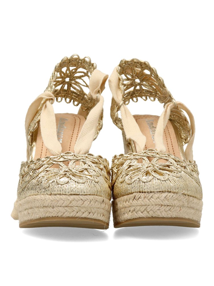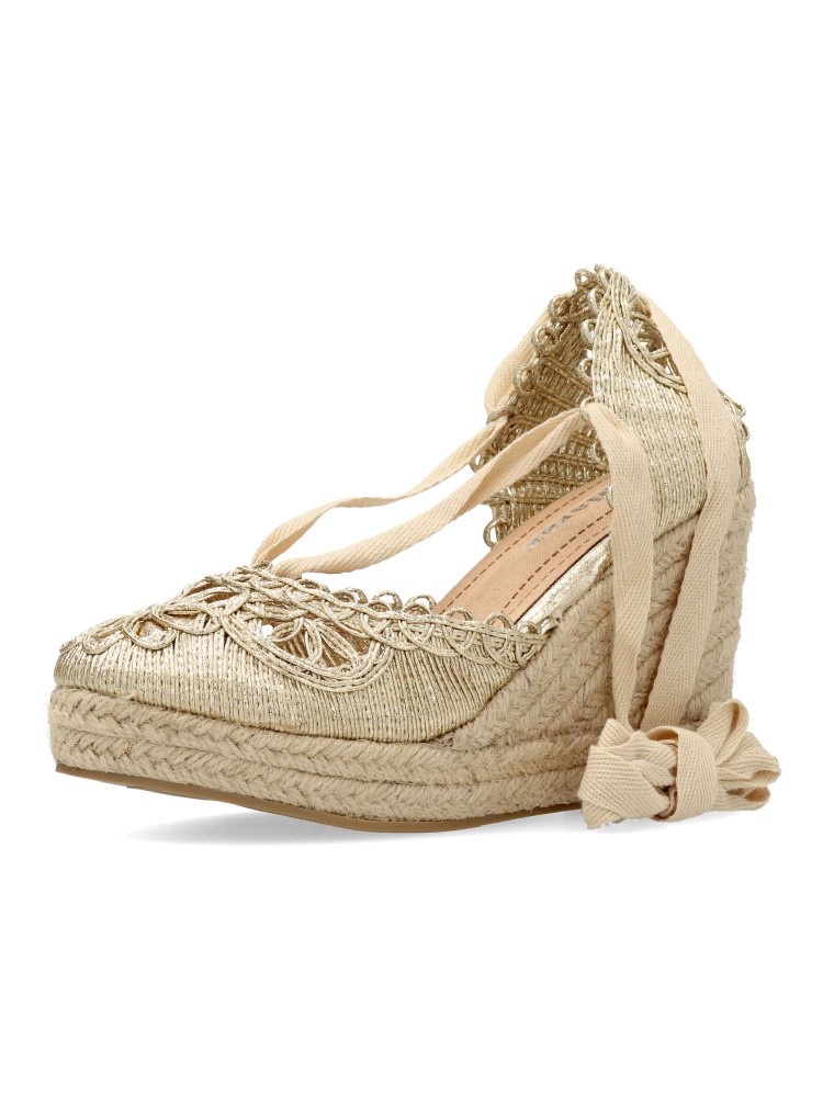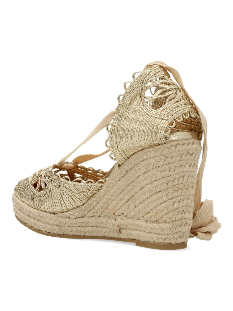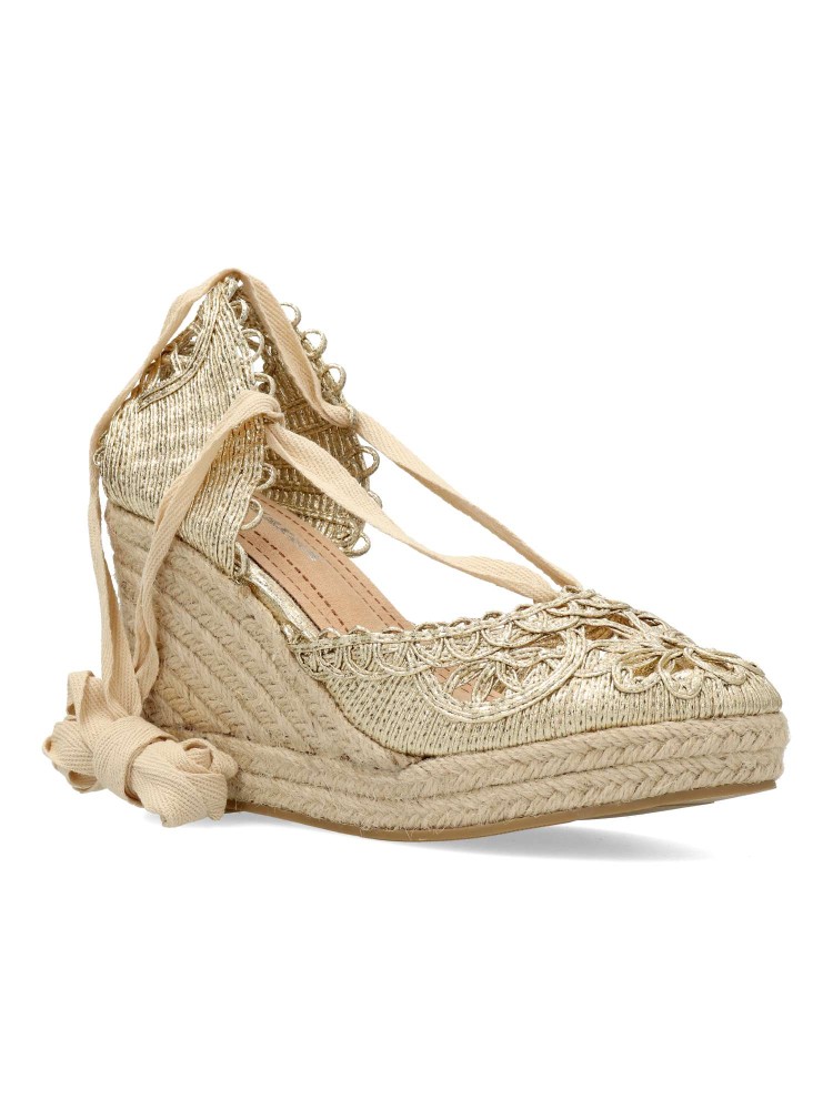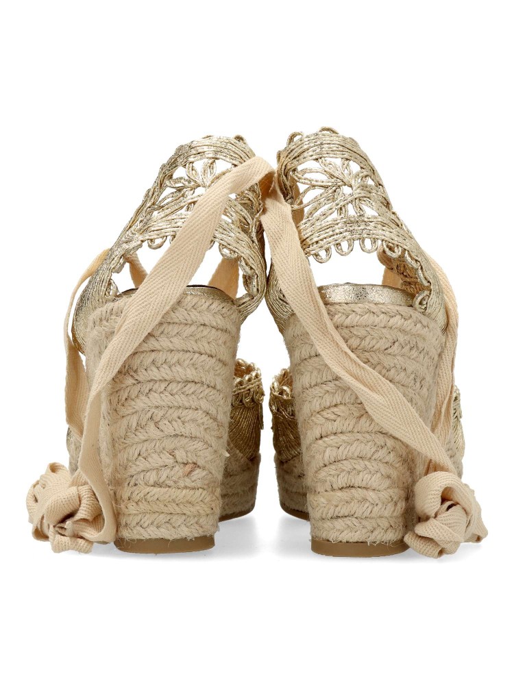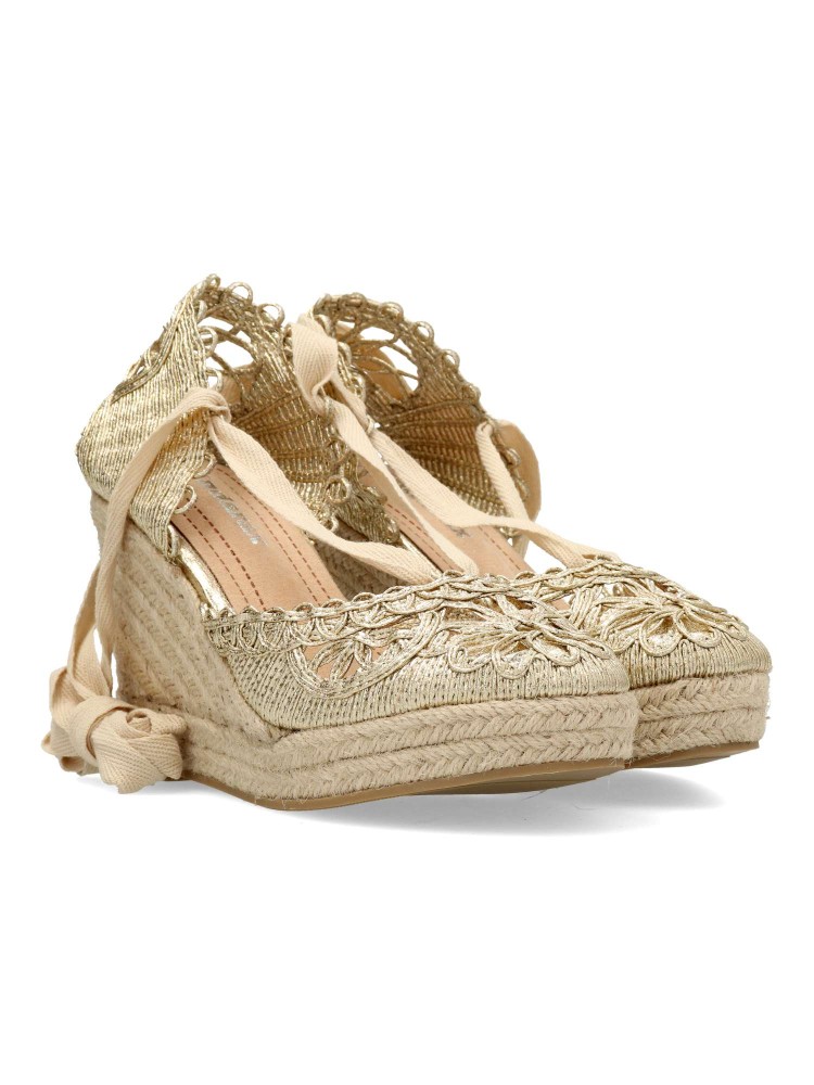 Sandalia alpargata de mujer, con cintas cogidas al tobillo. Esparteña fabricada con cuerda entrelazada y suela de yute sobre goma. Planta acolchada. Color oro. Altura cuña 9 cm. Valenciana original, ideal para ferias de pueblo y looks de verano.