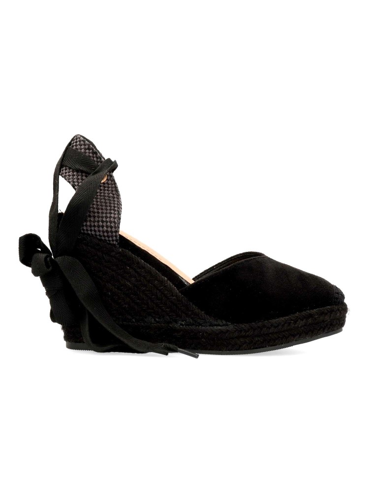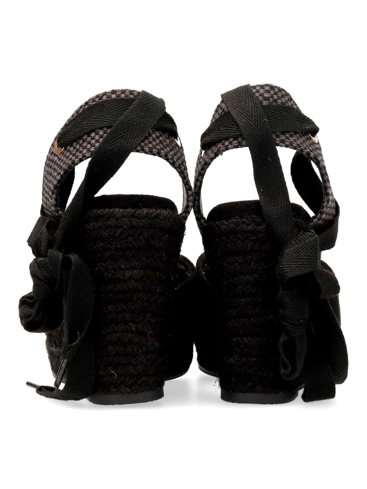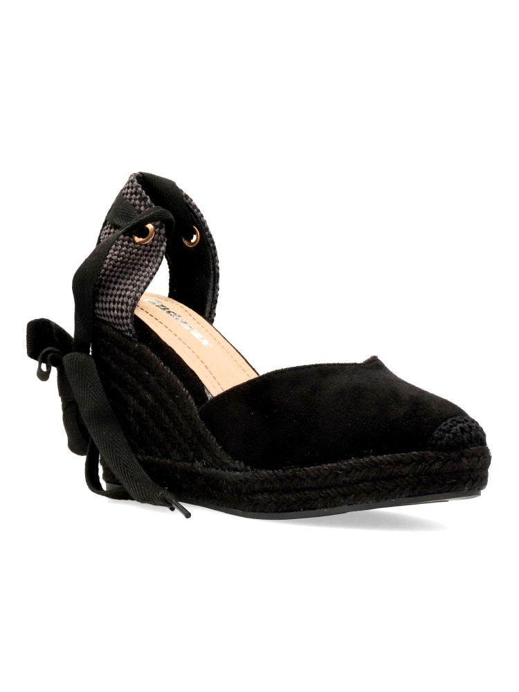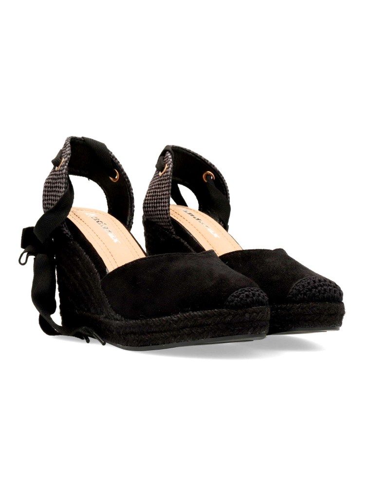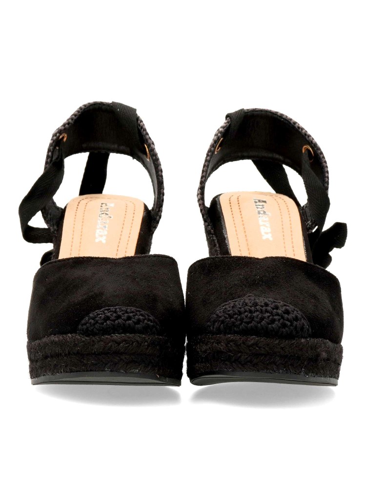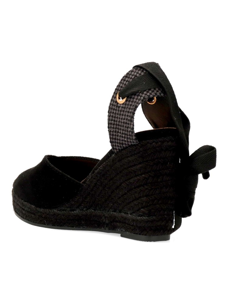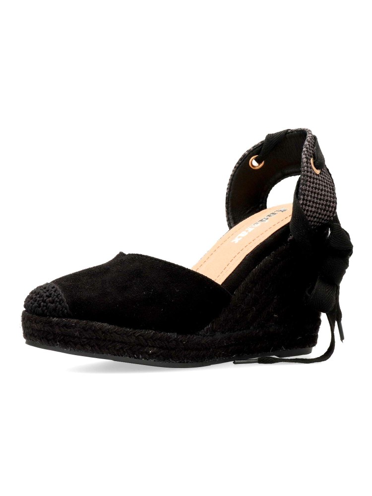 Sandalia esparteña yute de mujer. Cierre mediante cintas al tobillo. Alpargata fabricada en piel sintética, con suela de yute negro sobre goma. Planta acolchada. Color negro. Cuña de 9 cm. Valenciana clásica para combinar con tus looks de temporada.