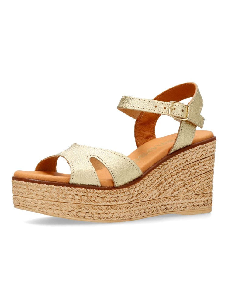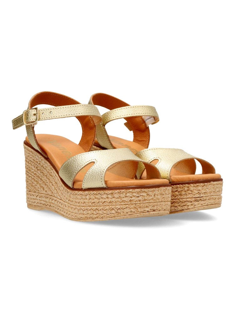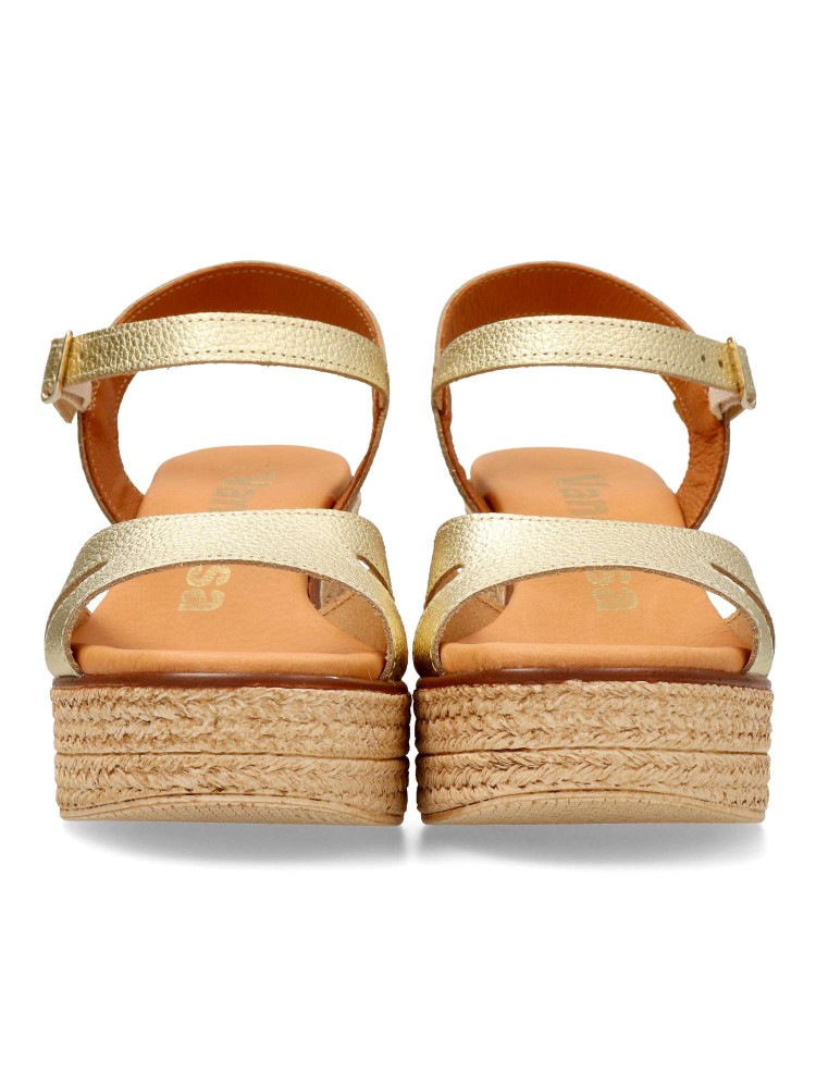Sandalia de pala cómoda para mujer. Fabricada en piel metalizada, con suela de goma. Cierre de hebilla. Plataforma y cuña efecto yute, de 8 cm. Forros y plantillas 100% transpirables. Planta acolchada. Diseño y confort para verano. Hecho en España.