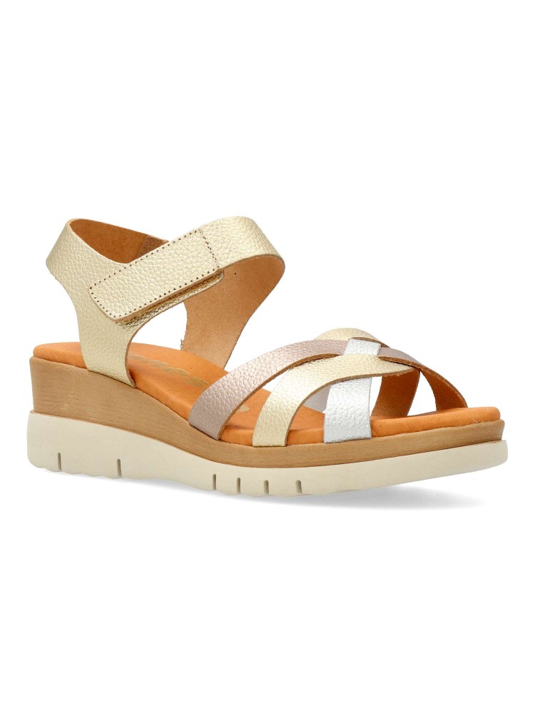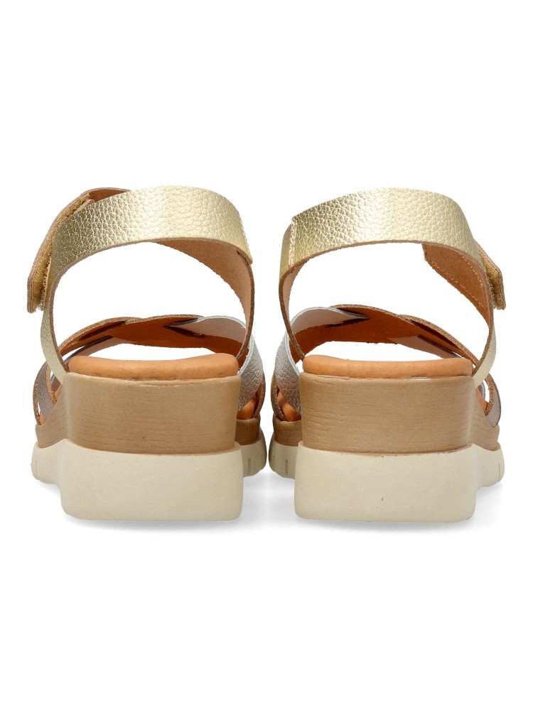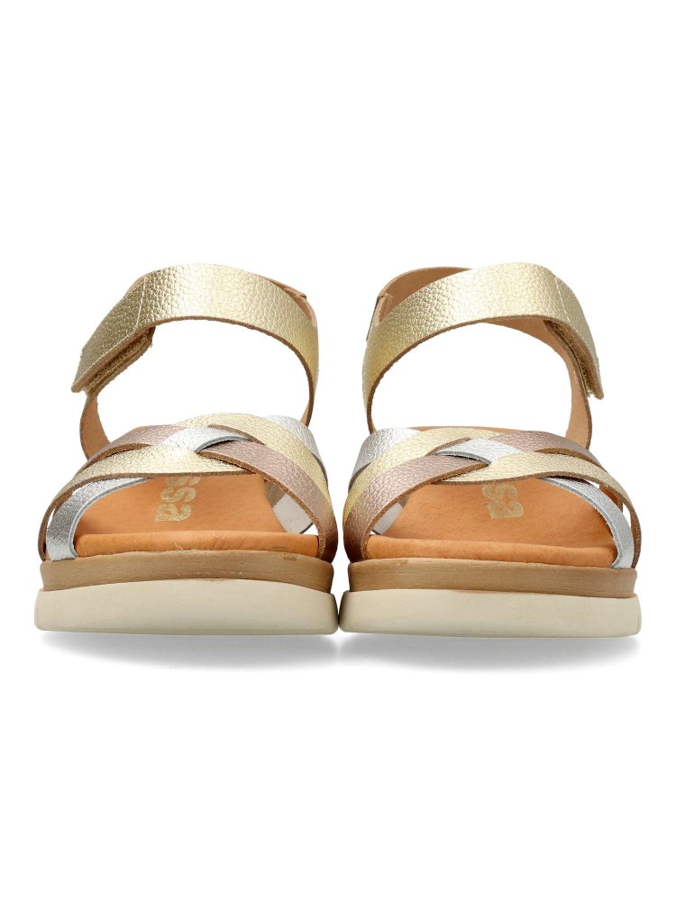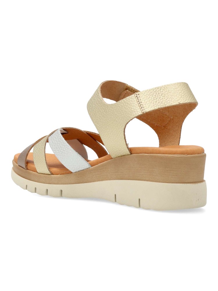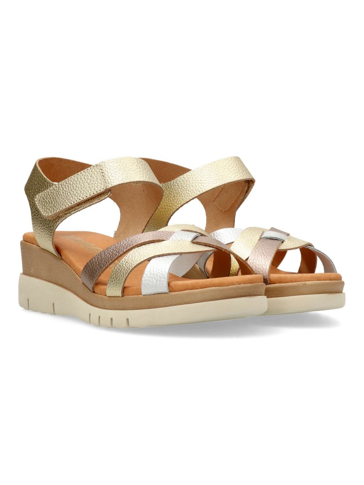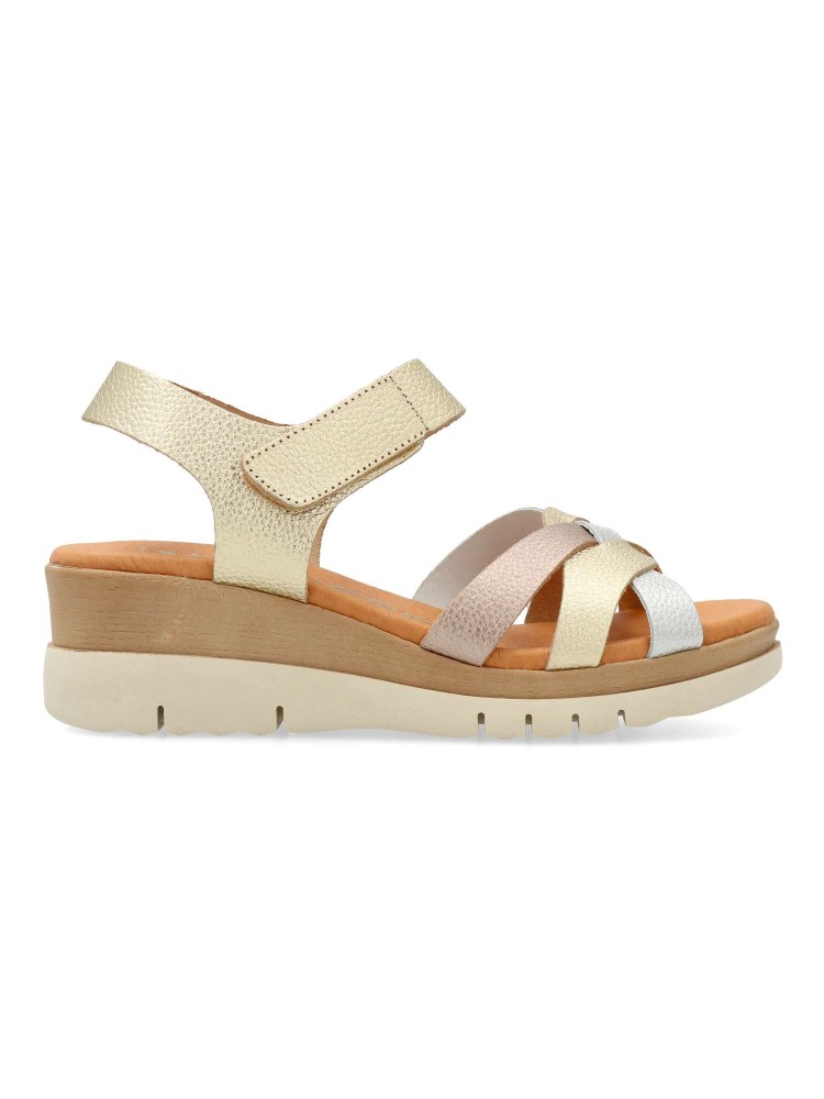 Sandalia de tiras cómoda para mujer. Fabricada en piel, con suela de goma. Cierre adherente al tobillo. Cuña de 5 cm. Forros y plantillas 100% transpirables. Planta acolchada. Color oro-plata-bronce. Diseño y confort fácil de combinar. Hecho en España.