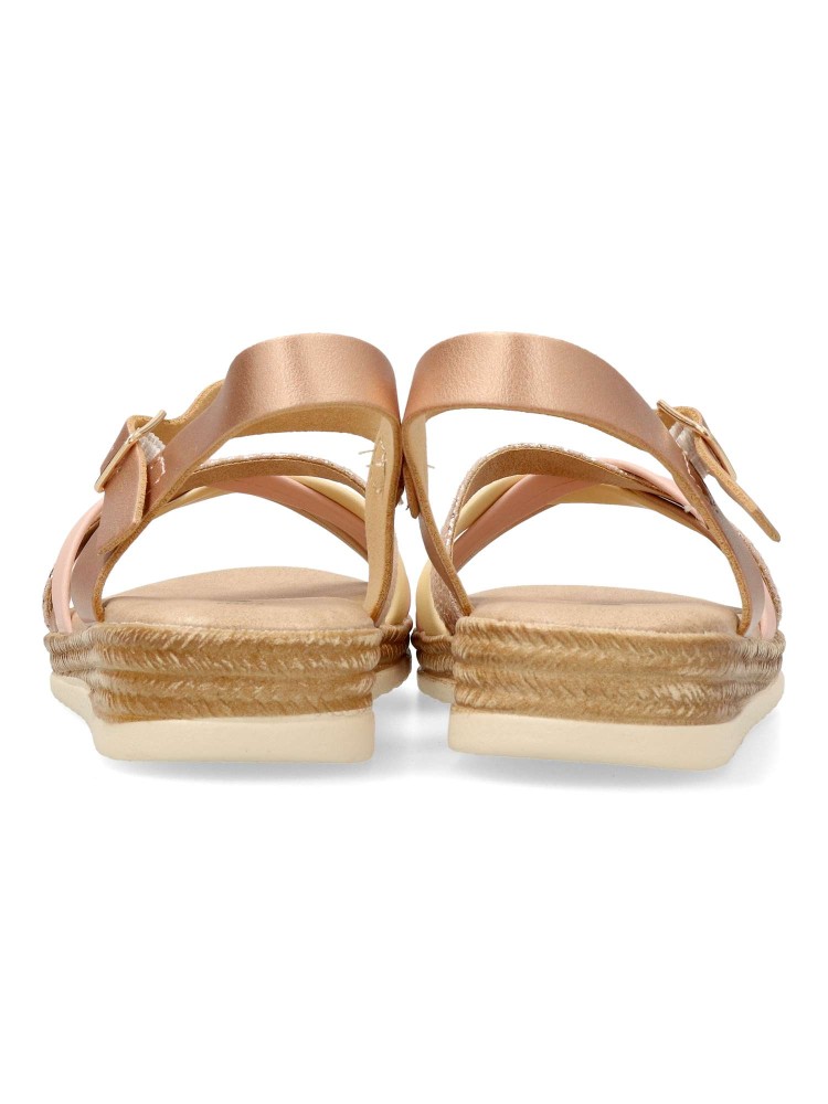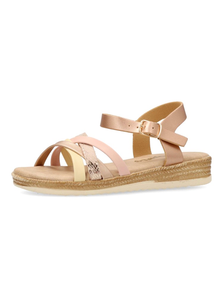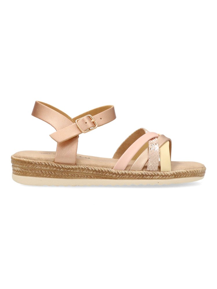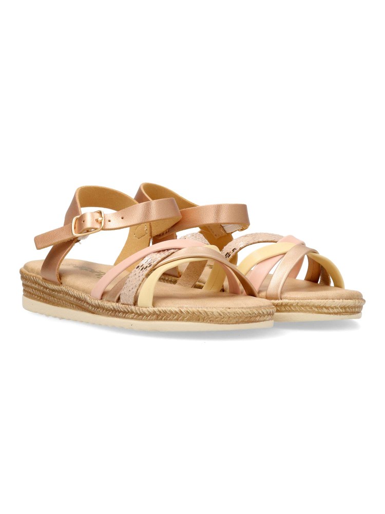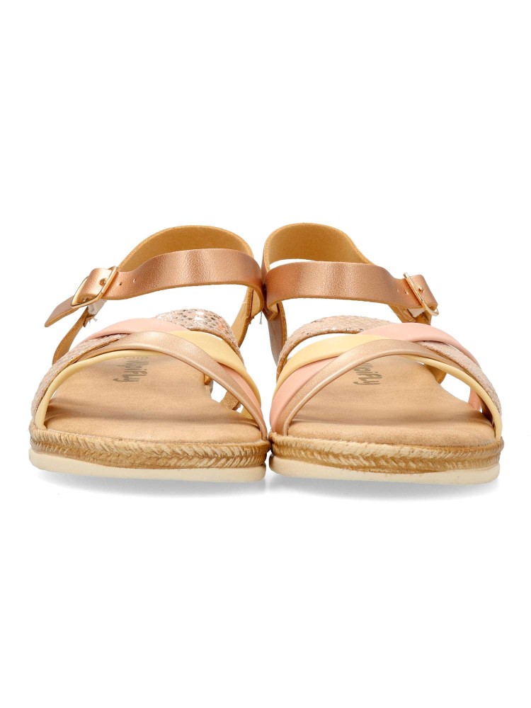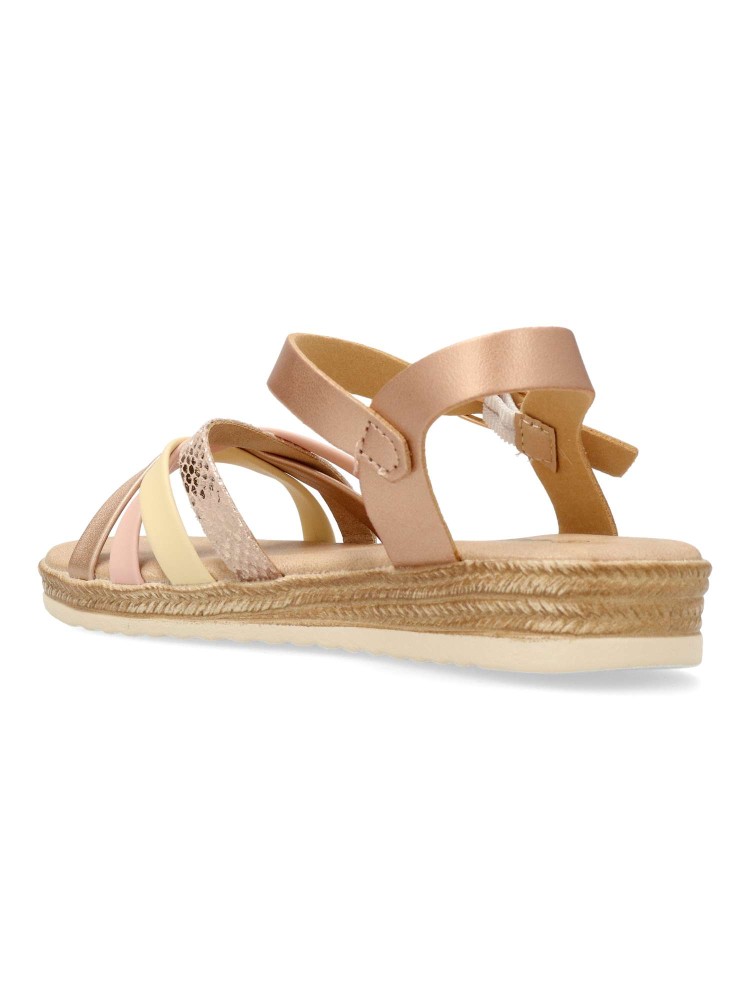 Sandalia vestir de tiras curzadas. Cierre de hebilla. Modelo cómodo con planta acolchada. Fabricada en piel sintética multicolor, con suela de goma flexible. Diseñado para poder combinarlos con faldas, vestidos y conjuntos de verano.