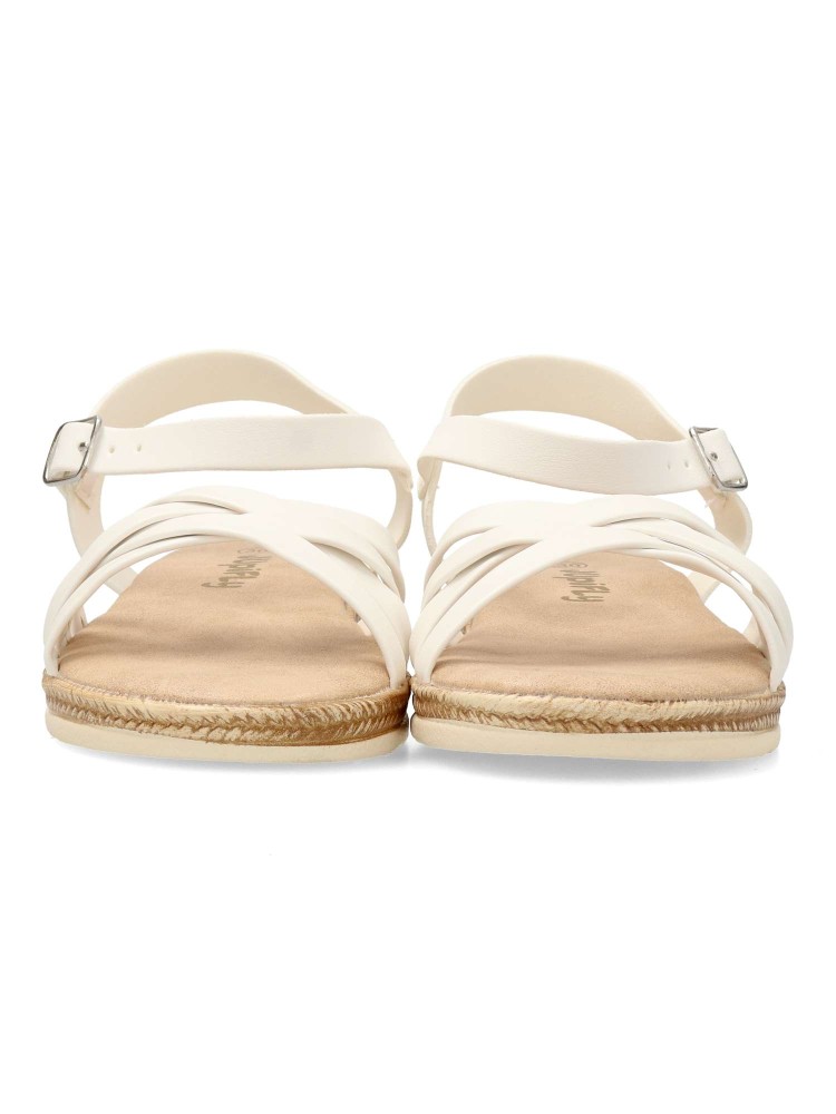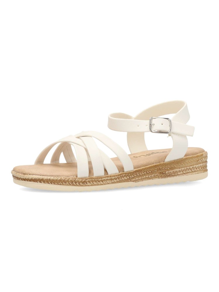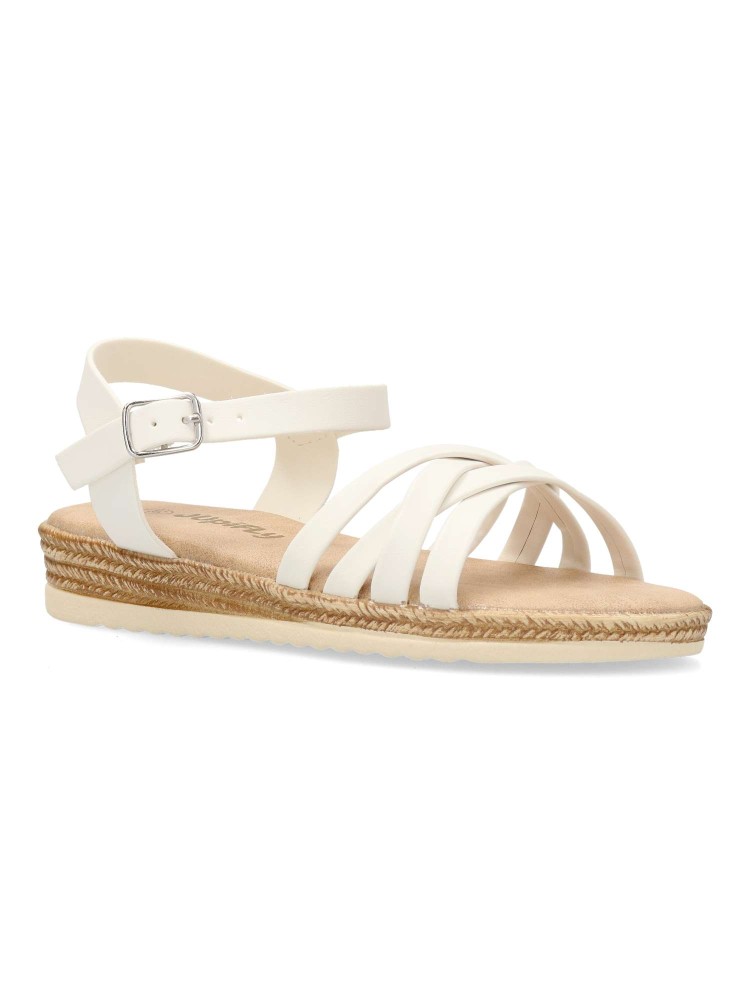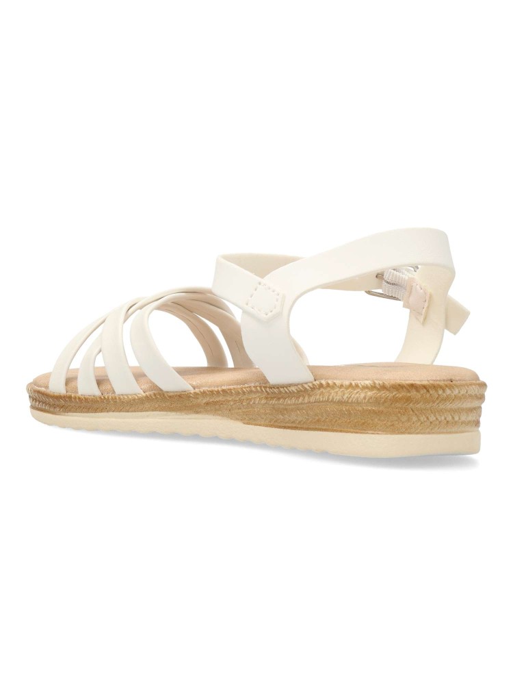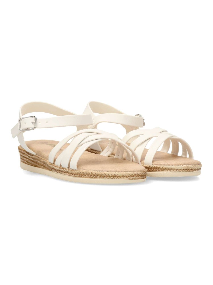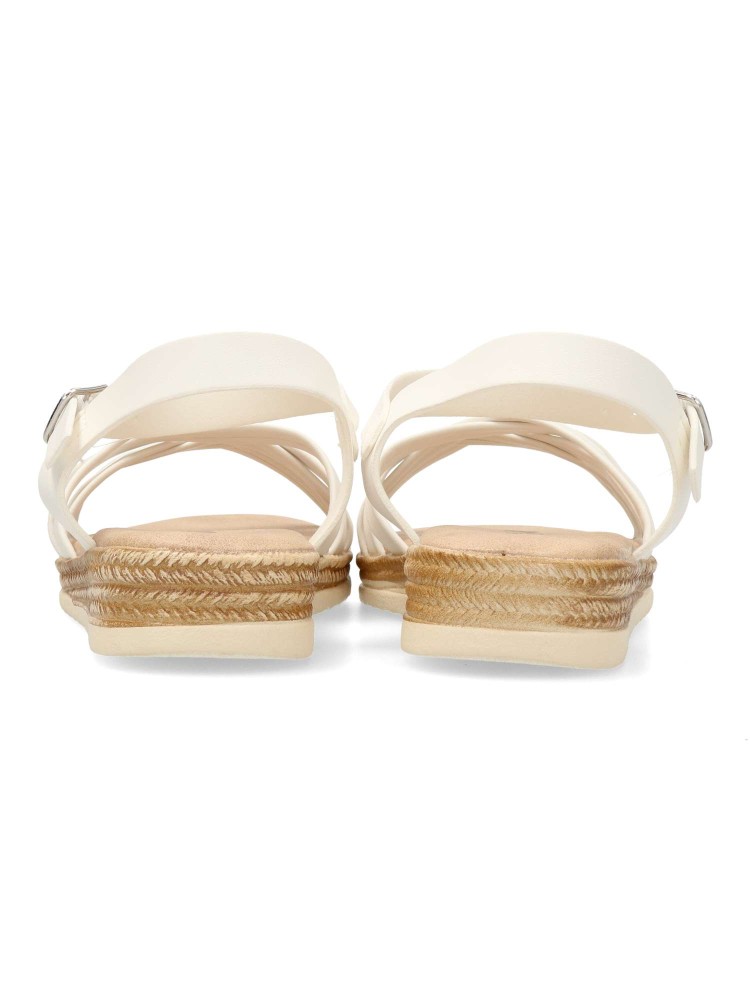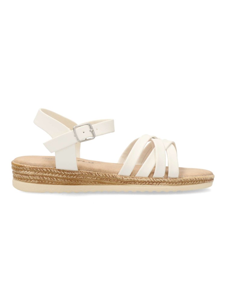 Sandalia vestir de tiras curzadas. Cierre de hebilla. Modelo cómodo con planta acolchada. Fabricada en piel sintética con suela de goma flexible. Color blanco. Diseñado para poder combinarlos con faldas, vestidos y conjuntos de verano.