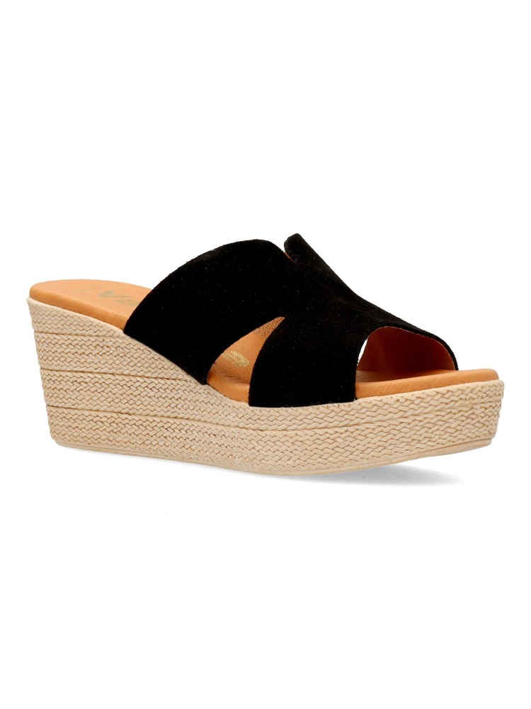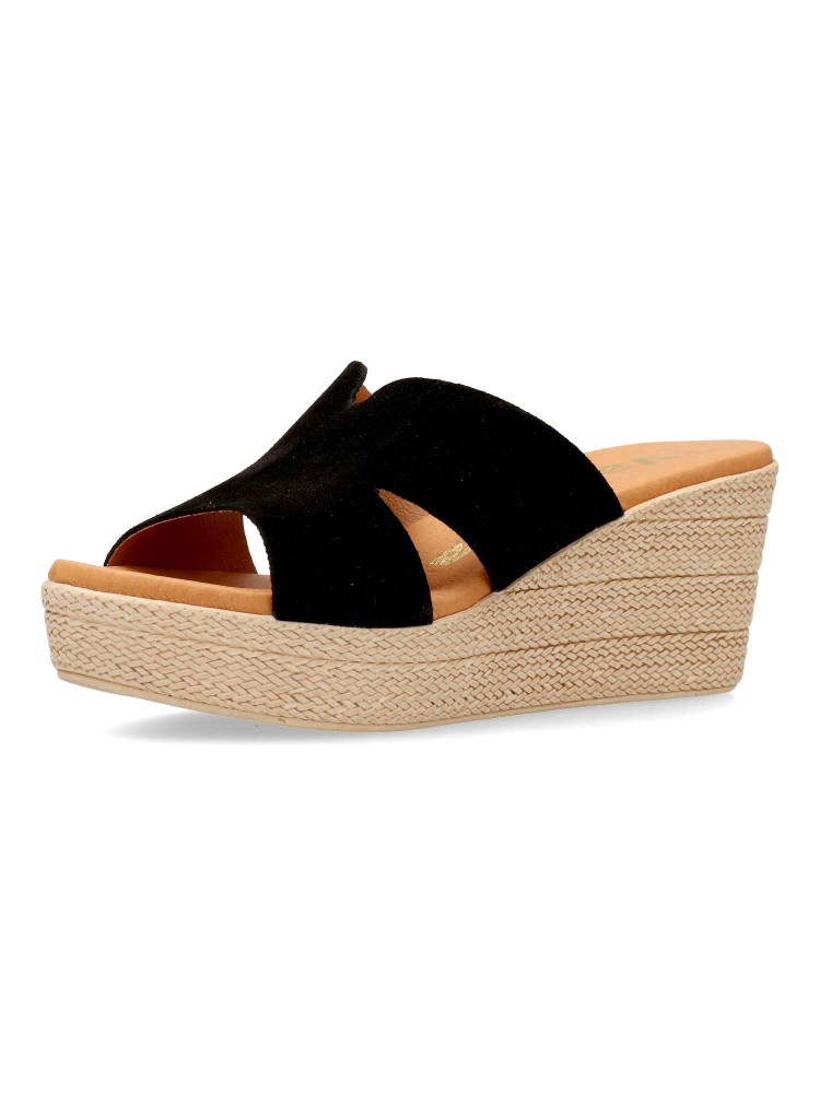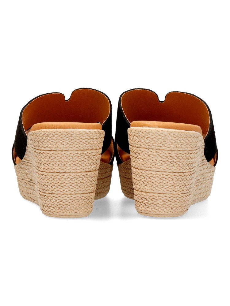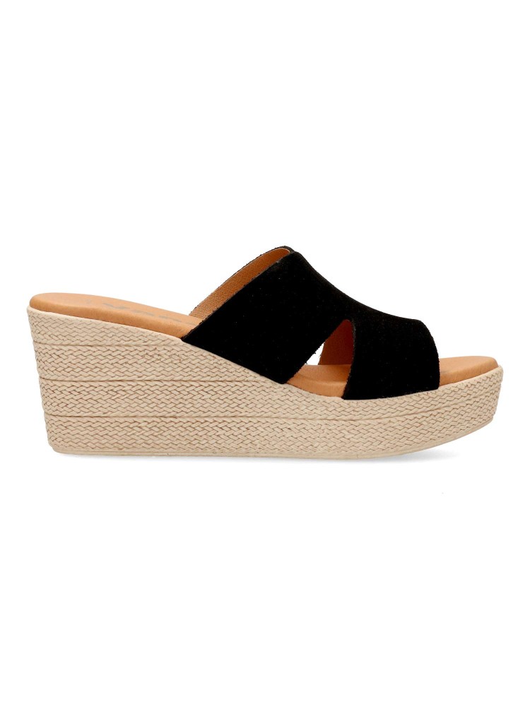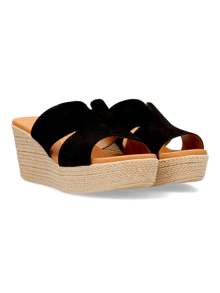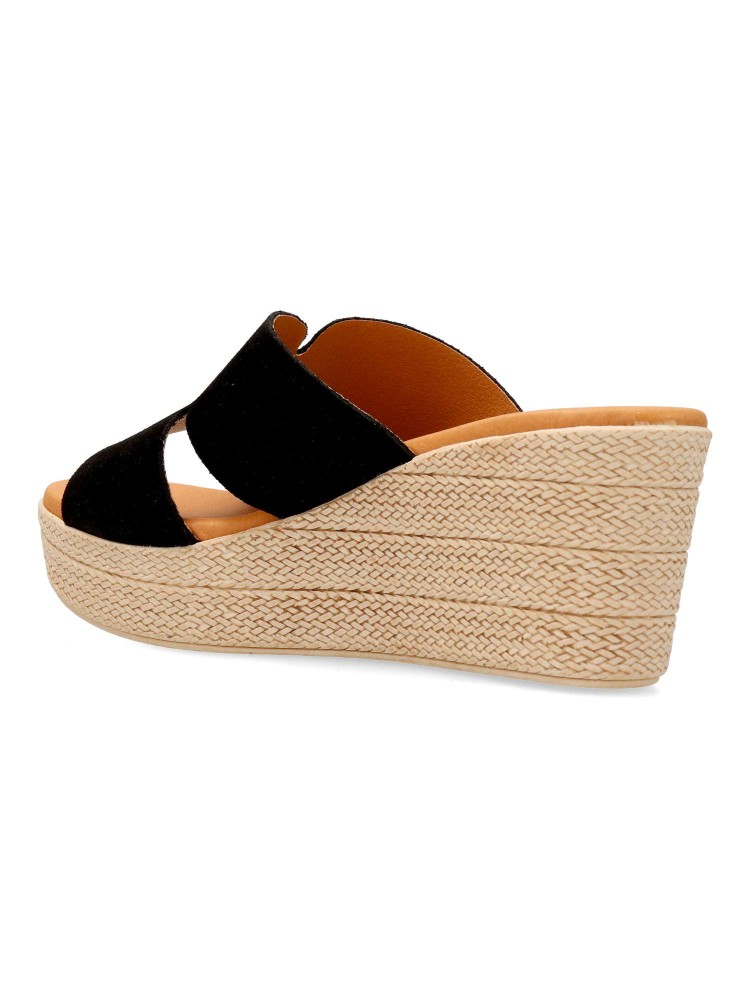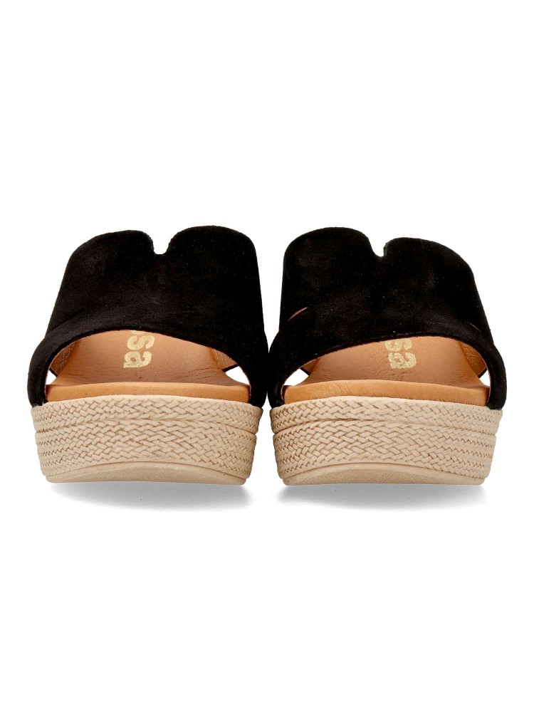 Sandalia de mujer con diseño de pala. Modelo cómodo fabricado en piel serraje con suela de goma. Interior suave con planta de gel, confort total. Transpirables 100%. Color negro. Cuña efecto cuerda trenzada de 6,5 cm. Hecho a mano en España.