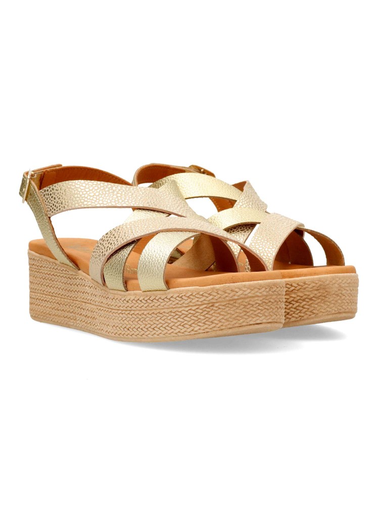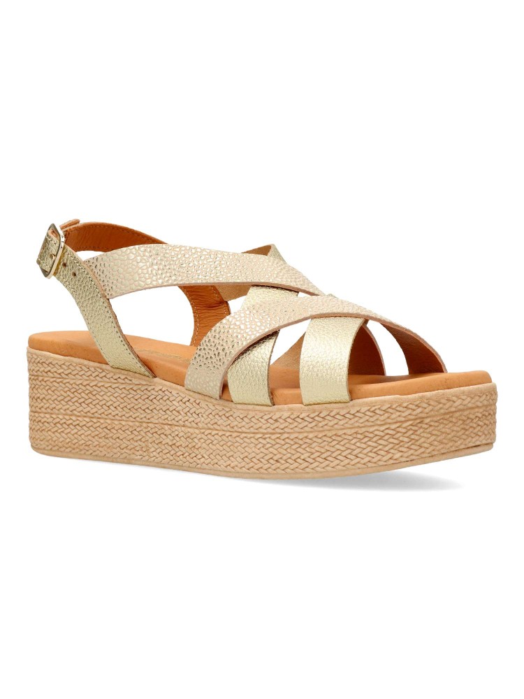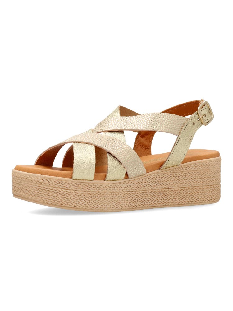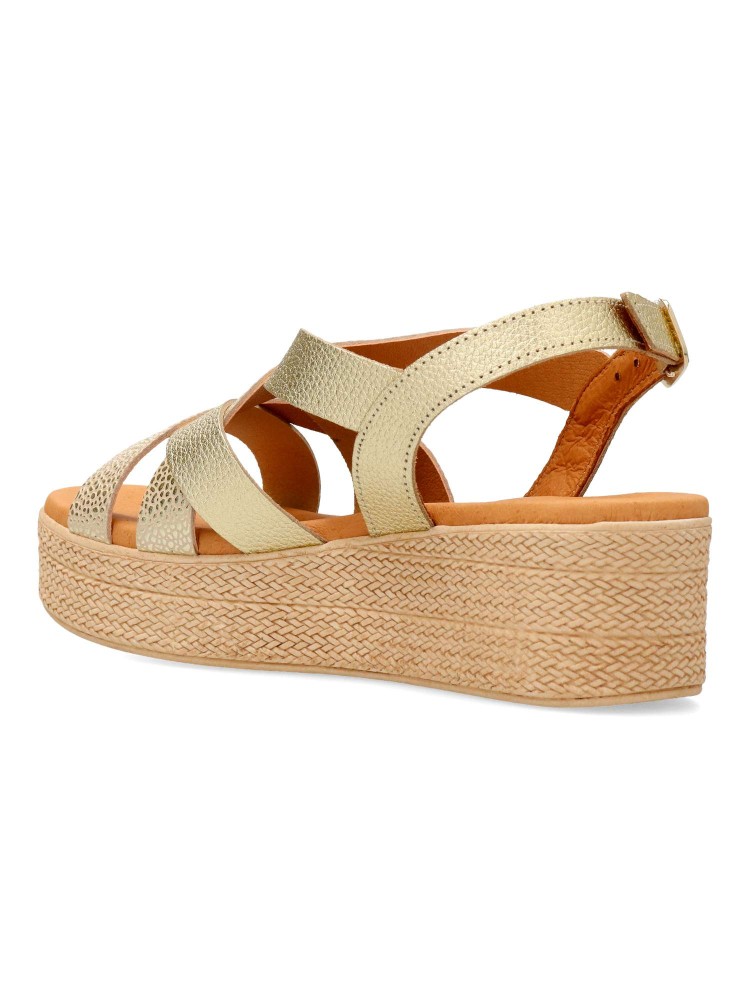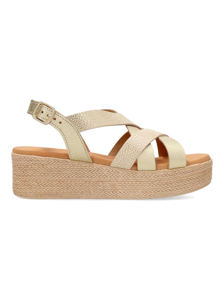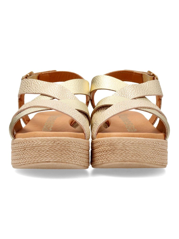 Sandalia de mujer con diseño de tiras cruzadas. Modelo cómodo fabricado en piel grabasa, con suela de goma. Interior suave con planta de gel, confort total. Transpirables 100%. Color oro. Plataforma efecto cuerda trenzada de 4,5 cm. Hecho a mano en España