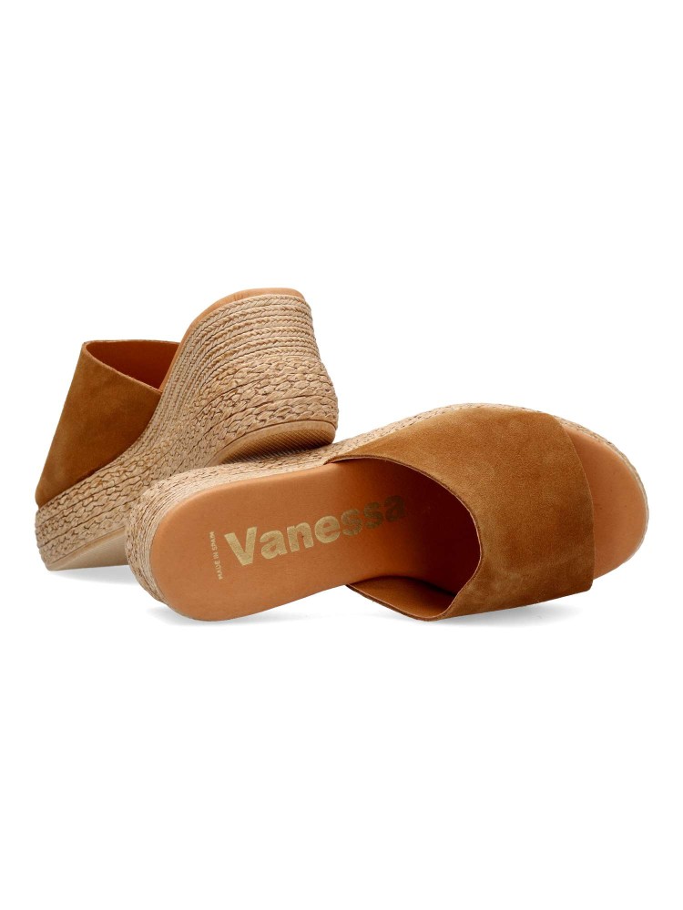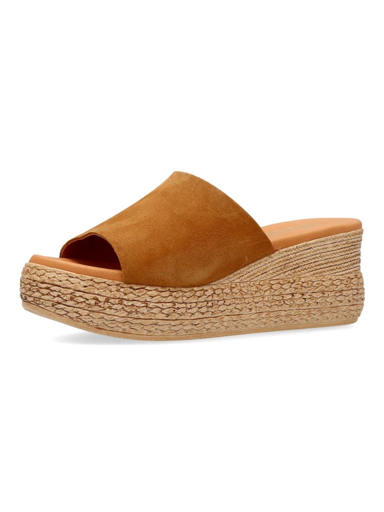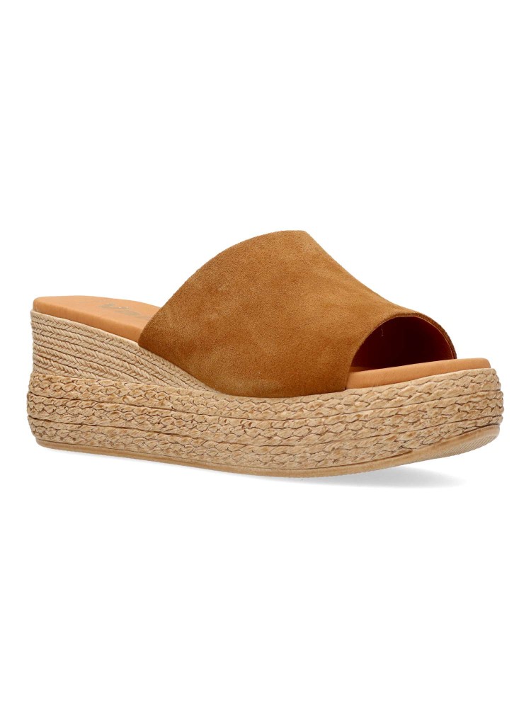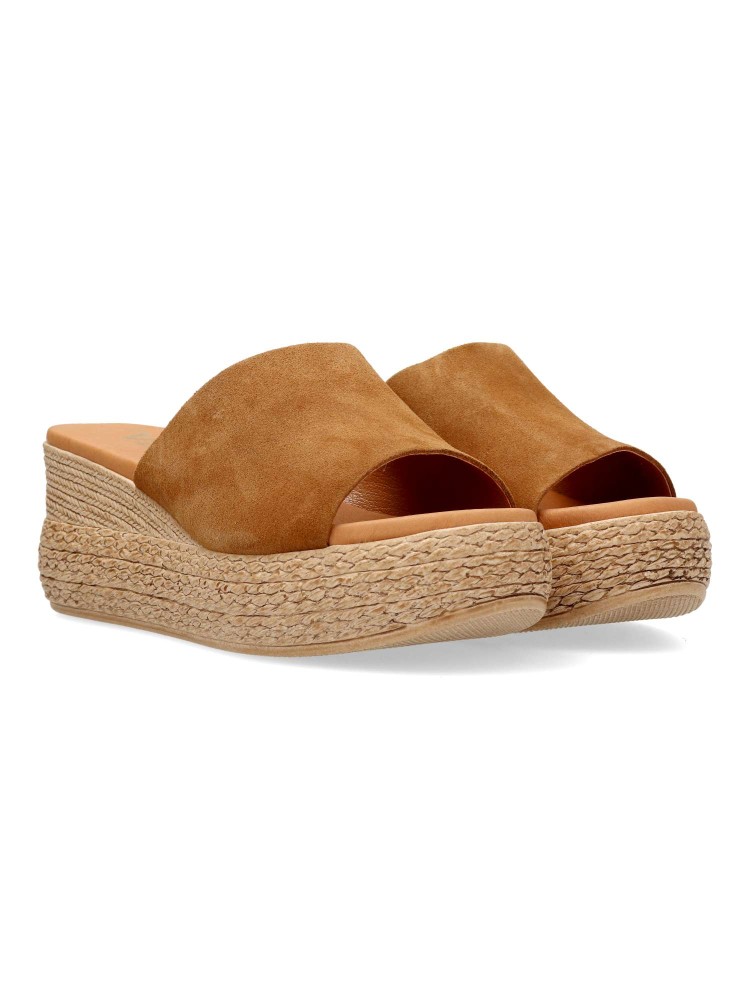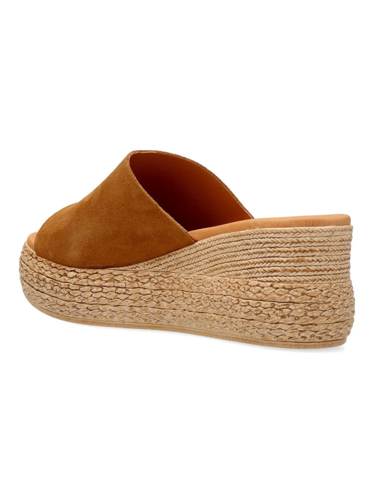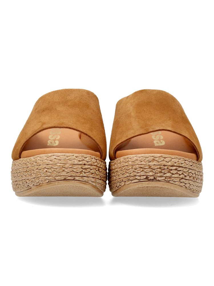 Sandalia de mujer con diseño de pala. Modelo cómodo fabricado en piel serraje suave. Interior suave con planta de gel, confort total. Transpirables 100%. Color cuero. Plataforma efecto yute de 6,5 cm. Plataforma de 3,5 cm. Hecho a mano en España.