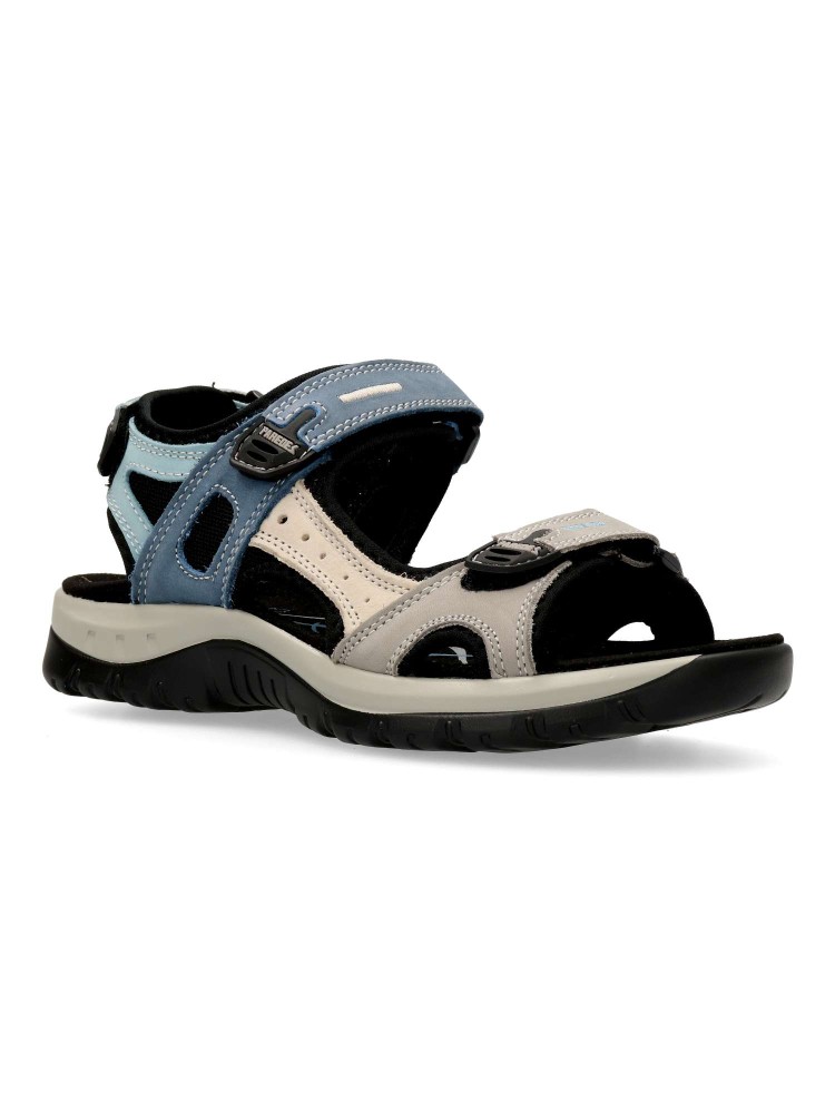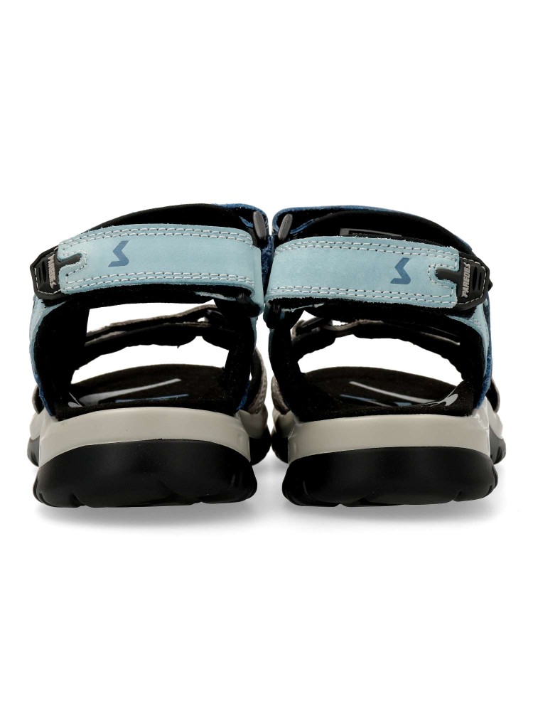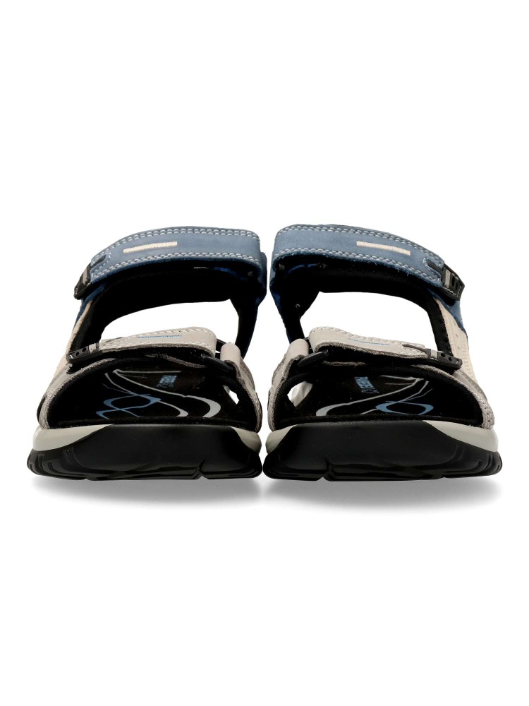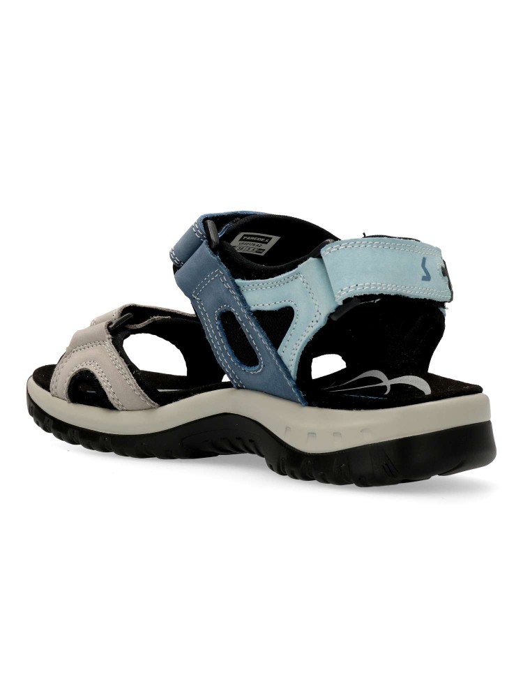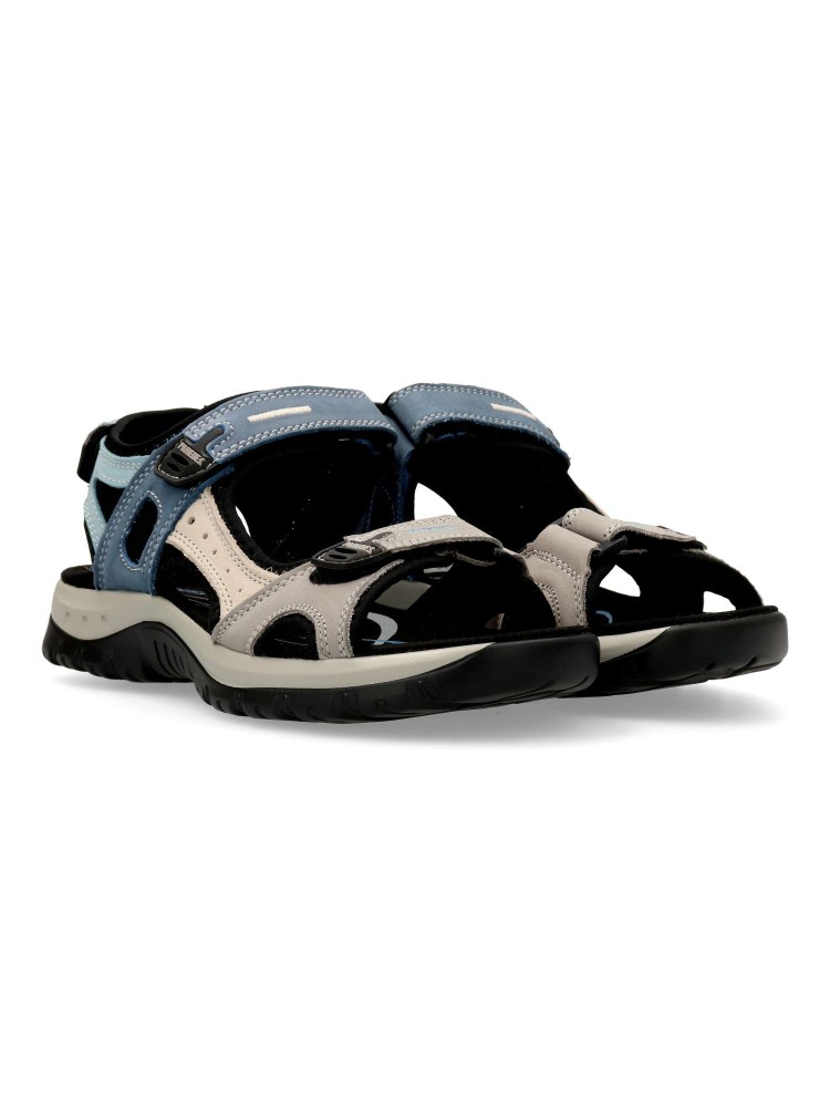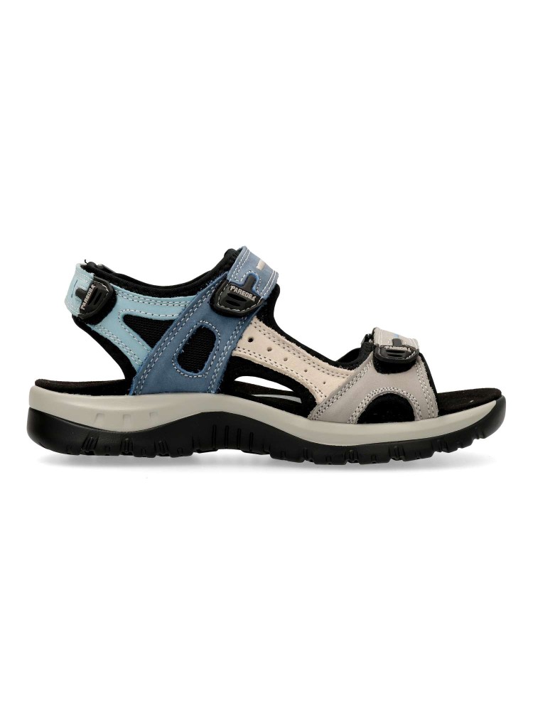 Sandalias de senderismo todo terreno para mujer. Cierre de velcros ajustables. Fabricadas en piel, con suela de goma flexible y ligera. Planta acolchada de piel. Color azul-gris. Cómodas, ligeras y versátiles, para caminar fresco y tranquilo.
