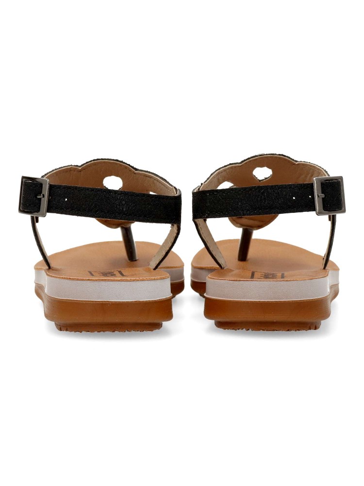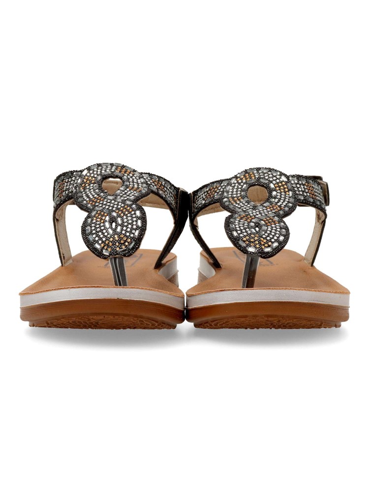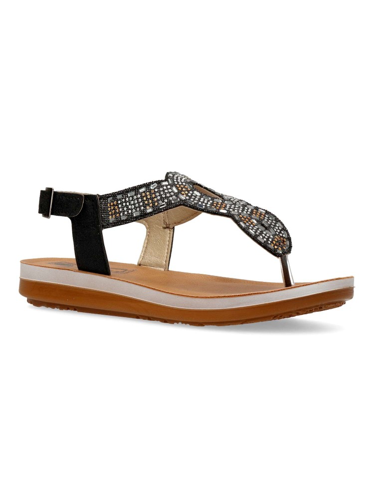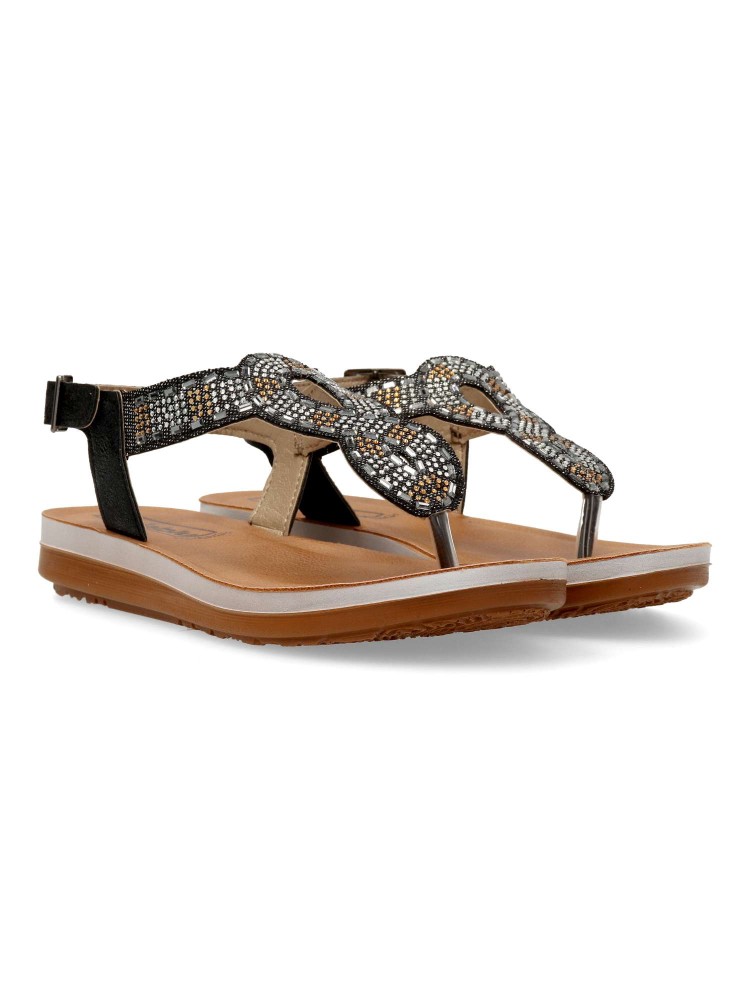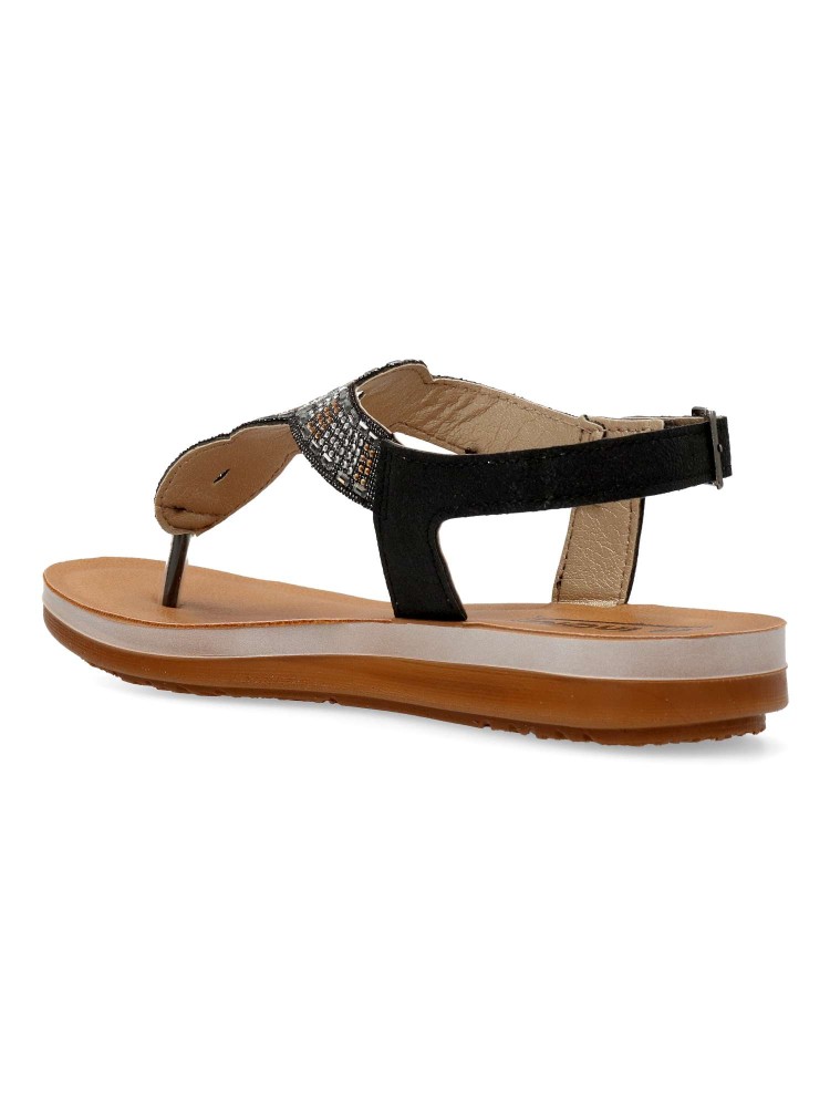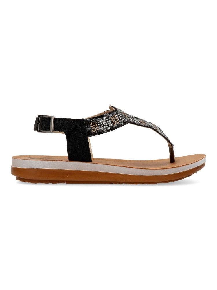 Sandalia cómoda de mujer, con detalle de pedrería con brillo. Color negro. Cierre de hebilla. Fabricado en material sintético con suela de goma ligera y flexible. Planta acolchada, confort diario. Diseño elegante, que podrás disfrutar este verano.