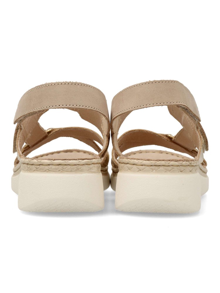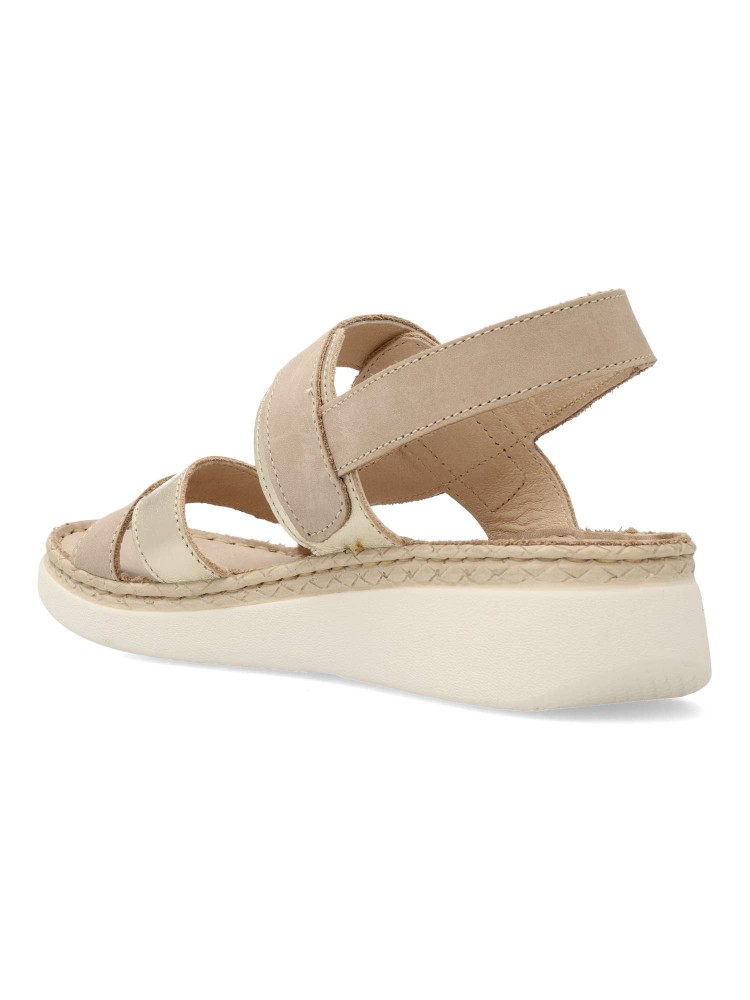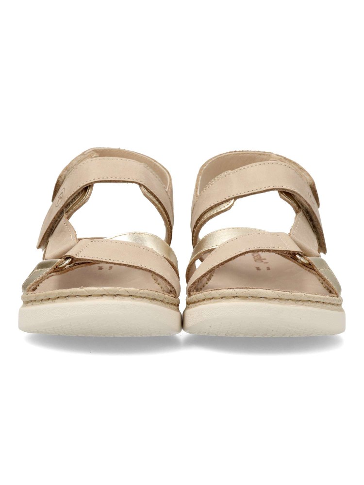 Sandalia cómoda de mujer. Cierre adherente. Fabricado en piel con suela de goma ligera y flexible. Planta de piel acolchada. Forro interior de piel. Color taupe-champán. Diseño versátil y máximo confort para combinar con tus outfits de verano