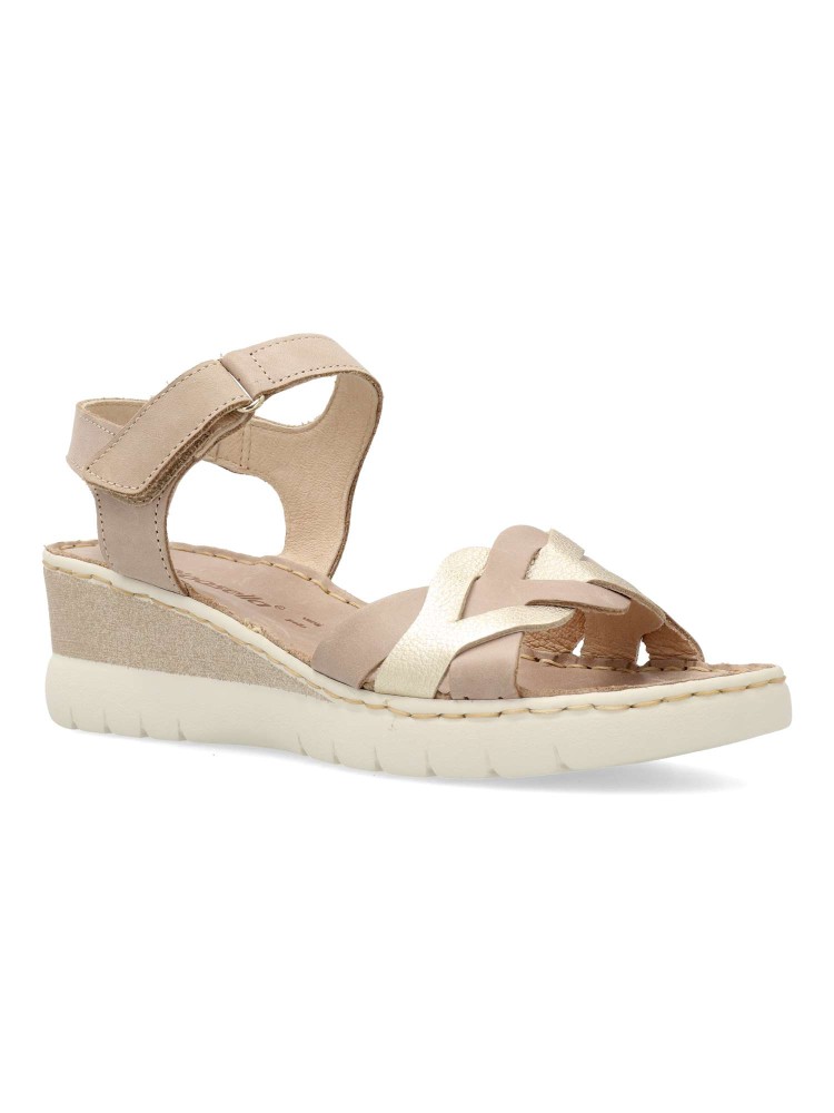 Sandalia cómoda de mujer, linea Marcella. Cierre adherente. Fabricado en piel con suela de goma ligera y flexible. Planta de piel acolchada. Forro interior de piel. Color platino-taupe. Altura cuña 5 cm. Diseño y confort en tus paseos veraniegos.