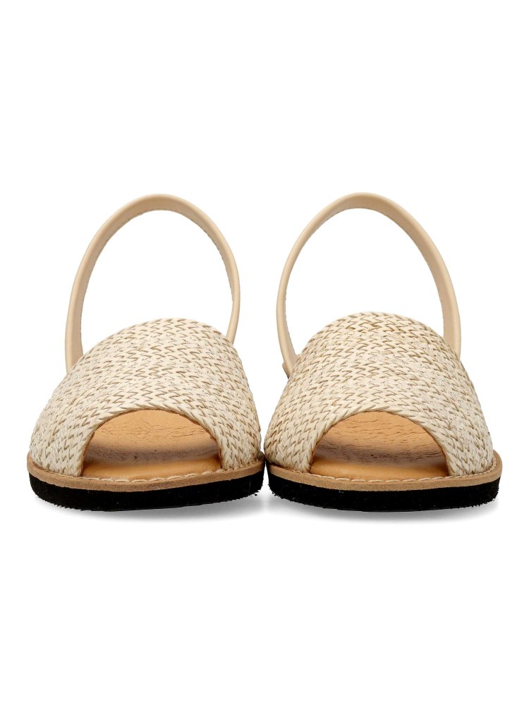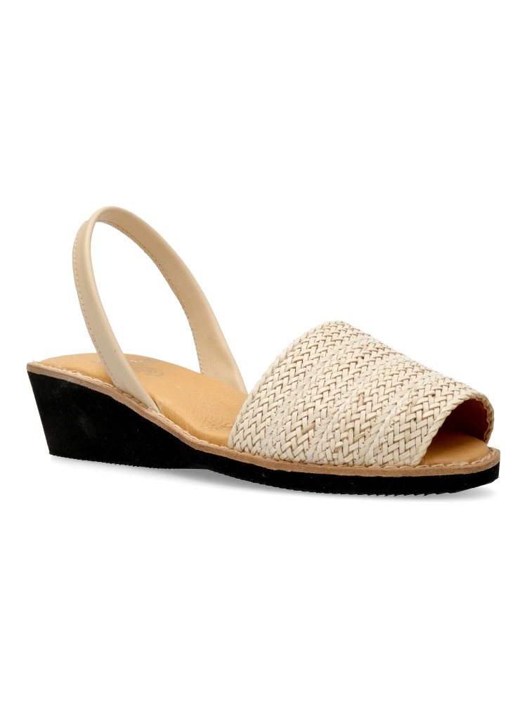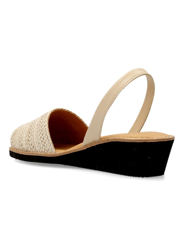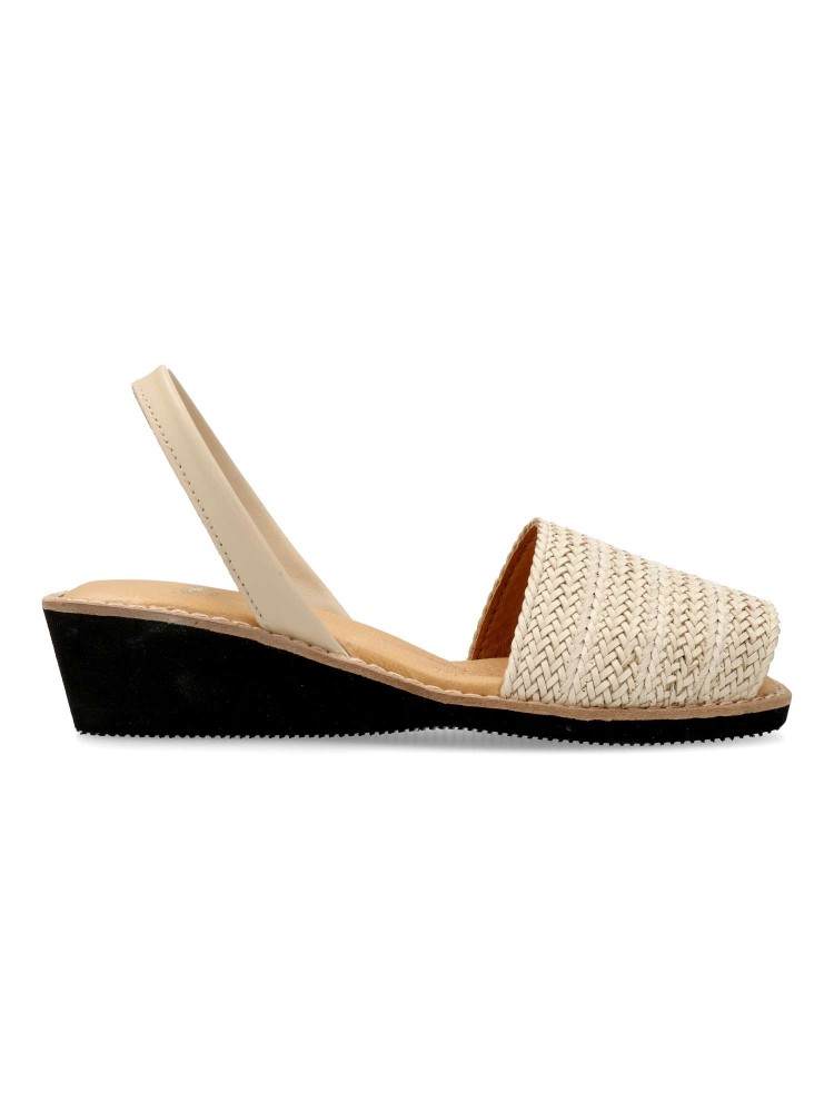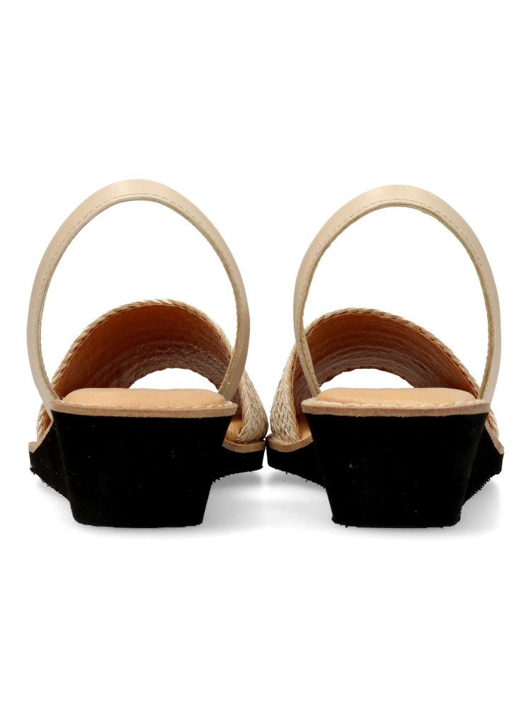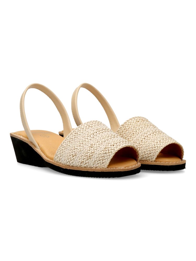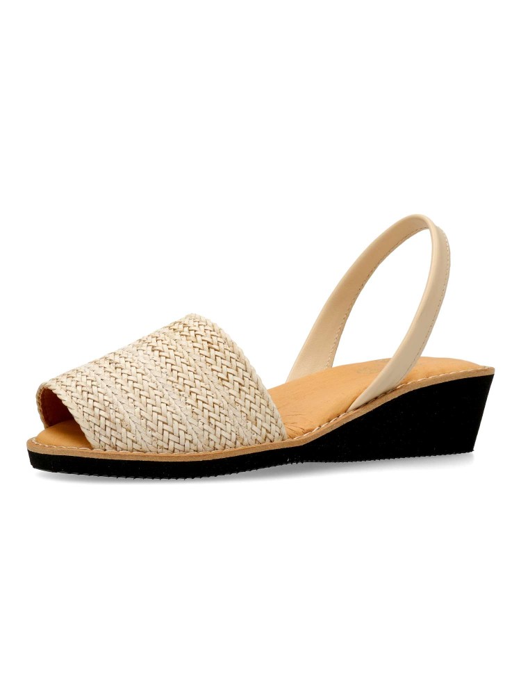 Sandalia menorquina de mujer, fabricada en piel con suela de goma eva. Detalle de pala trenzada. Cuña de 4,5 cm. Planta acolchada. Disponible en color beige. Sensación de confort y bienestar, con tus looks de verano. Hecho en España.