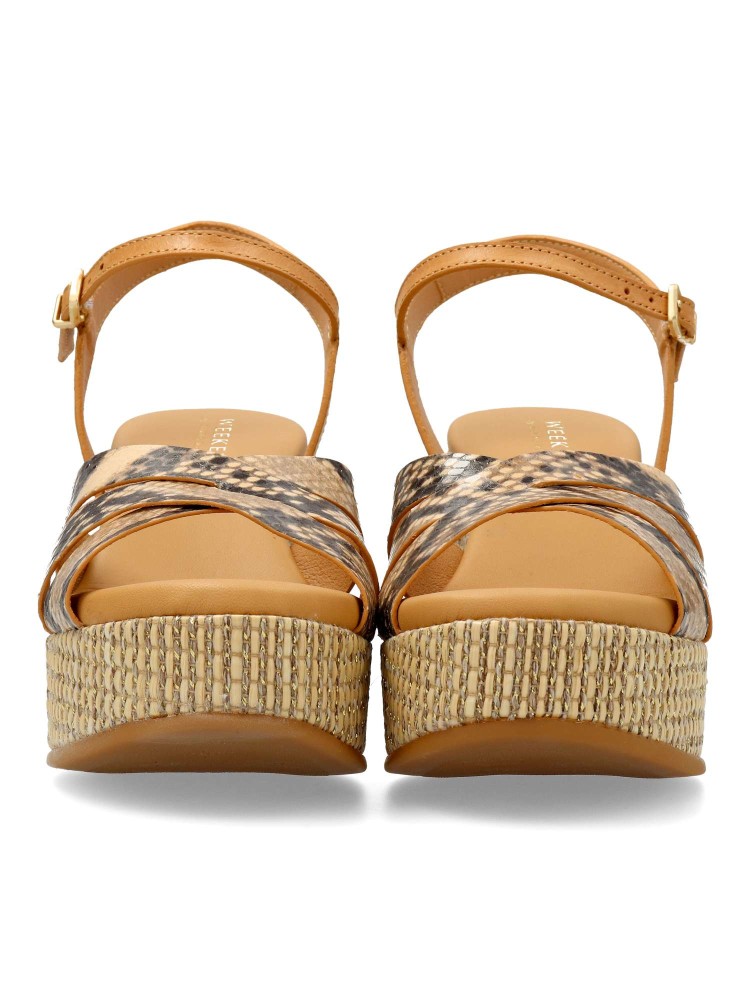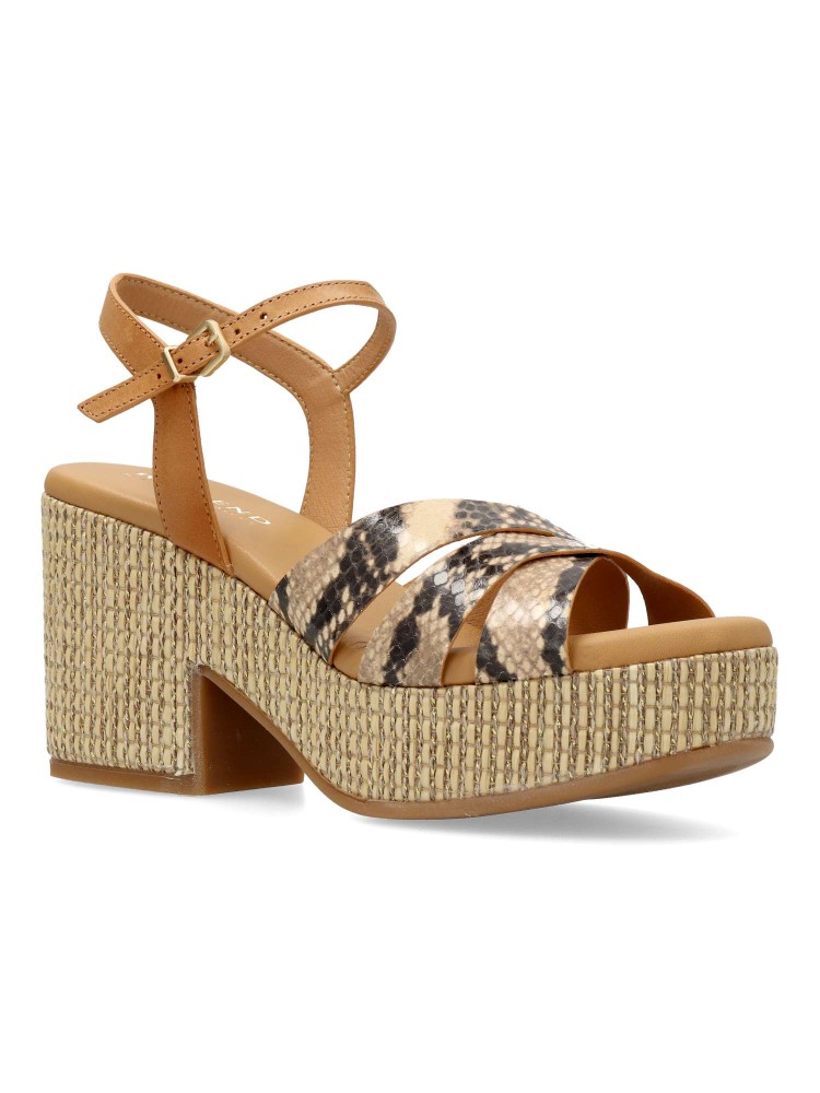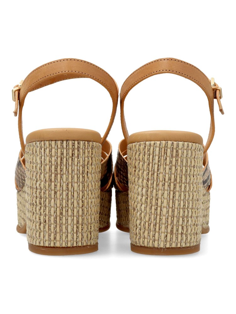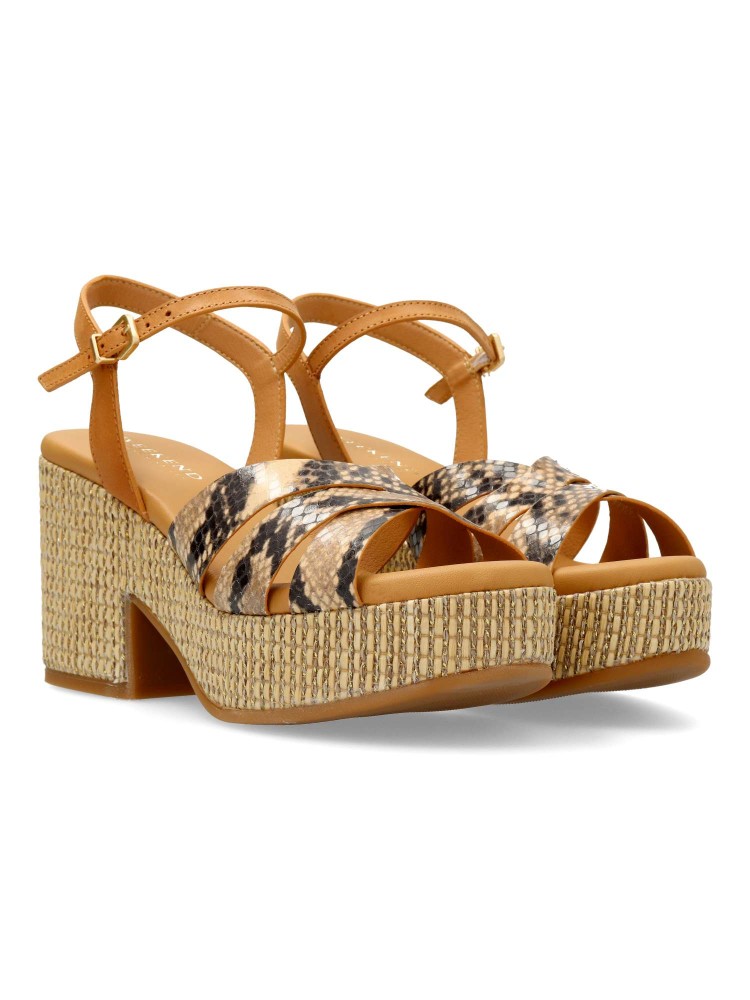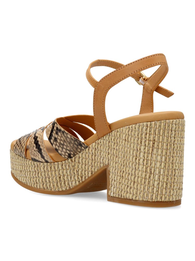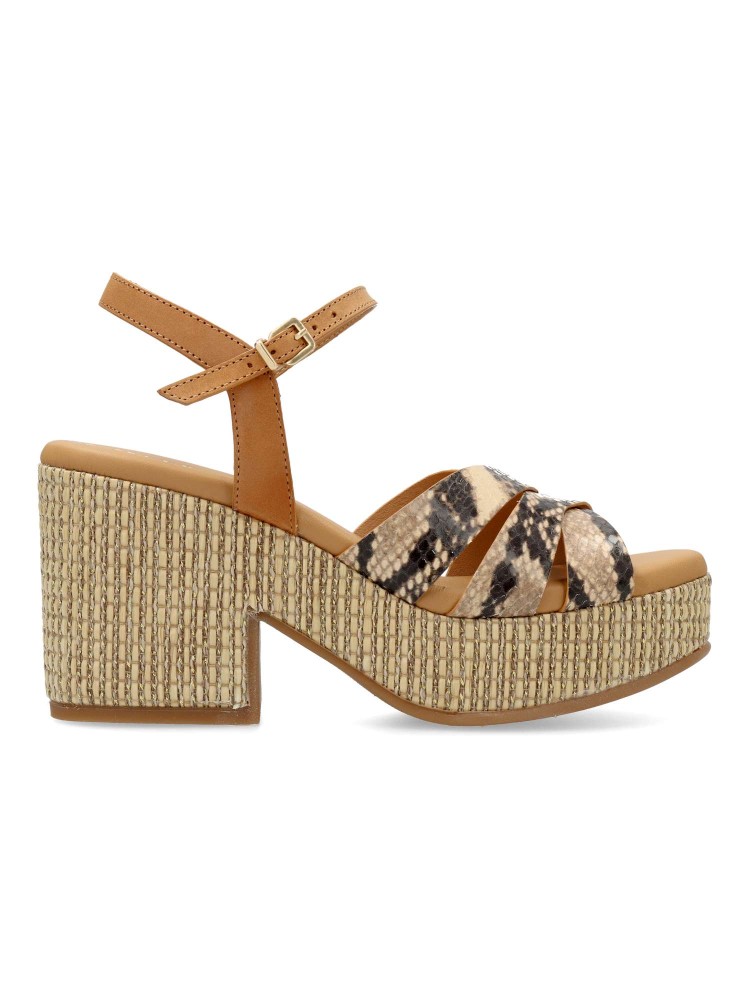 Sandalia de piel estampado serpiente, con plataforma de rafia. Cierre de hebilla. Un modelo tan atrevido como original. Diseñadas para lucirlas con comodidad en citas y eventos especiales. Plataforma con un efecto brillo que eleva su sofisticación.
