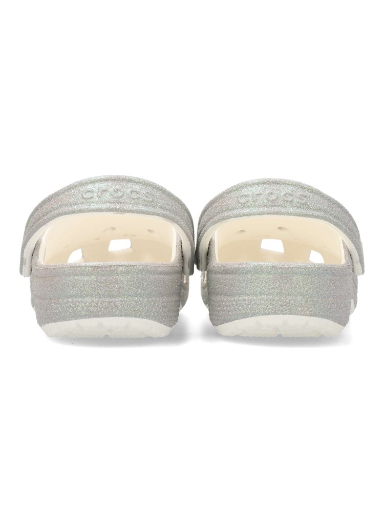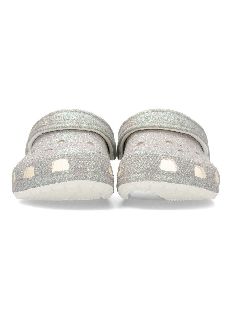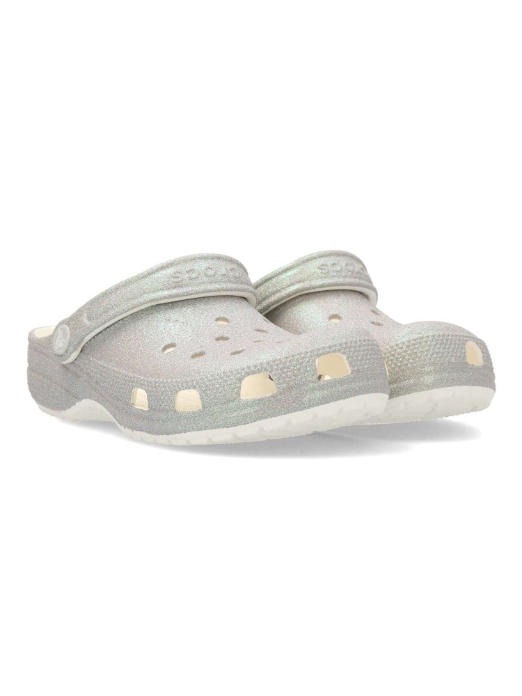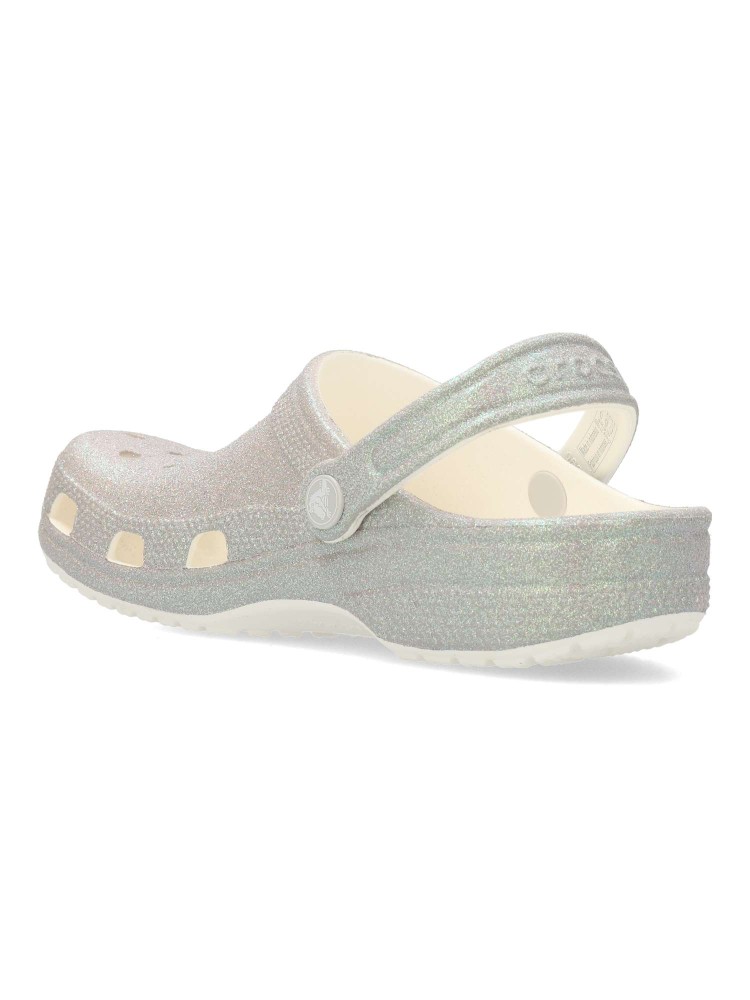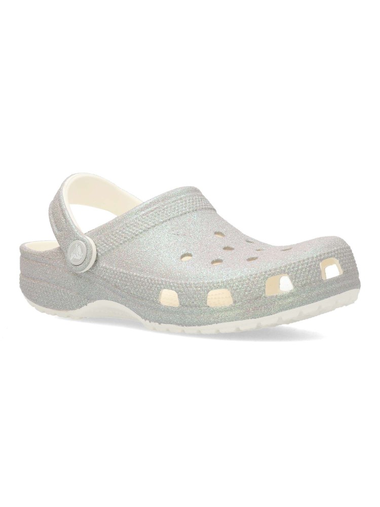 Zueco Classic, ofrece comodidad y soporte increíbles, gracias al material ligero y duradero Croslite™ y al diseño moldeado. Color blanco. Un nuevo tratamiento con purpurina iridiscente aporta un estilo extra a esta versión del icónico zueco.