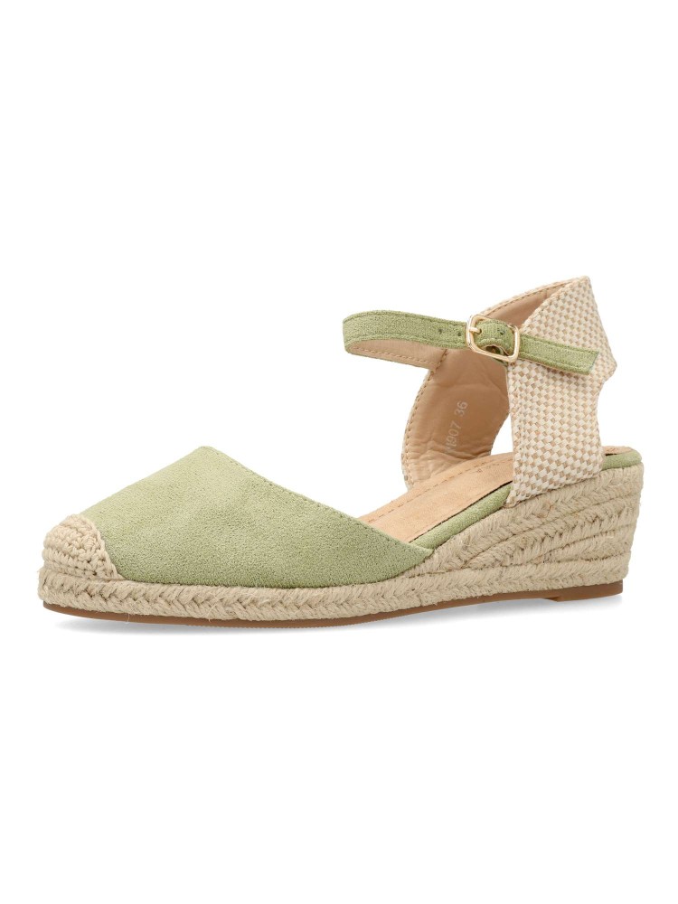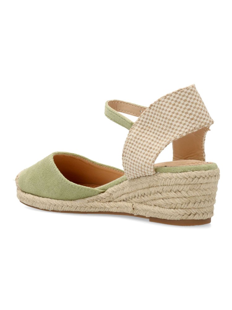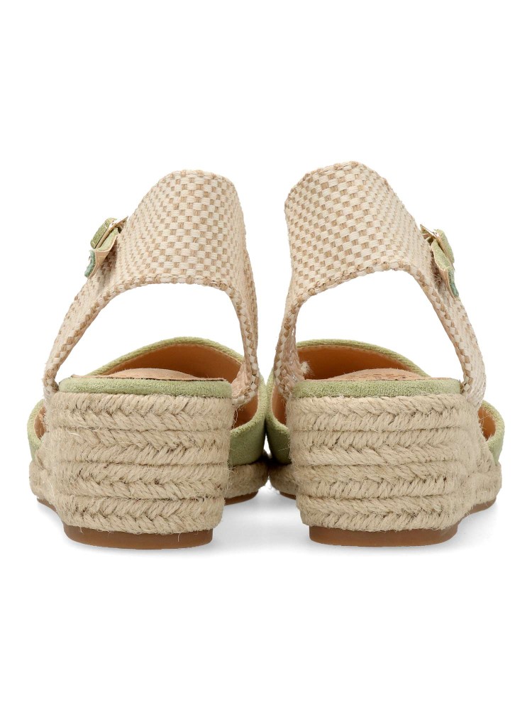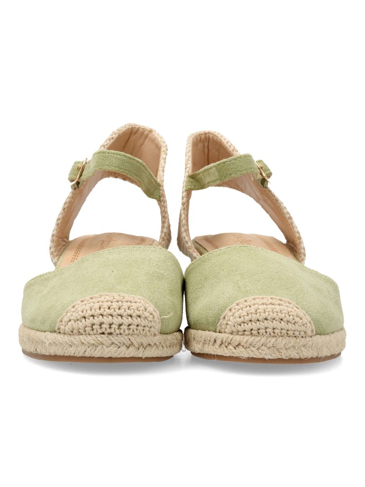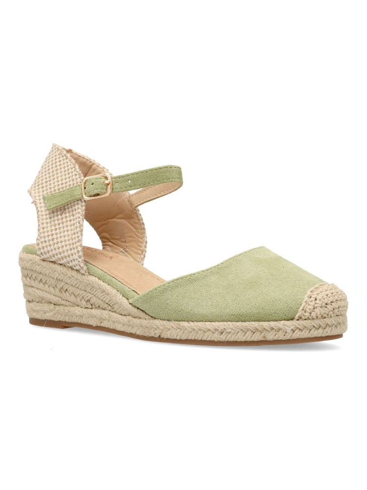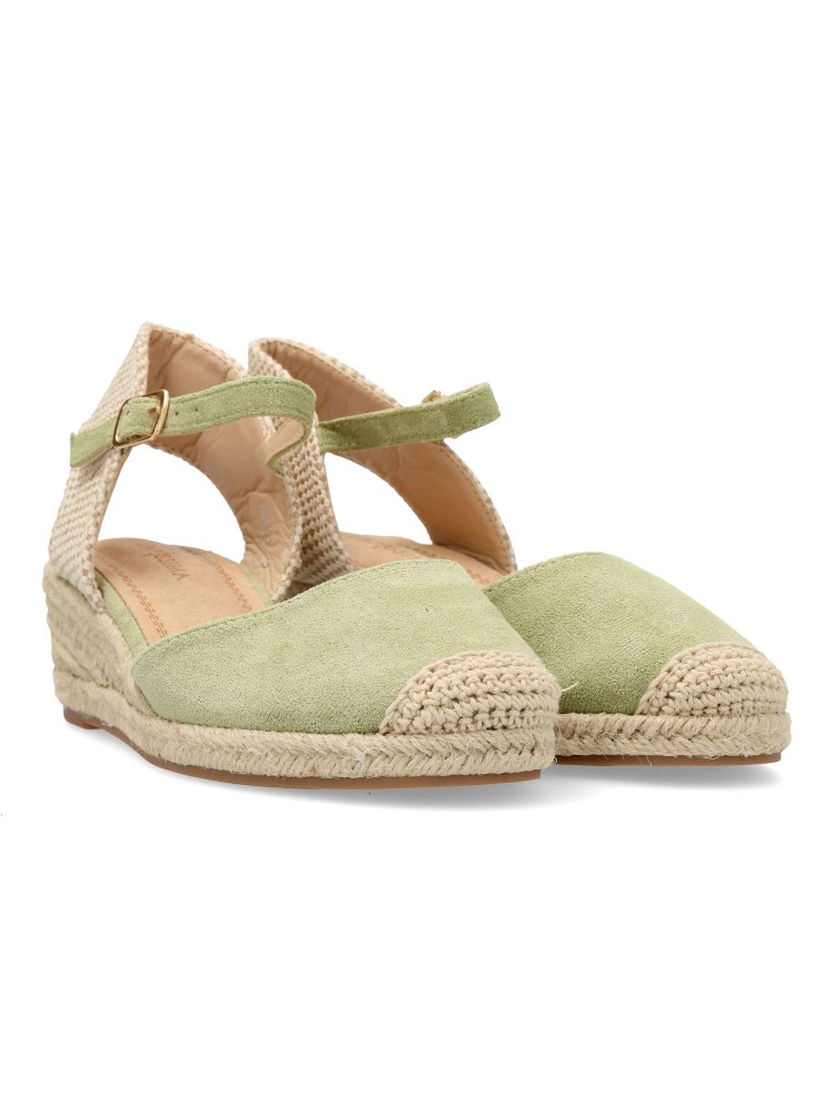 Sandalia valenciana de mujer, con cierre de hebilla. Alpargata cómoda, fabricada en textil antelina, con suela de yute sobre goma. Planta acolchada. Color verde. Pequeña cuña de 5 cm. Máximo confort en esta sandalia de esparto muy fácil de combinar.