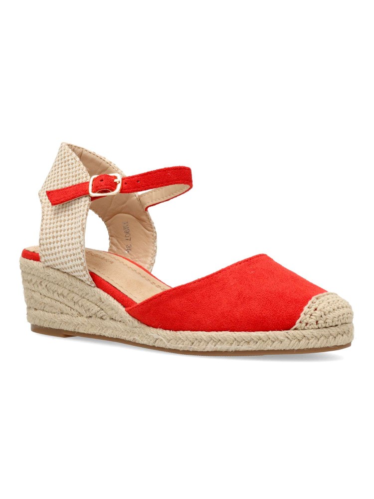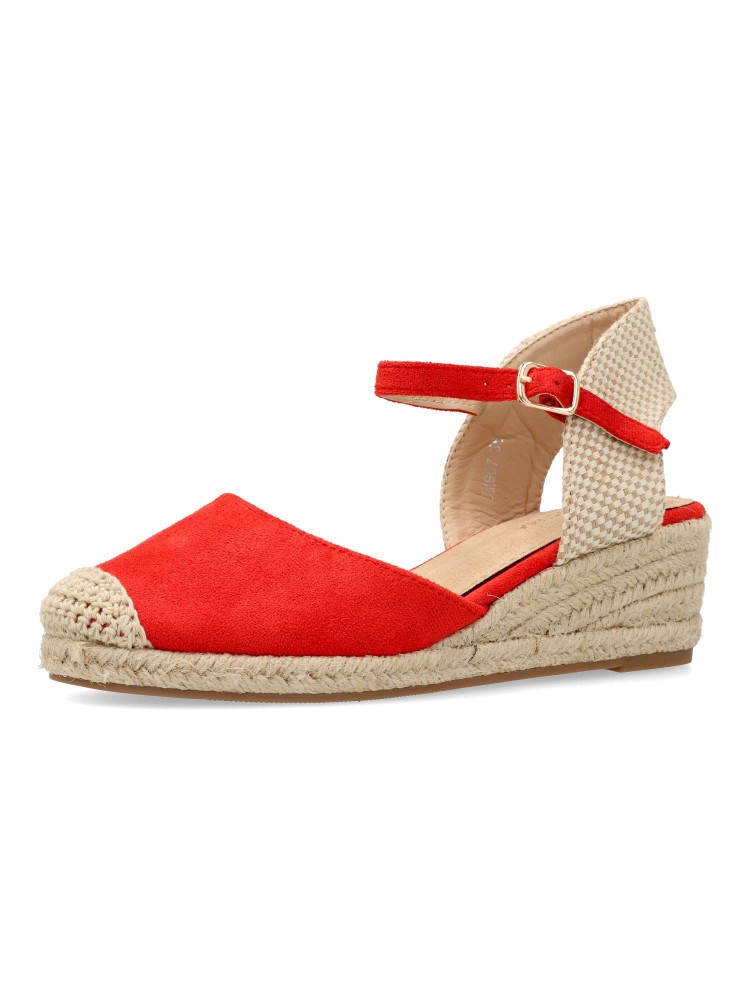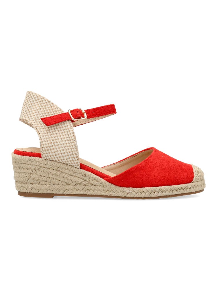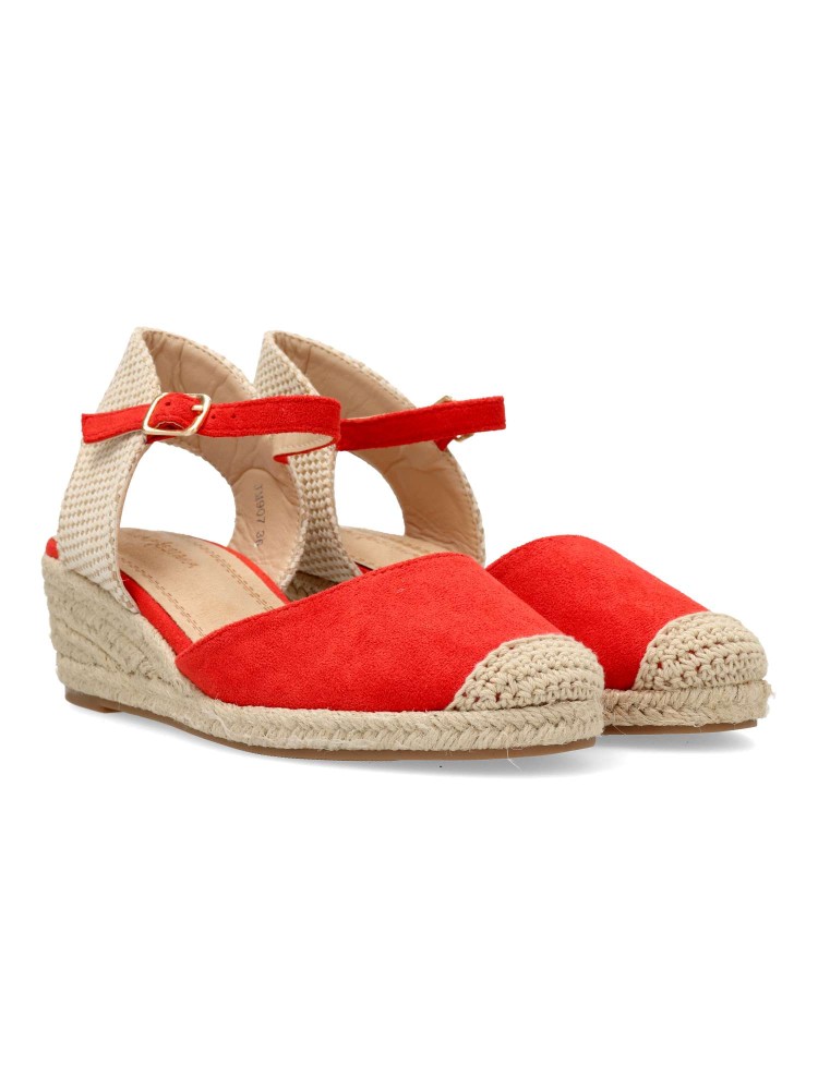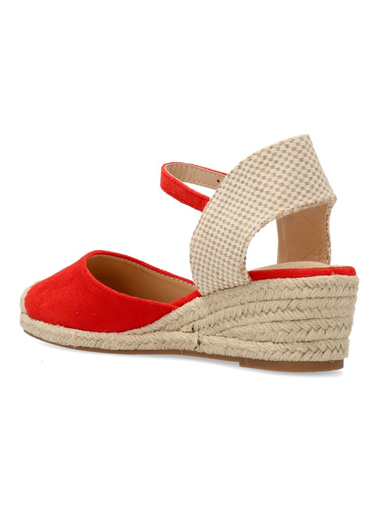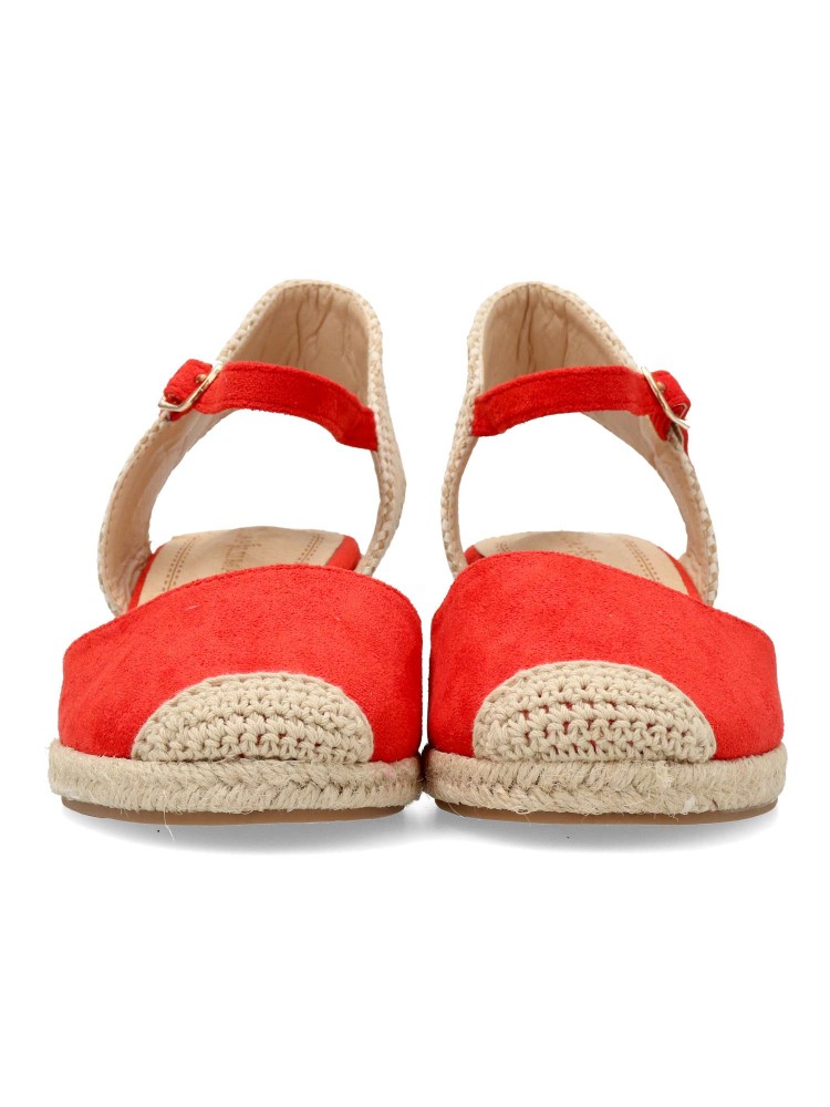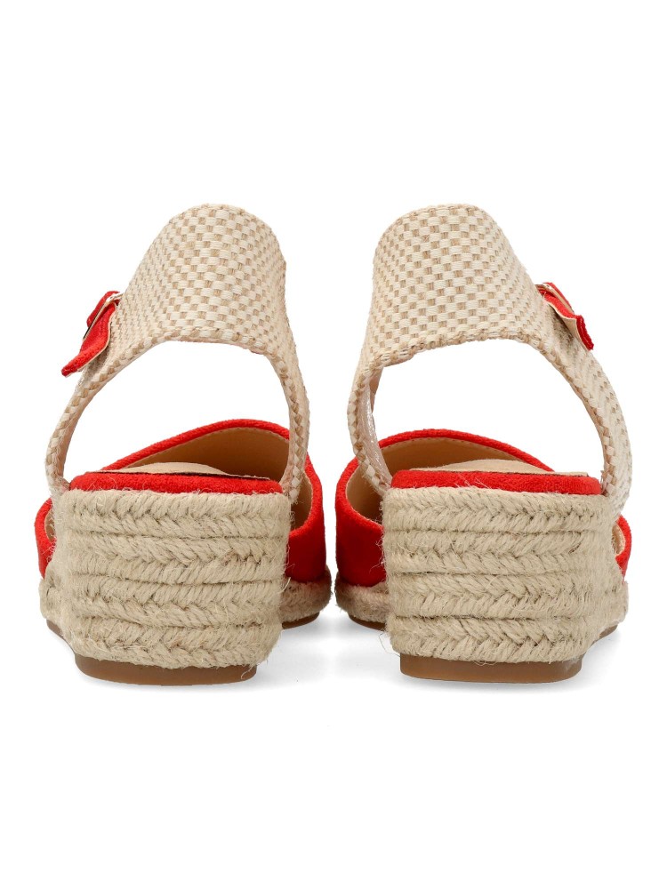 Sandalia valenciana de mujer, con cierre de hebilla. Alpargata cómoda, fabricada en textil antelina, con suela de yute sobre goma. Planta acolchada. Color rojo. Pequeña cuña de 5 cm. Máximo confort en esta sandalia de esparto muy fácil de combinar.