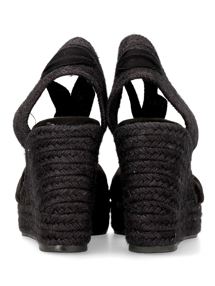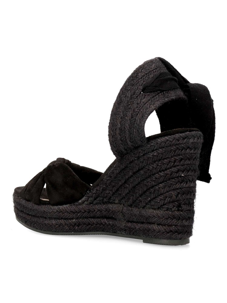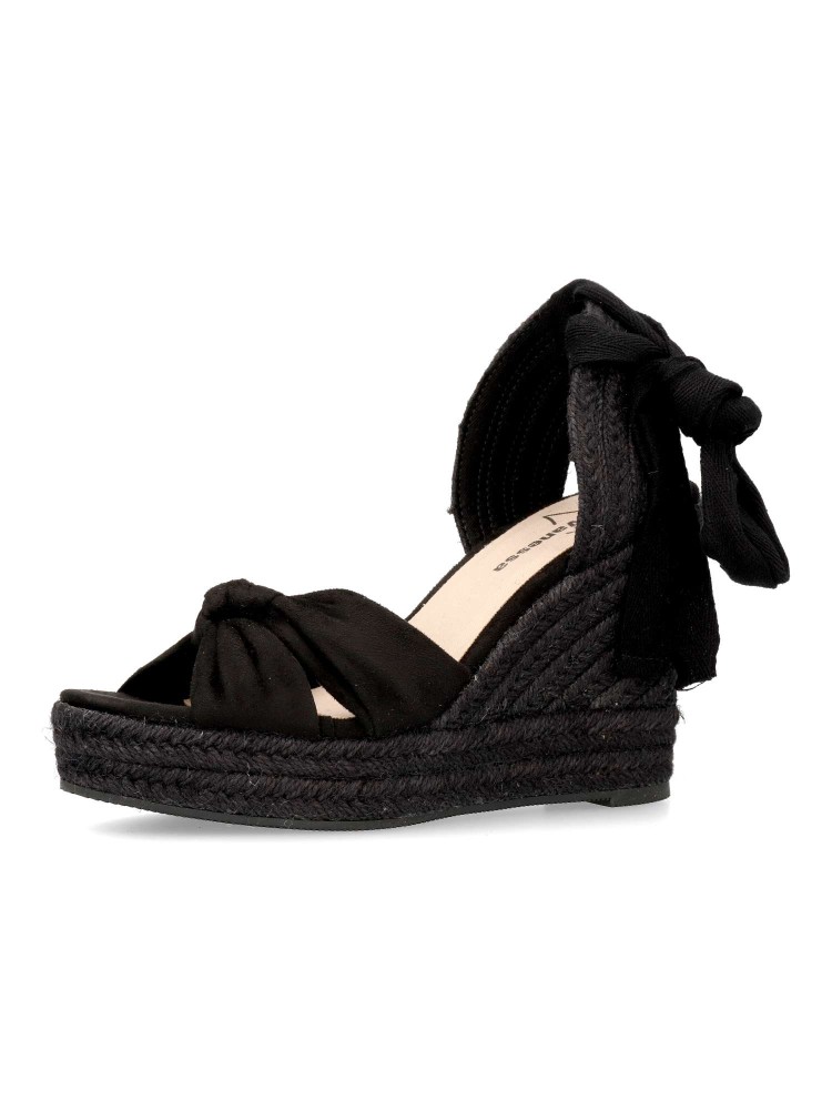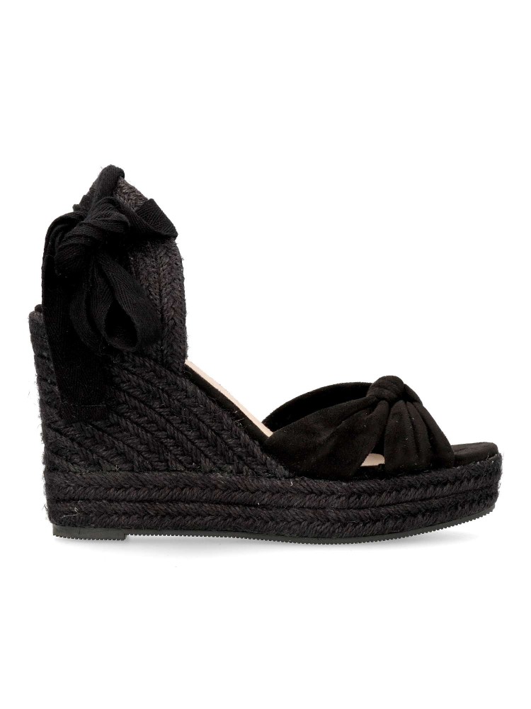 Sandalia esparteña yute de mujer. Cierre mediante cintas al tobillo. Alpargata con pala de tiras anudada y suela de yute sobre goma. Disponible en color negro. Cuña de 9,5 cm. Sandalia versátil para combinar con tus outfits de verano.