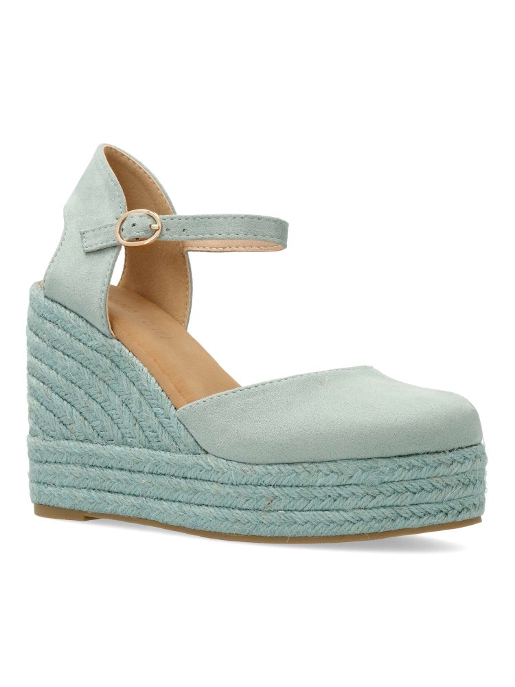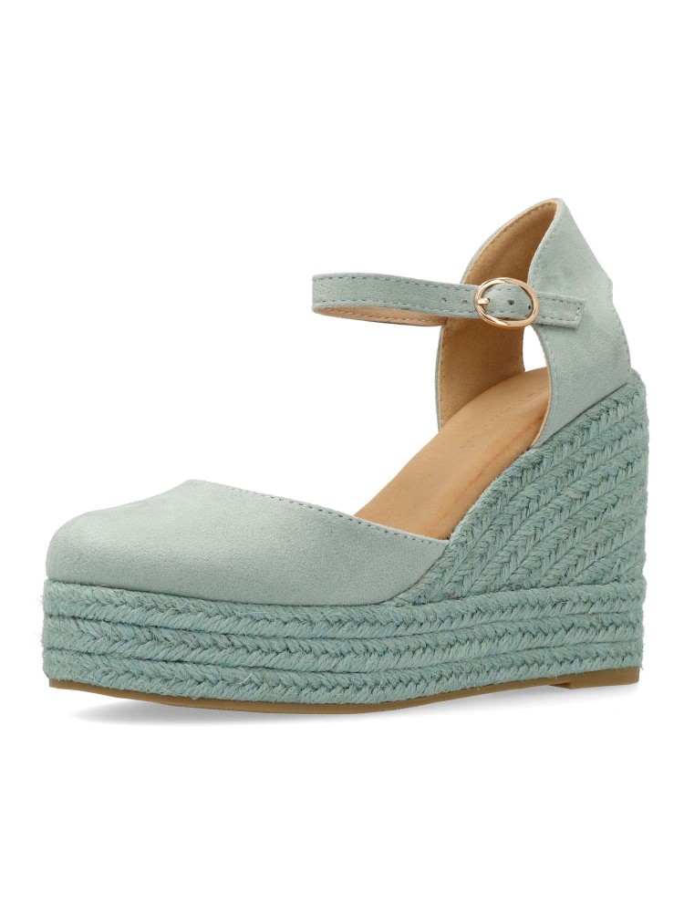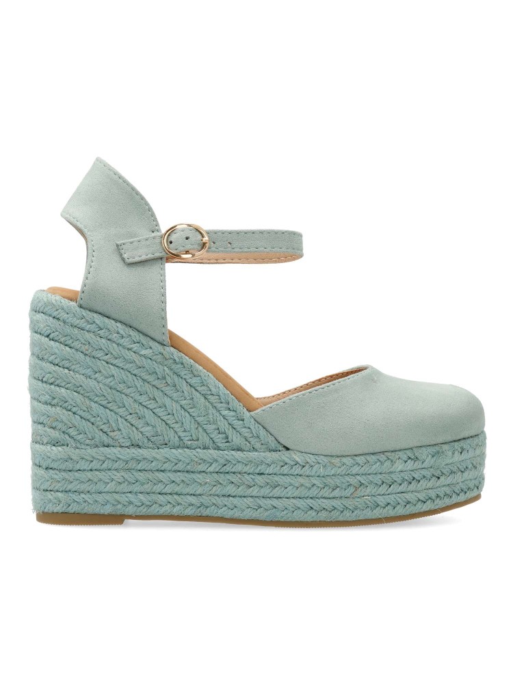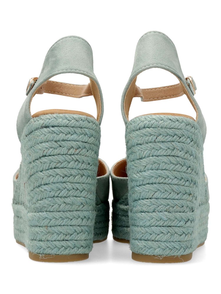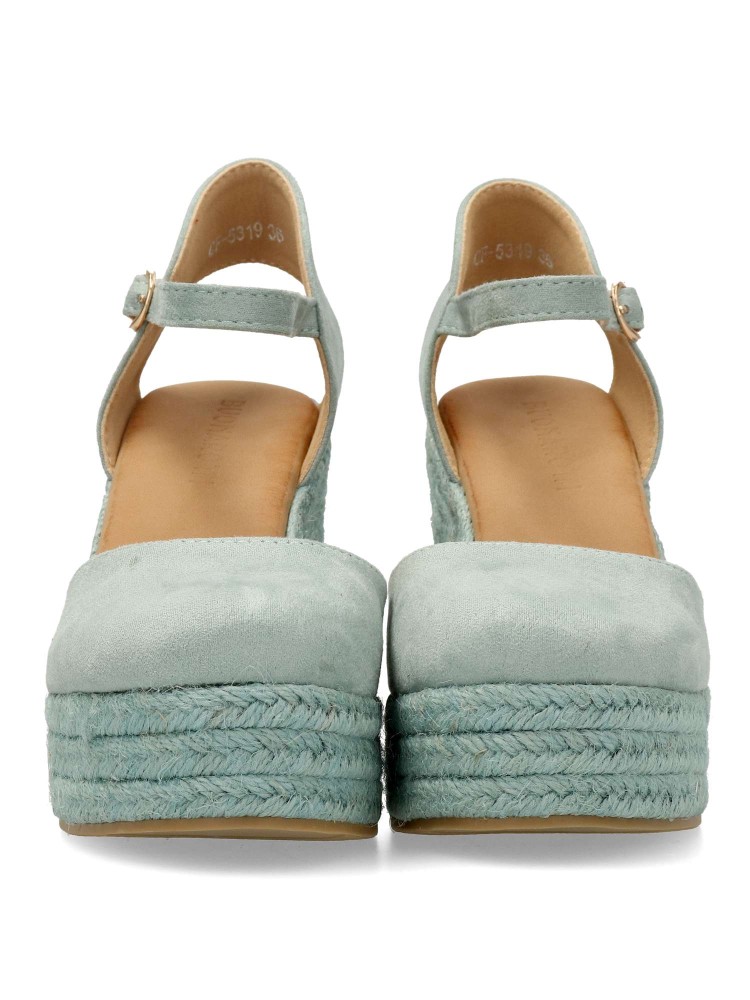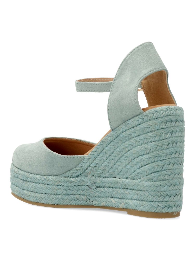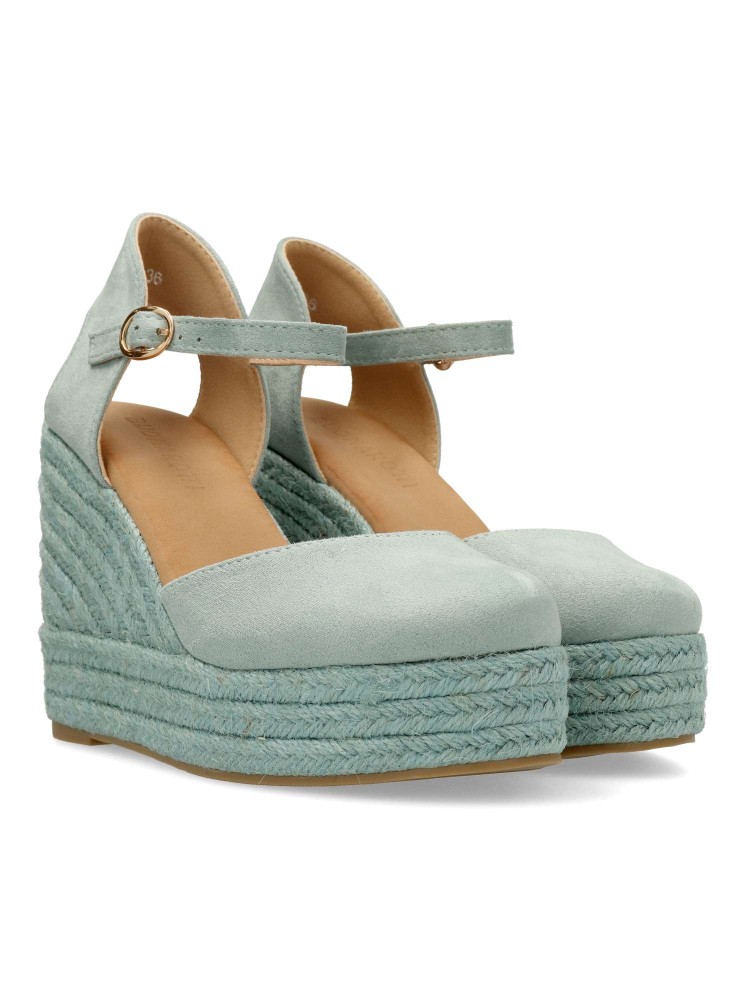 Sandalia esparteña yute de mujer. Cierre de hebilla al tobillo. Alpargata fabricada en textil antelina, con suela de yute sobre goma. Color aguamar. Altura 10 cm. Plataforma de 3 cm. Valenciana clásica para combinar con tus looks de temporada.