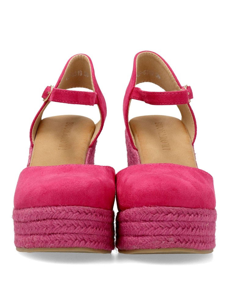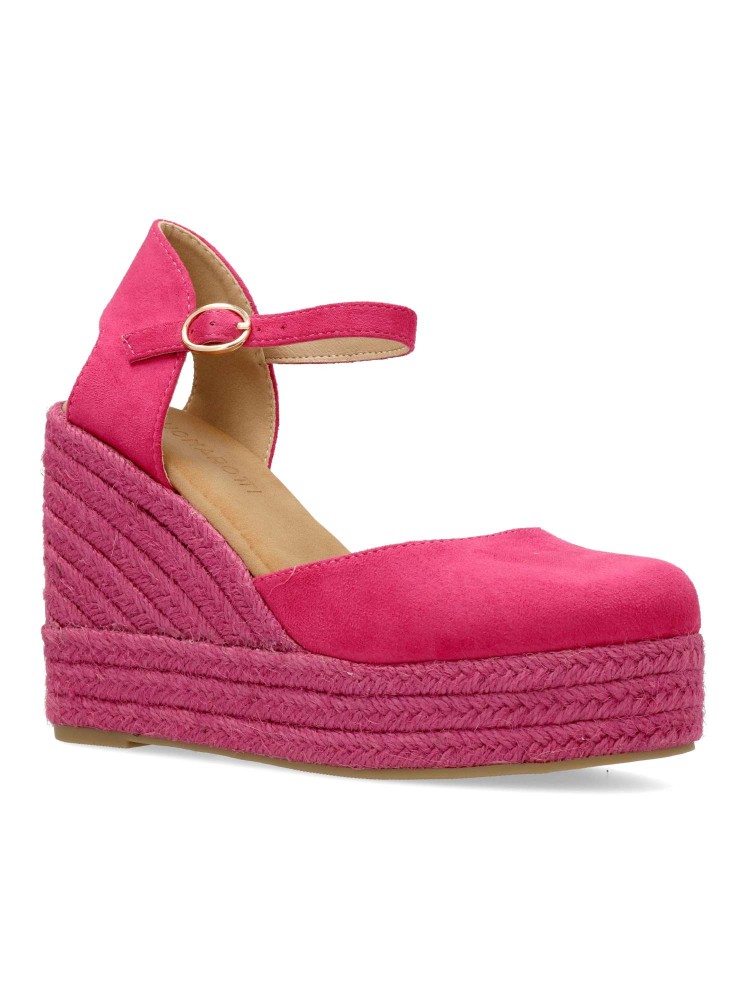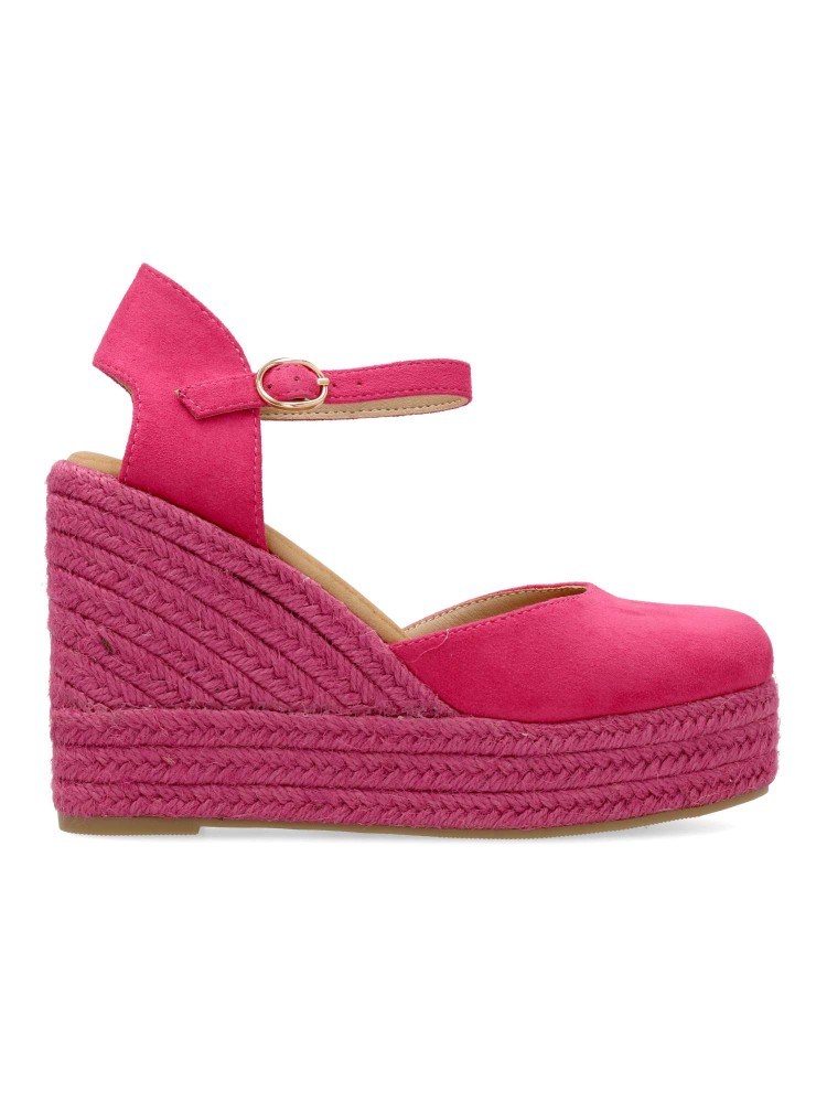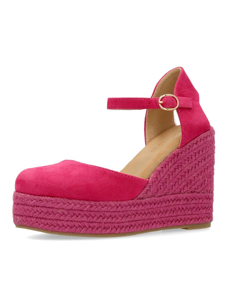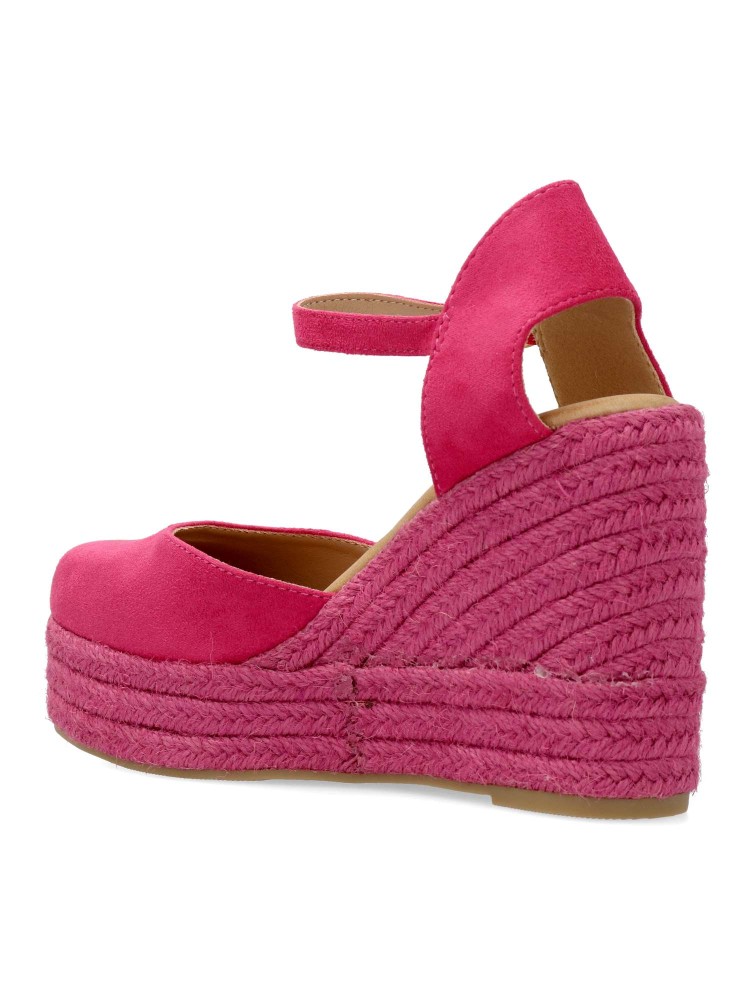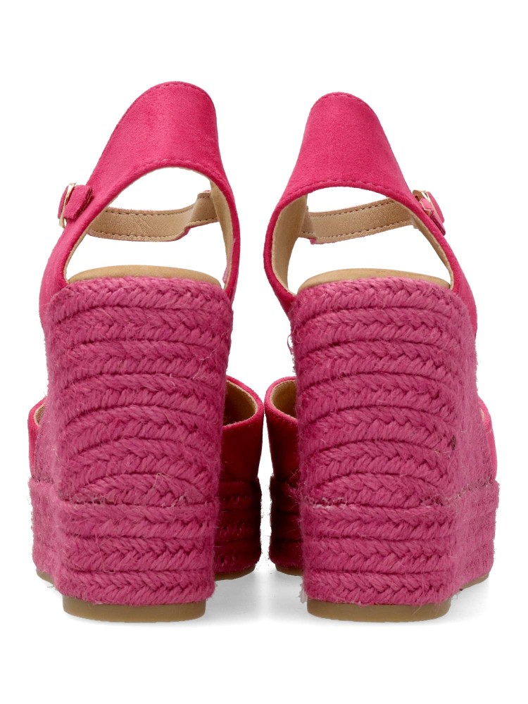 Sandalia esparteña yute de mujer. Cierre de hebilla al tobillo. Alpargata fabricada en textil antelina, con suela de yute sobre goma. Color fucsia. Altura 10 cm. Plataforma de 3 cm. Valenciana clásica para combinar con tus looks de temporada.