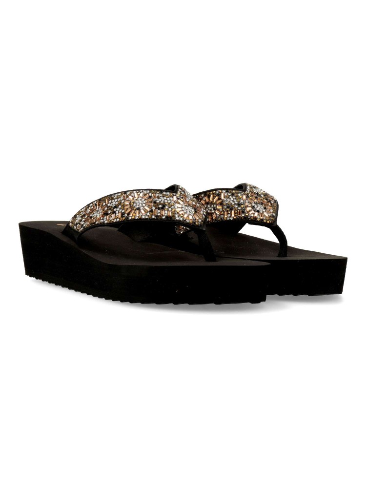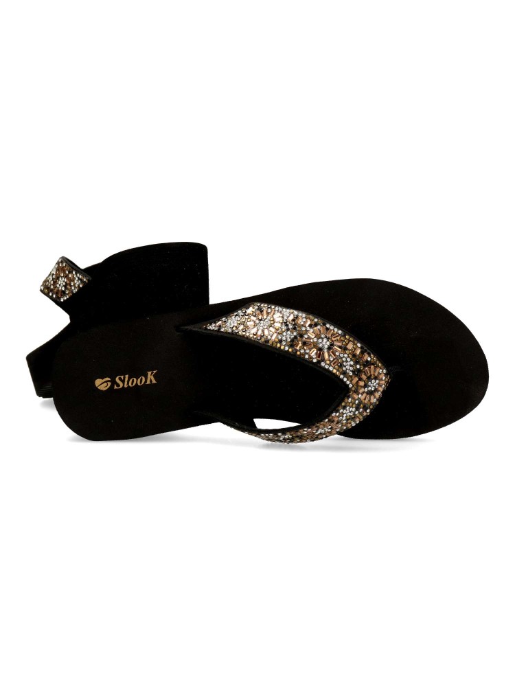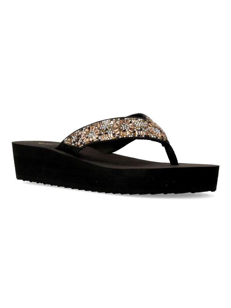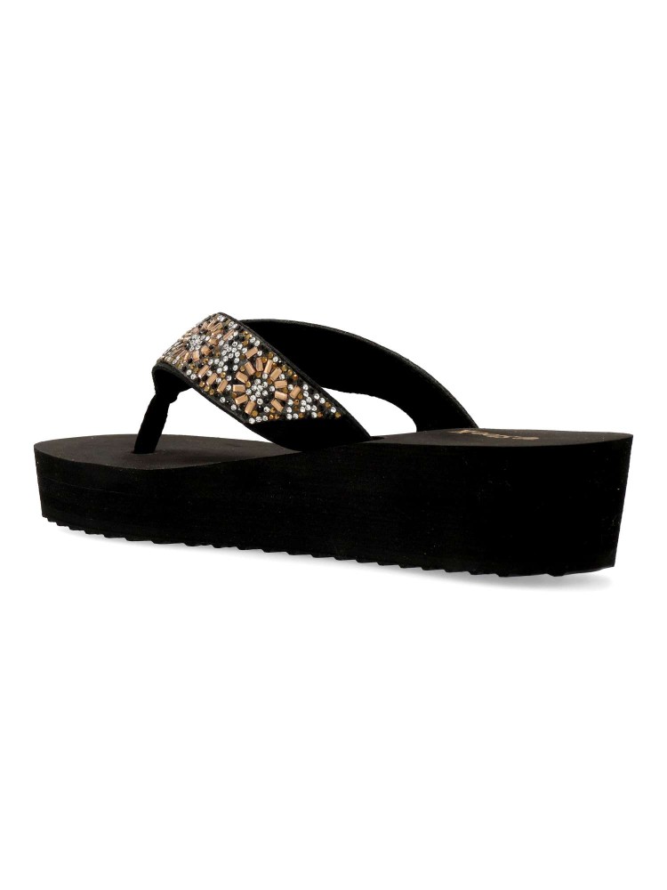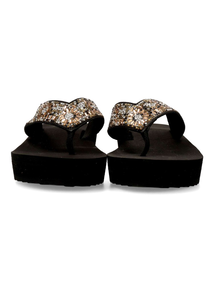 Sandalia de mujer tipo esclava. Fabricada en piel sintética, con suela de goma EVA. Detalle de pedrería con brillo. Disponible en color negro. Pequeña cuña de 4 cm. Diseño elegante, versátil, innovador y confort para combinar con tus looks de verano.