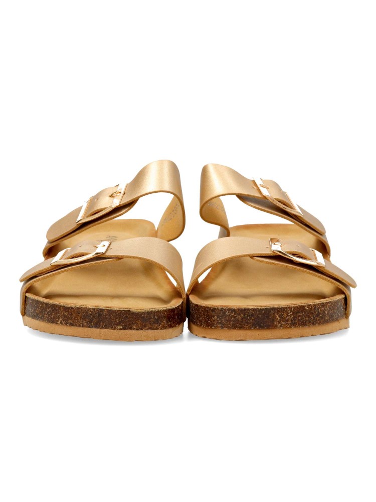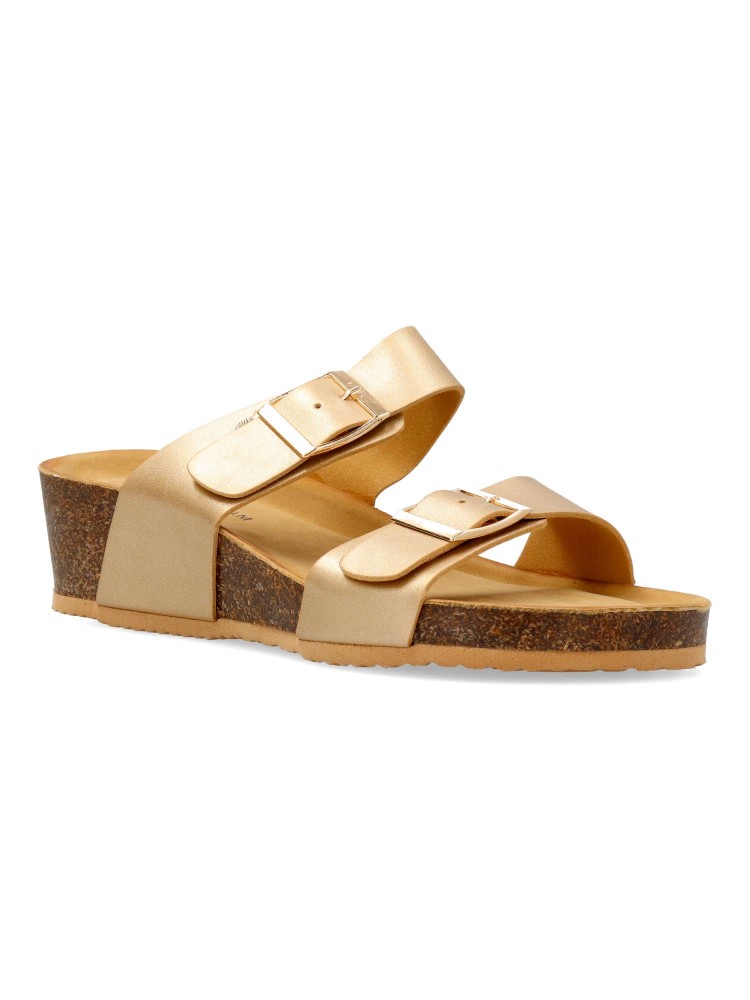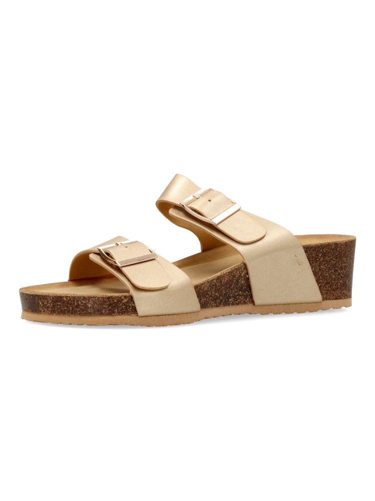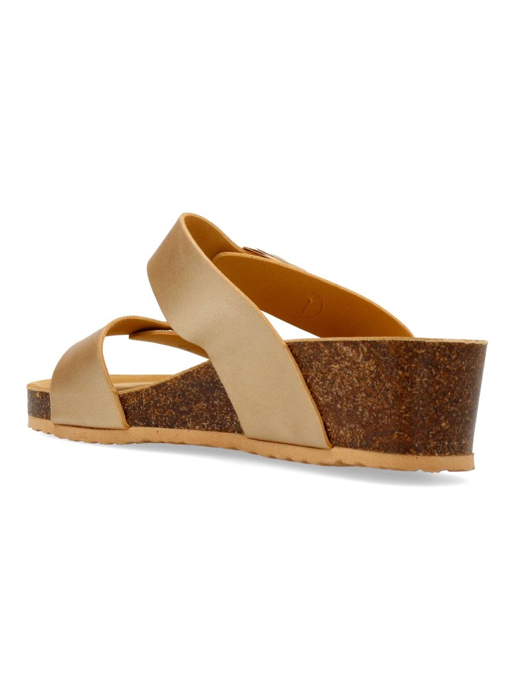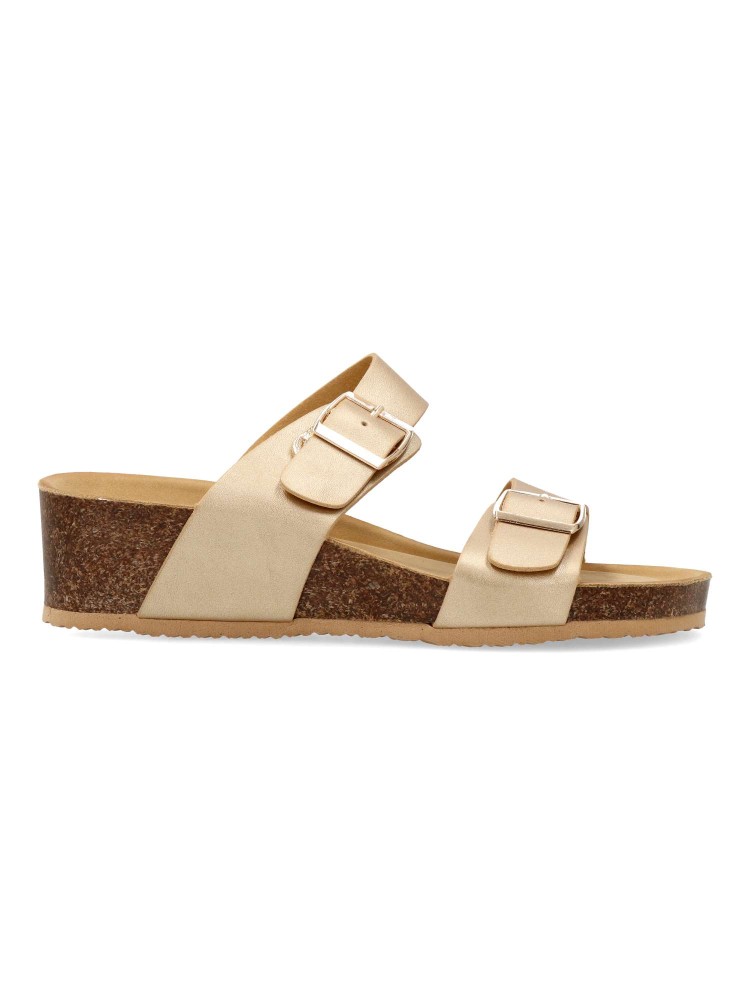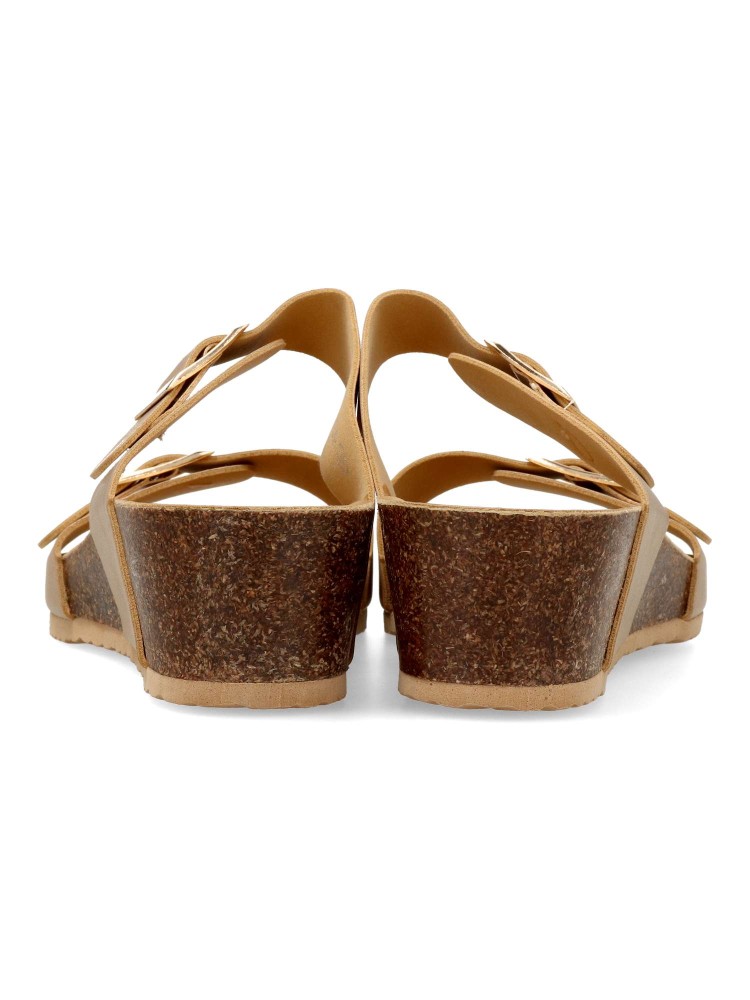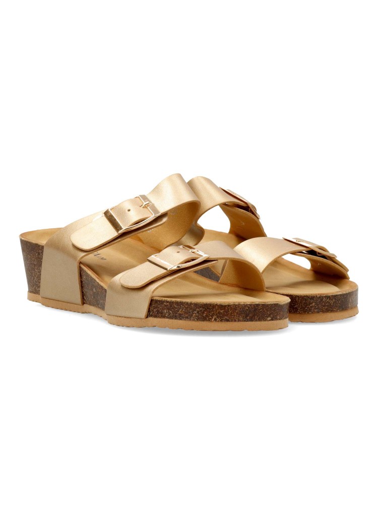 Sandalia bio de mujer. Modelo con pala de dos tiras y ajuste de hebillas. Fabricado en piel sintética color oro. Suela de corcho sobre goma EVA. Altura cuña 4 cm. Diseño versátil, elegante y fresco, con el que estarás cómoda todo el verano.