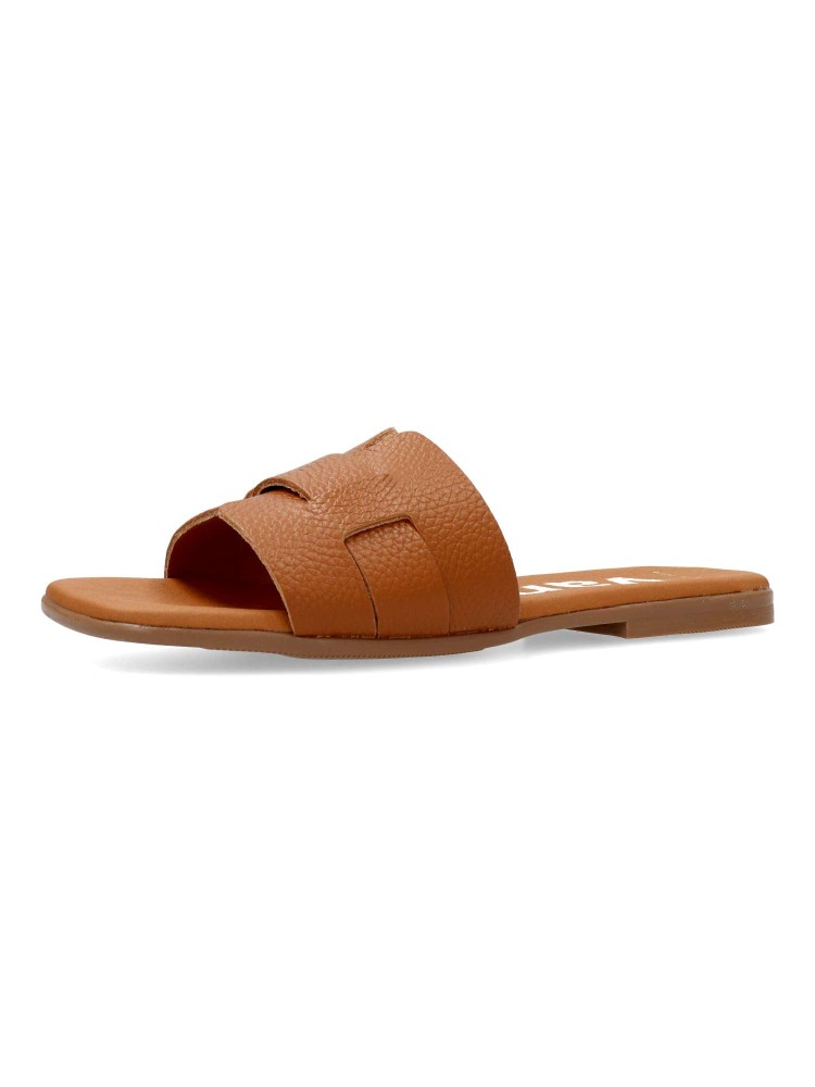 Sandalia cómoda de pala con tira cruzada. Fabricado en piel color cuero, con suela de goma flexible. Forros y plantillas 100% transpirables. Planta acolchada. Todo un básico que te ofrece confort y bienestar en tus paseos de verano. Hecho en España.