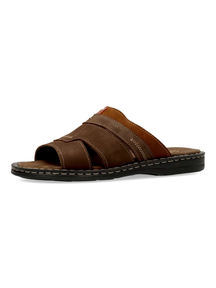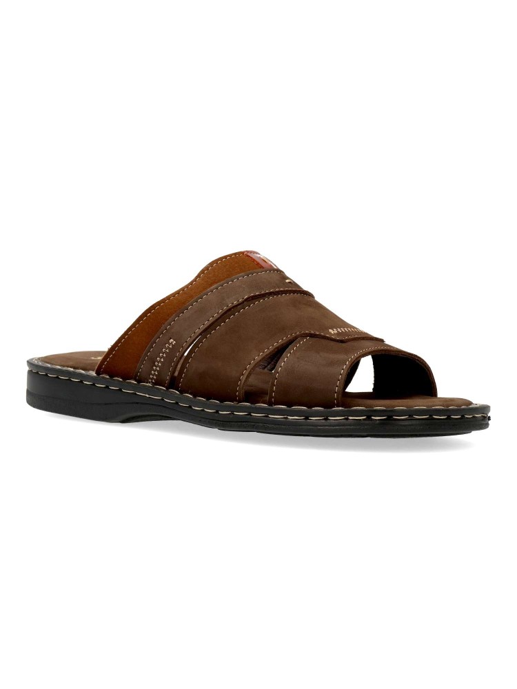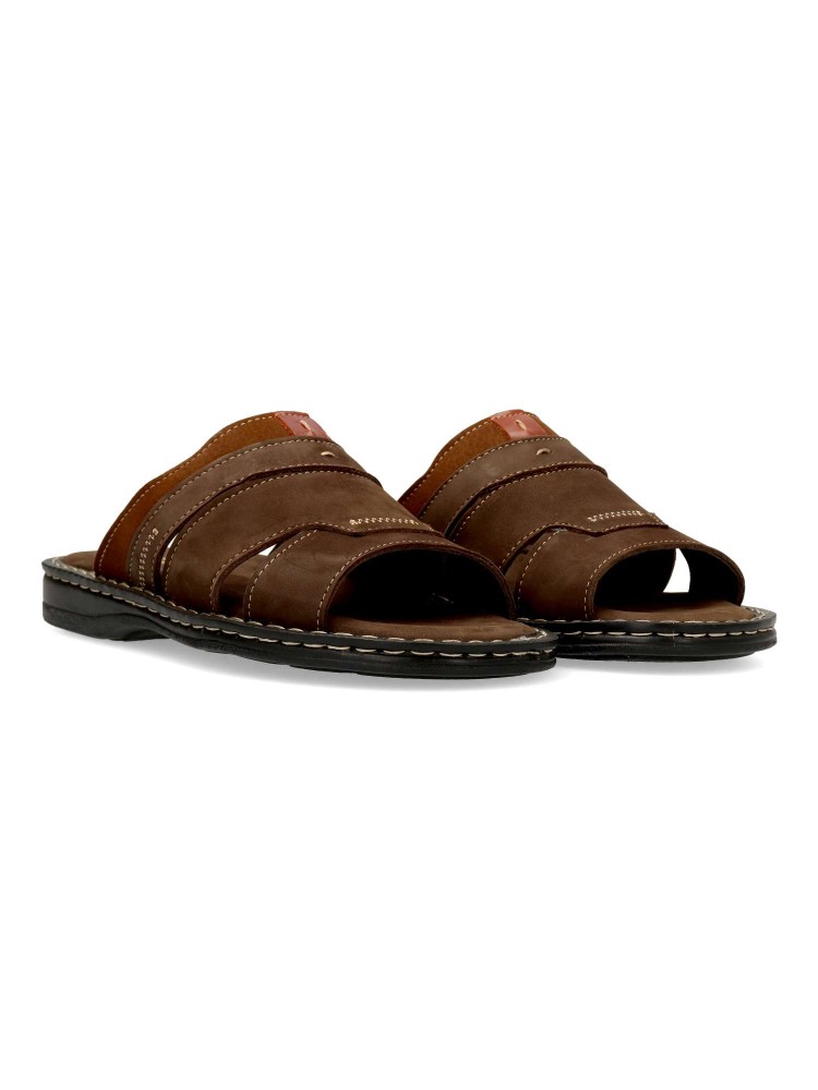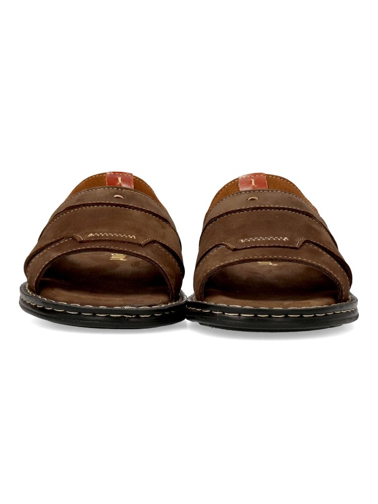 Sandalia cómoda de hombre, fabricada en piel nobuck suave. Modelo de pala, con planta acolchada de piel. Suela de goma flexible y ligera. Disponible en color marrón oscuro. Diseño clásico para el máximo confot en tus paseos de verano.