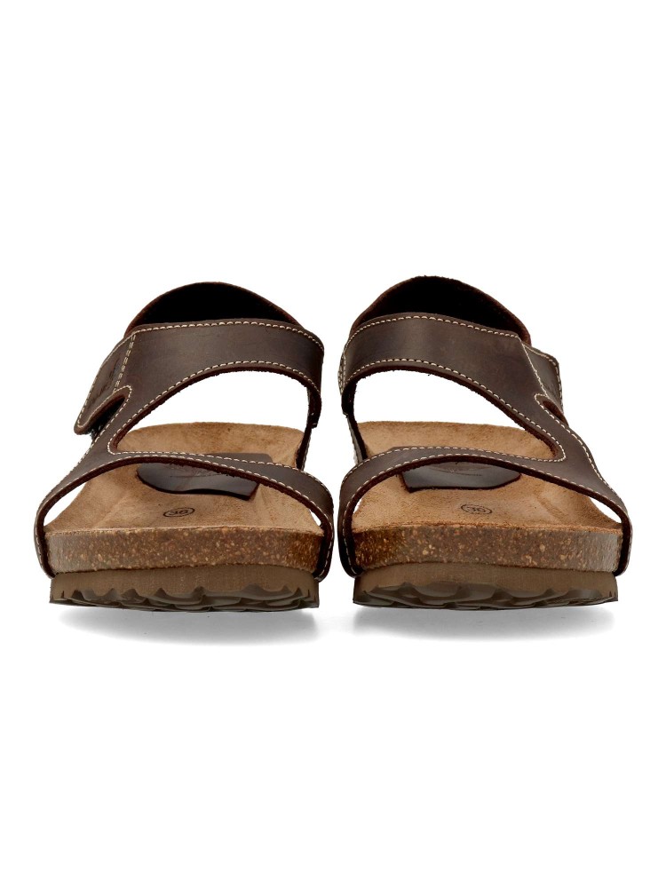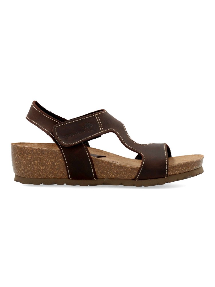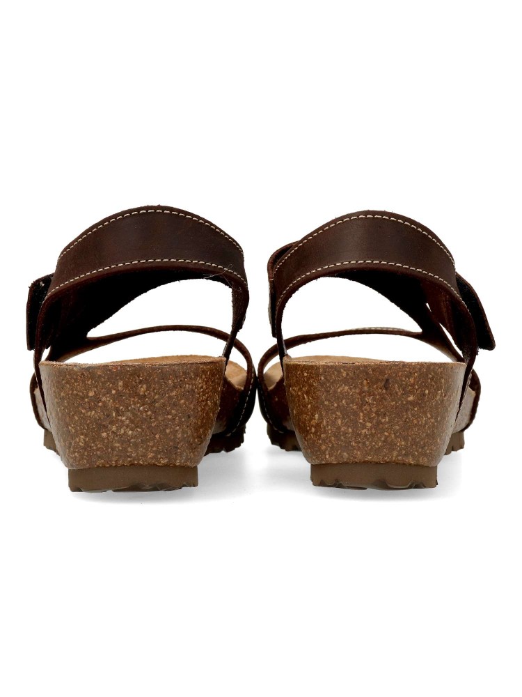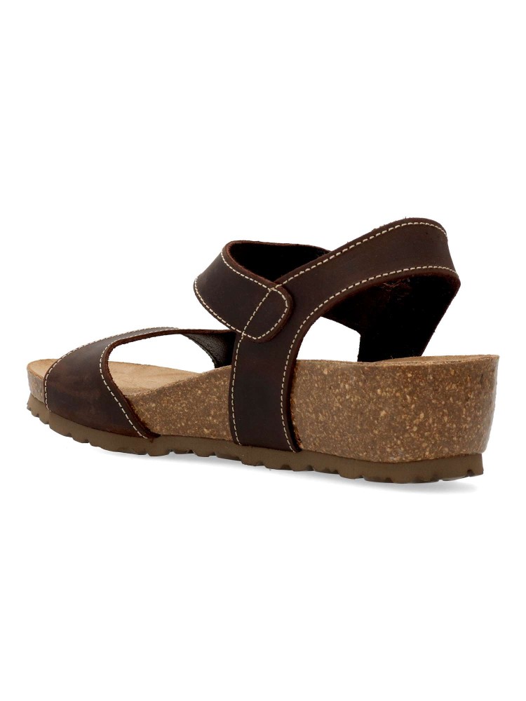 Sandalia cómoda de mujer, fabricada en piel natural. Suela de corcho sobre goma. Altura cuña 3,5 cm. Disponible en color moka. Modelo de tiras con cierre adherente. Ideal para combinar con tus outfits de verano. Fabricado en España.