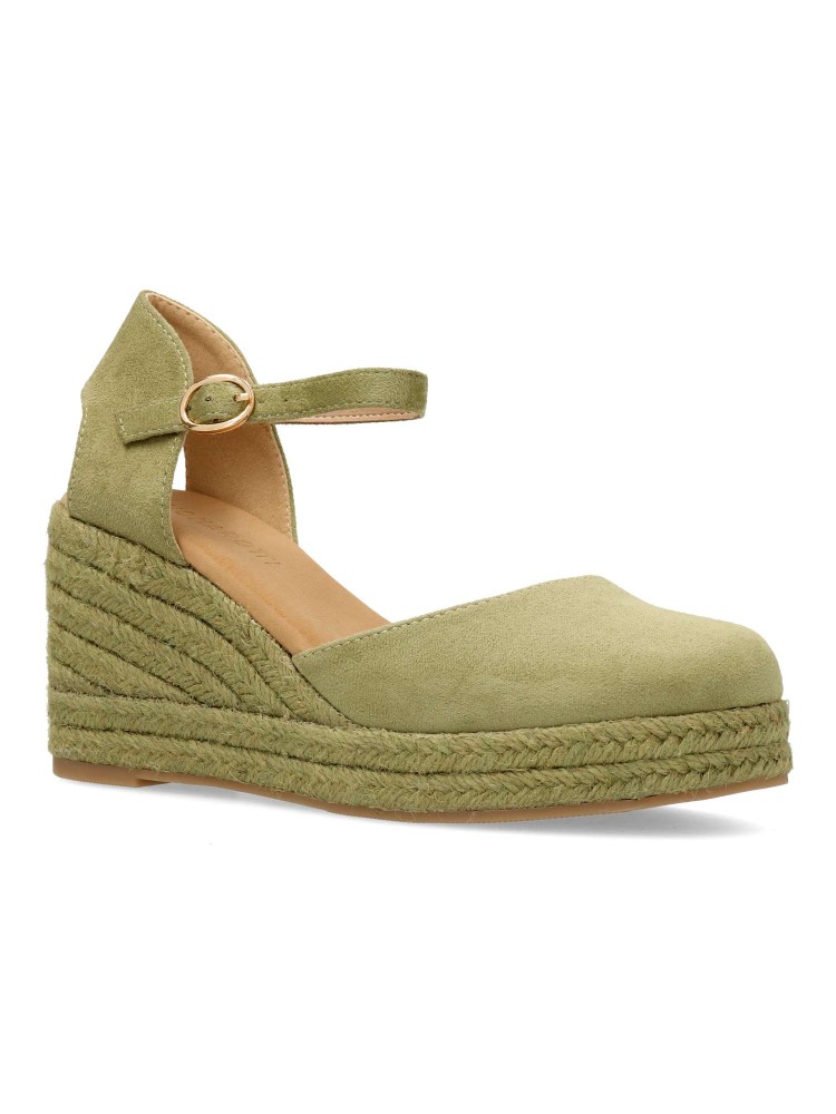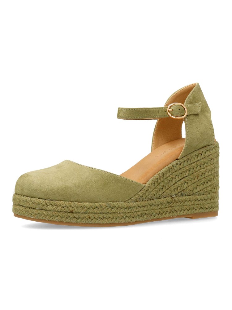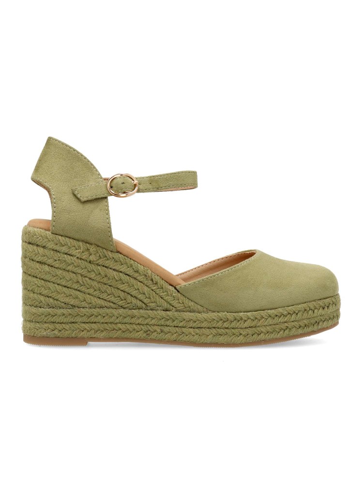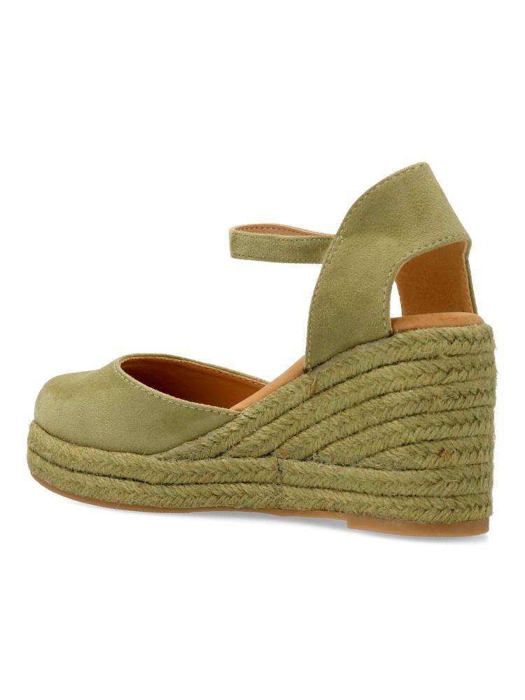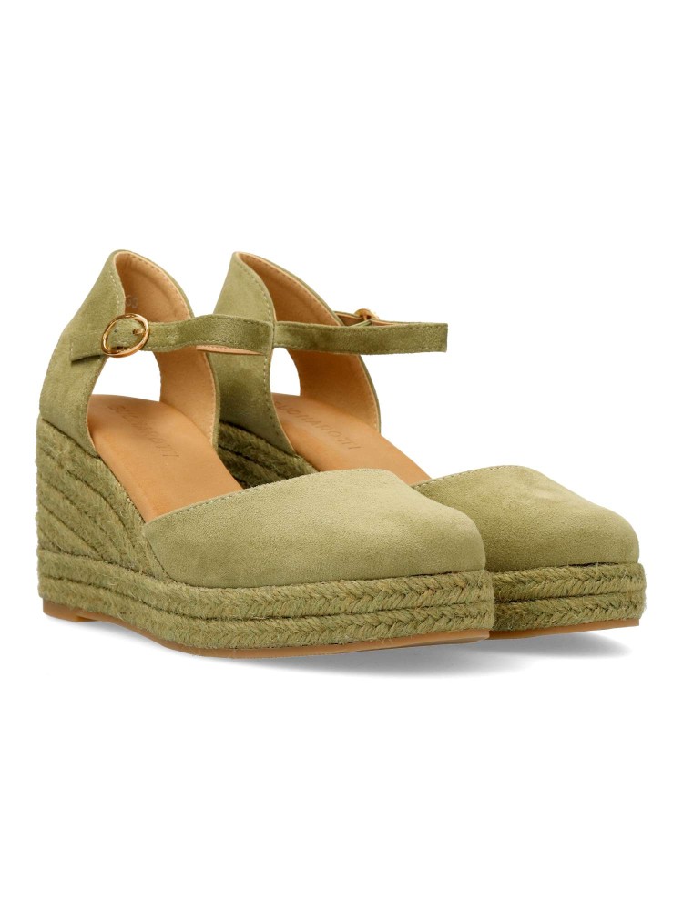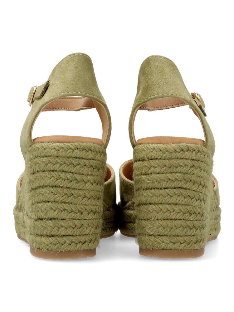 Sandalia esparteña yute de mujer. Cierre de hebilla al tobillo. Alpargata fabricada en textil antelina, con suela de yute sobre goma. Color verde. Altura 8 cm. Plataforma de 2,5 cm. Valenciana clásica para combinar con tus looks de temporada.