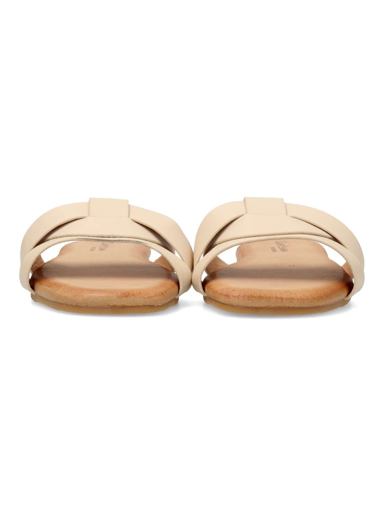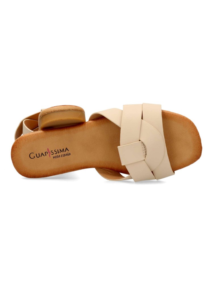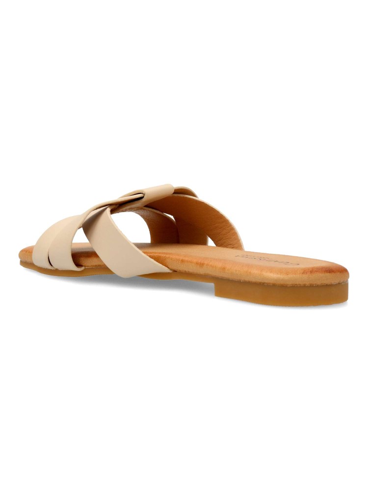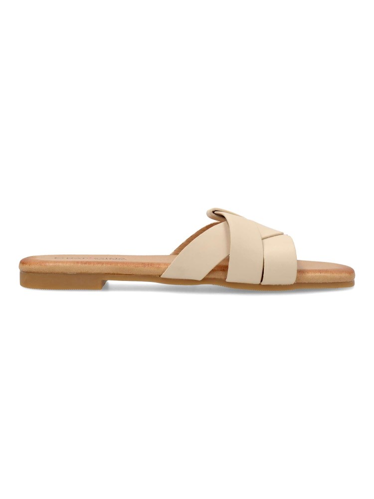 Sandalia plana de mujer. Modelo de pala con tiras entrelazadas. Fabricada en piel sintética, con suela de goma flexible. Planta acolchada. Color camel. Diseño cómodo, elegante y fresco, fácil de combinar con todos tus looks de verano.