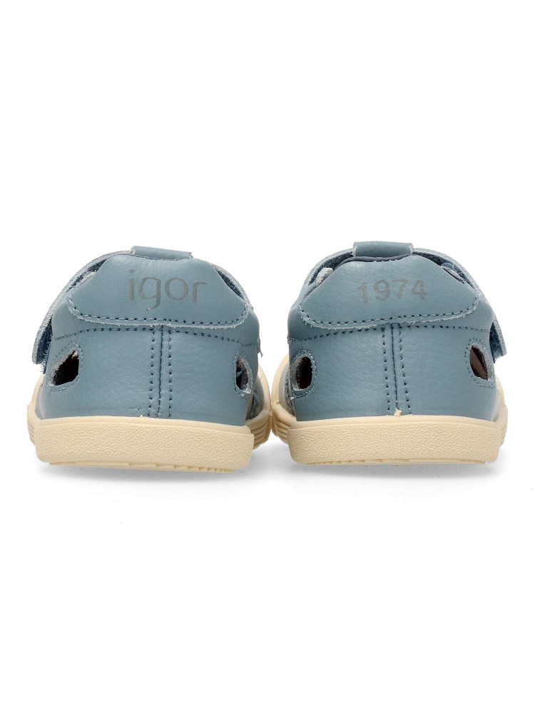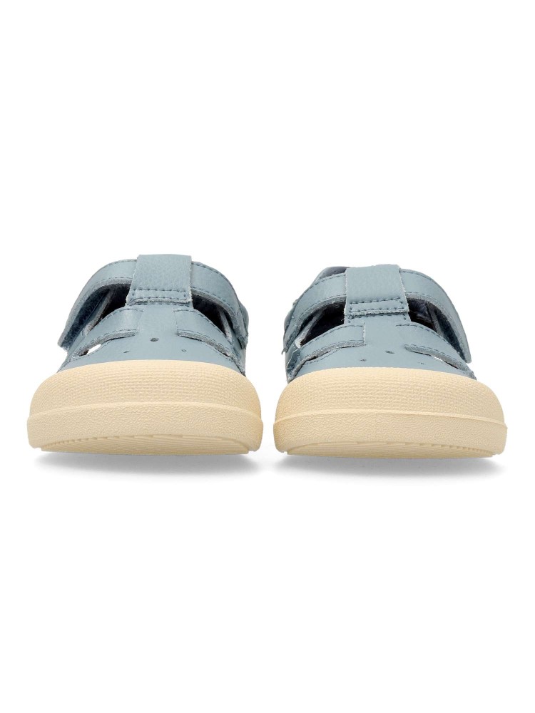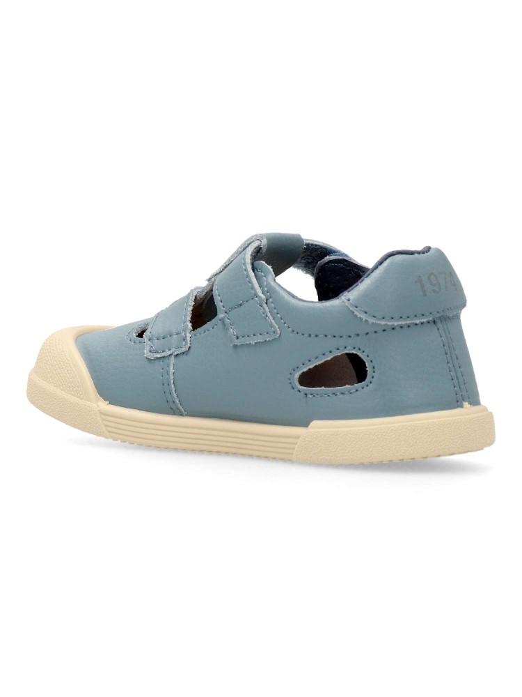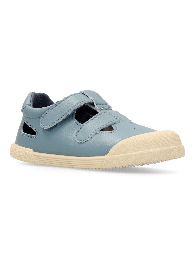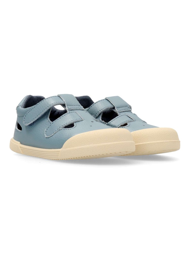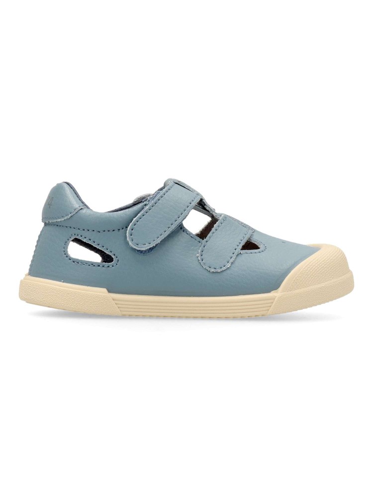 Sandalia cangrejera de piel, de concepto barefoot medium, con la puntera mucho más ancha que en modelos anteriores, cero drop, flexible, blandita y plantilla extraíble. Cierre adherente. Color azul. 100% Fabricado en España.