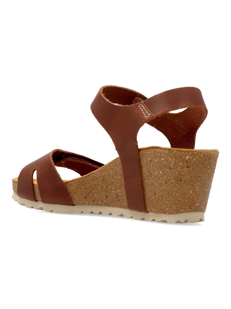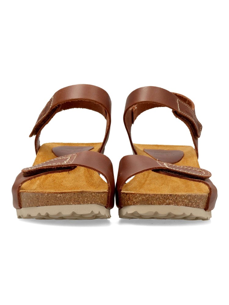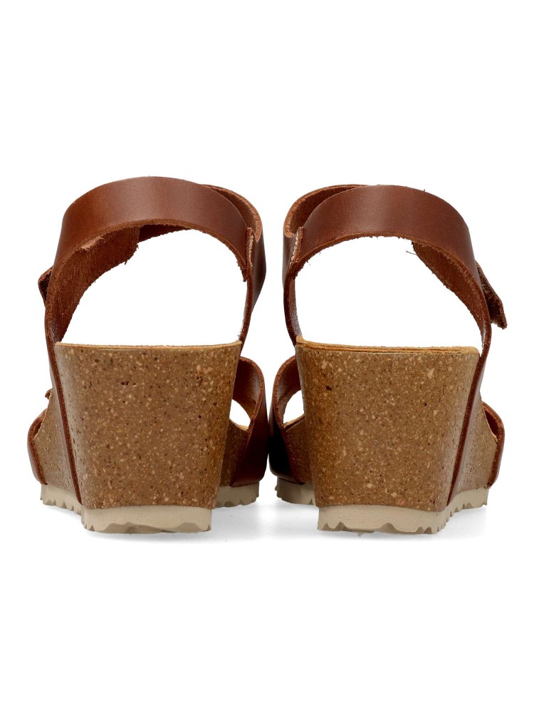 Sandalia cómoda de mujer, fabricada en piel natural. Suela de corcho sobre goma. Altura cuña 5,5 cm. Disponible en color cuero. Modelo con cierre adherente al tobillo y pala ajustable. Ideal para combinar con tus looks de verano. Fabricado en España.
