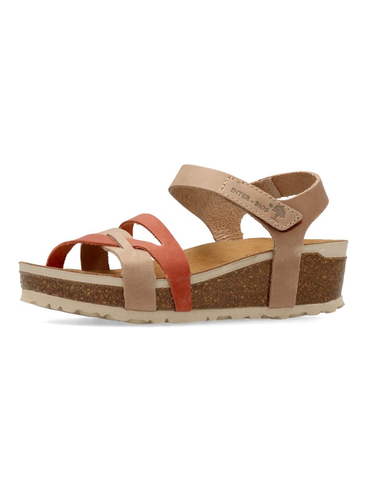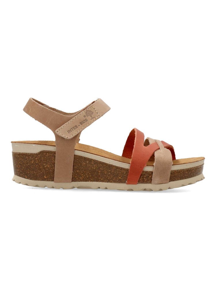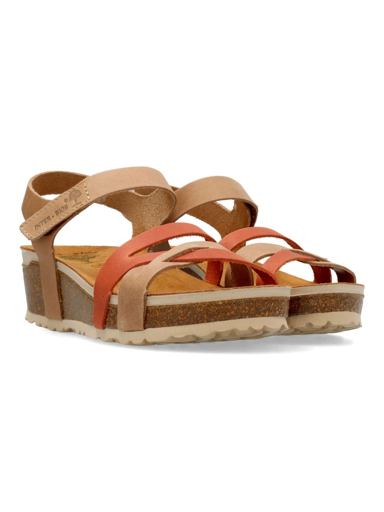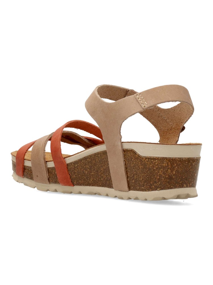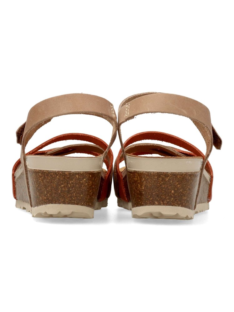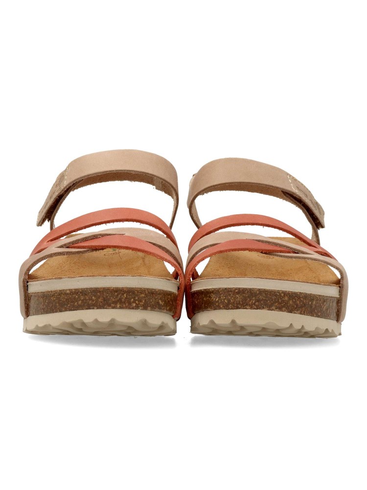 Sandalia cómoda de mujer, fabricada en piel natural. Suela de corcho sobre goma. Altura cuña 4,5 cm. Disponible en color beige-teja. Modelo de tiras cruzadas, con cierre adherente. Ideal para combinar con tus looks de verano. Fabricado en España.